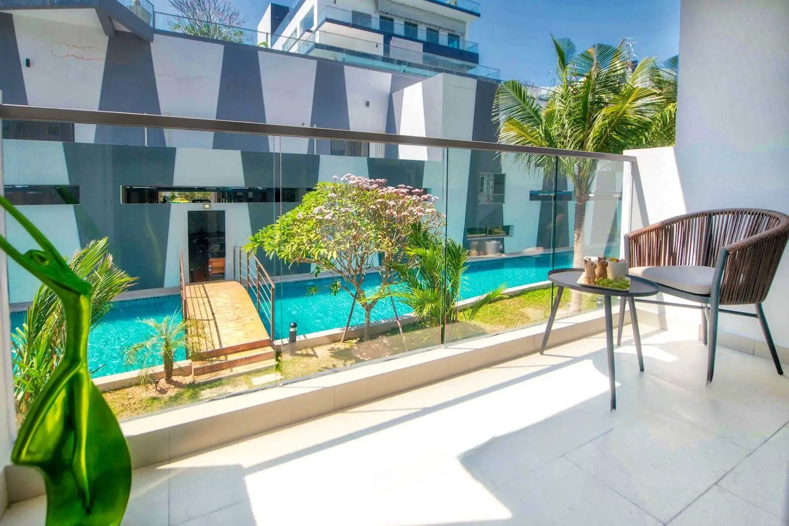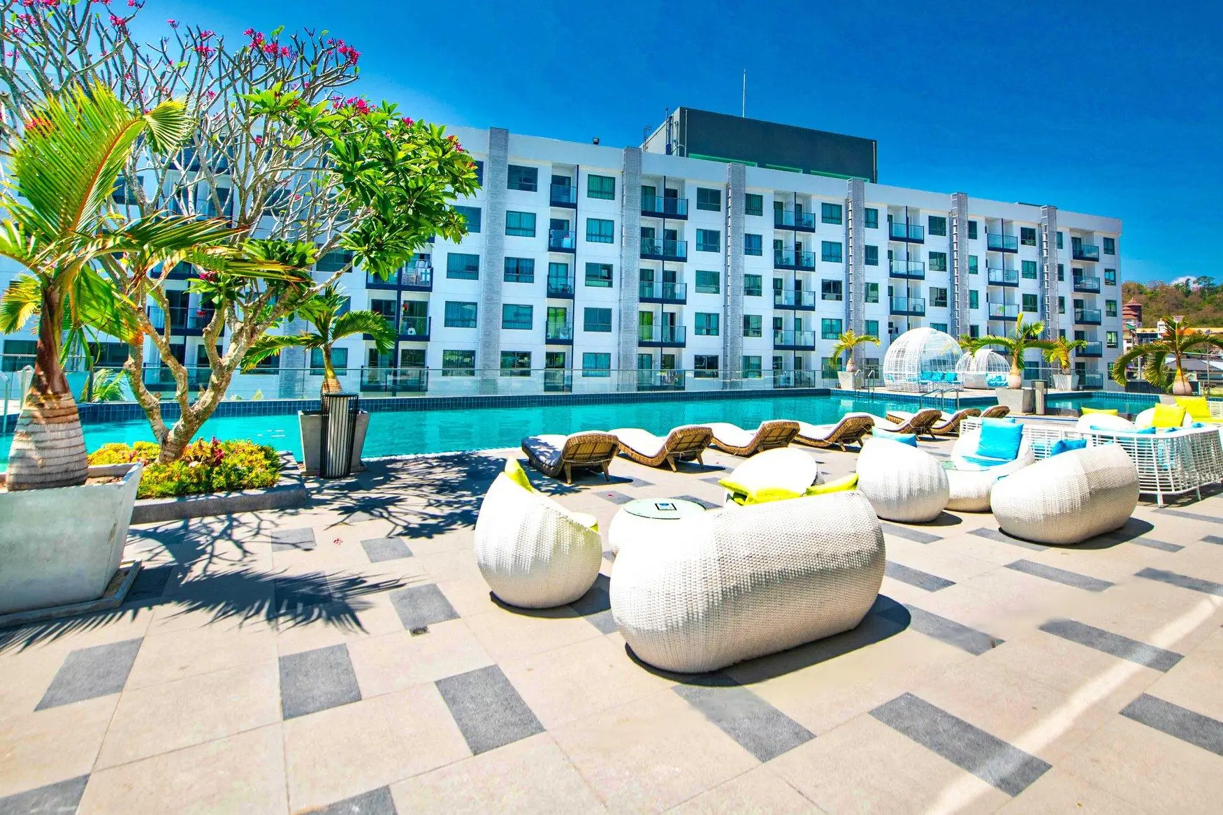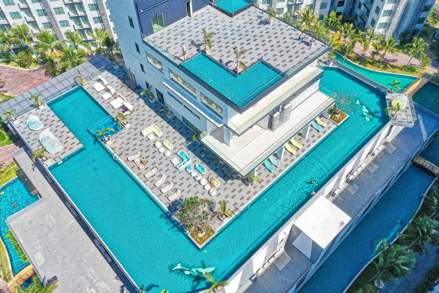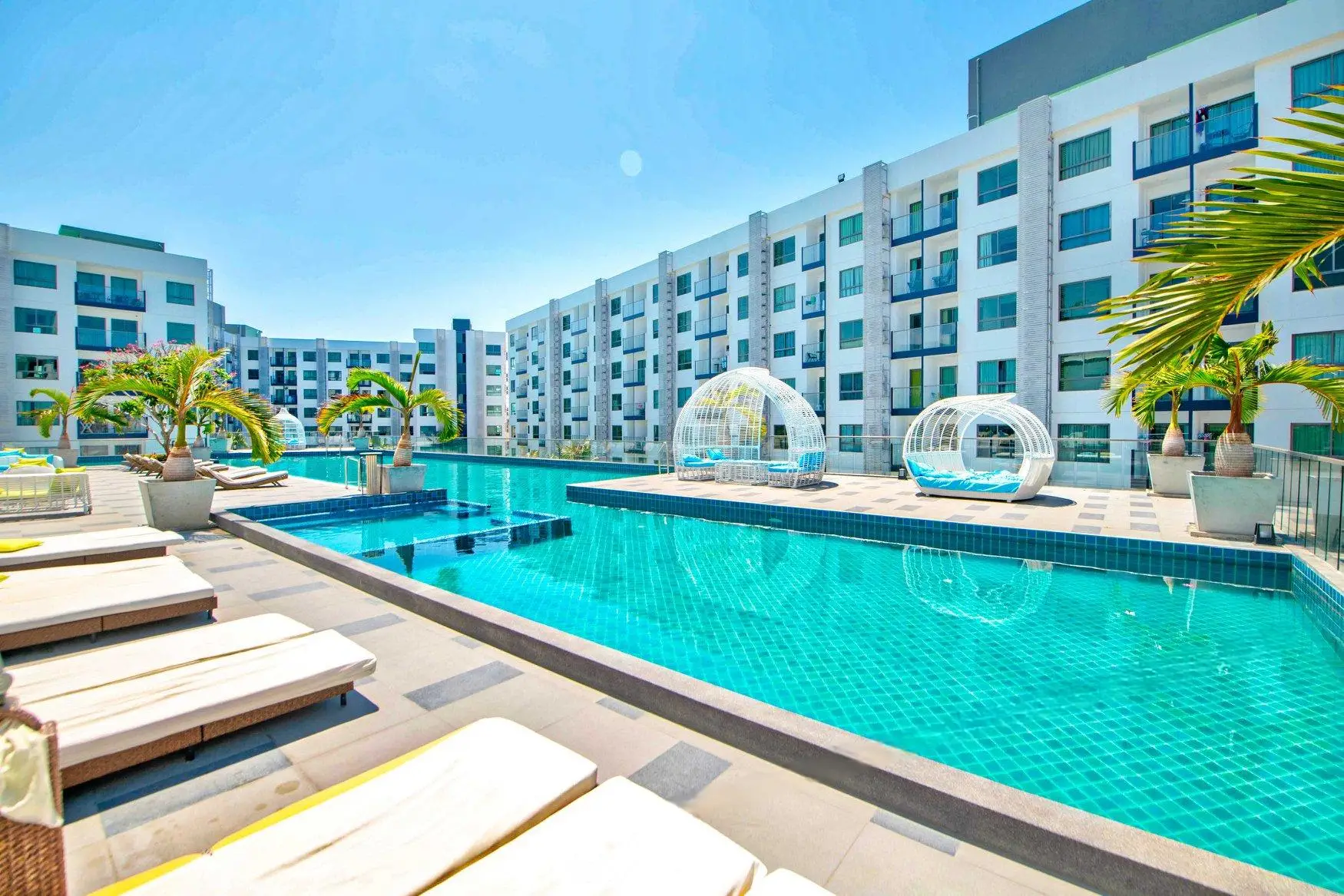 - Масштабная инфраструктура: Два лагунных бассейна (4,000 кв.м) с джакузи, фитнес-центр, спа, детская площадка, ресторан и rooftop-бар с видом на Паттайю.