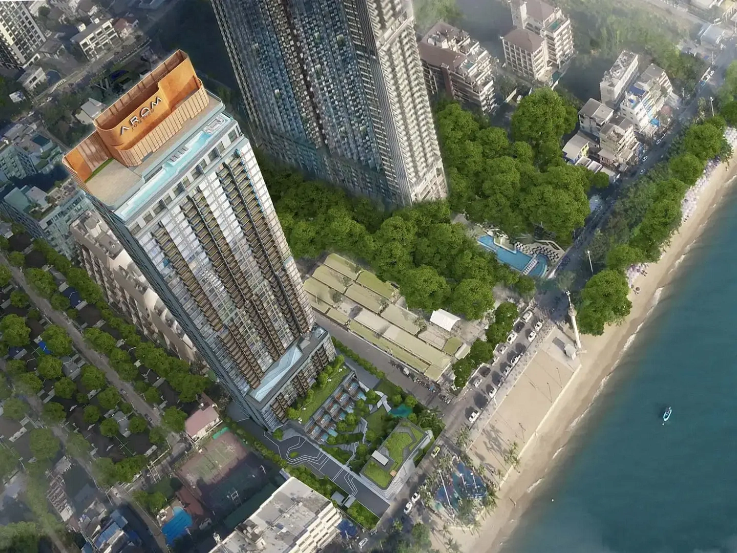 Arom Jomtien — это грандиозный 45-этажный премиальный комплекс (всего 314 эксклюзивных квартир), который является потрясающим воплощением абсолютной гармонии роскоши и природы. Это один из самых стильных и ожидаемых элитных проектов Паттайи на первой береговой линии пляжа Джомтьен! - Каково расстояние от комплекса до пляжа Джомтьен?