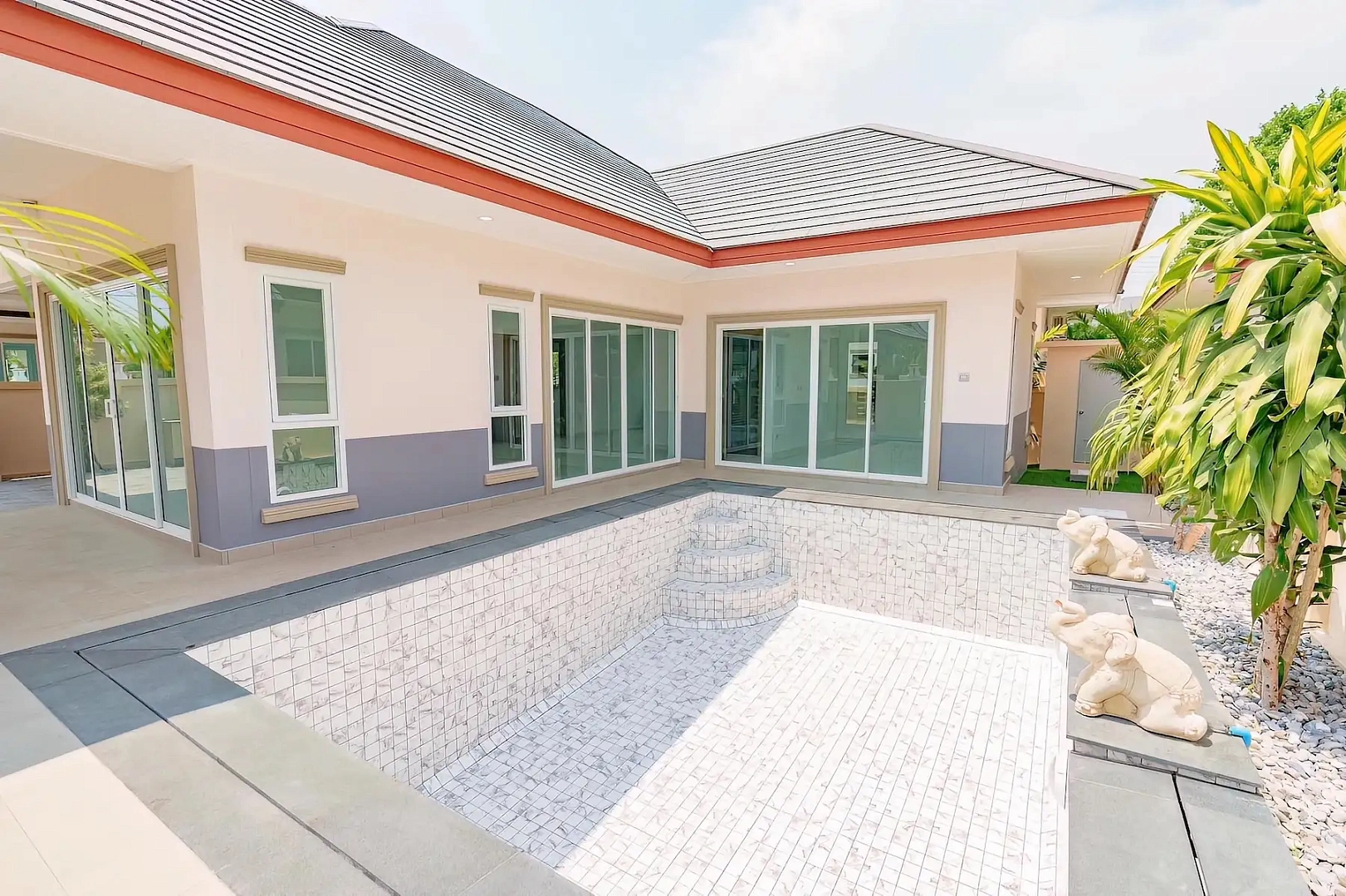 Дом с тремя спальнями в Dusit Garden, район Хуай Яй, Паттайя. Включает три спальни, две ванные, гостиную, кухню, бассейн, сауну, гараж. Полностью меблирован и готов к проживанию.