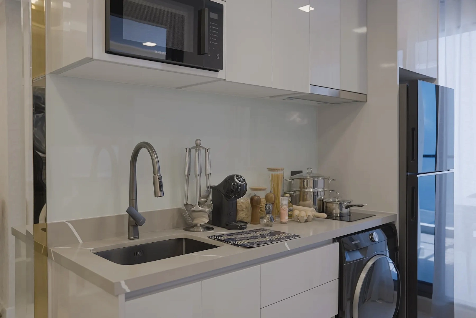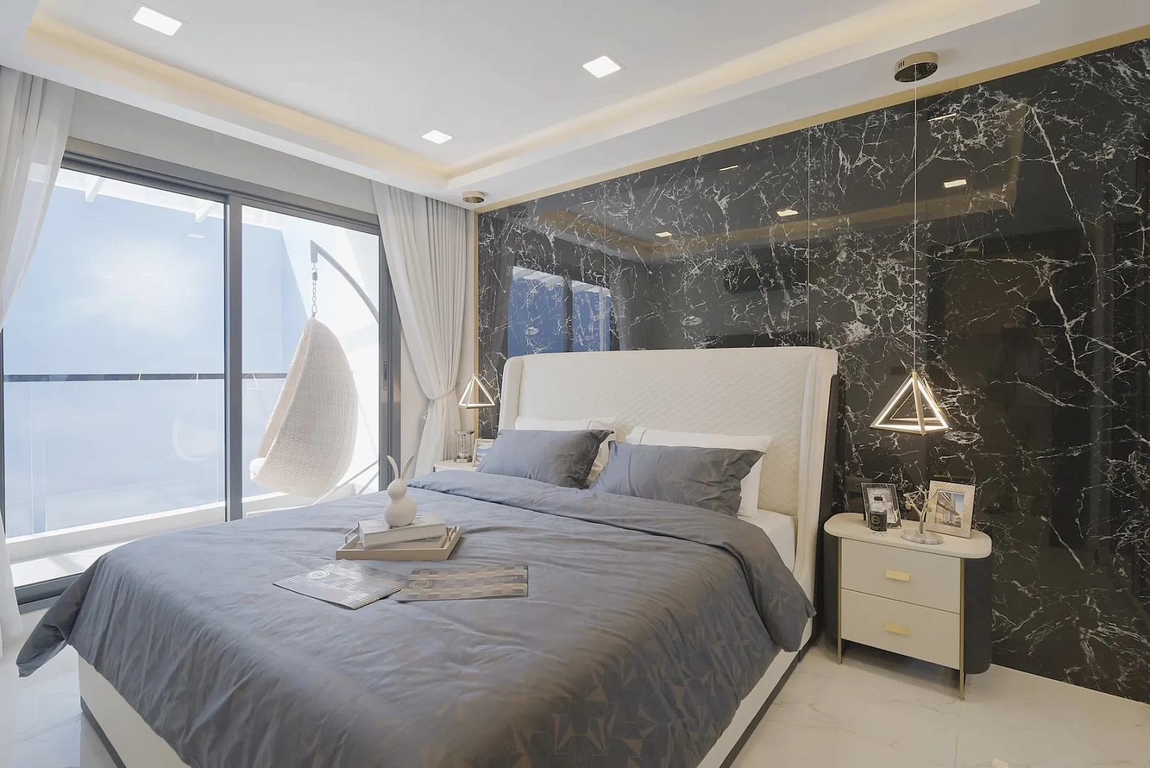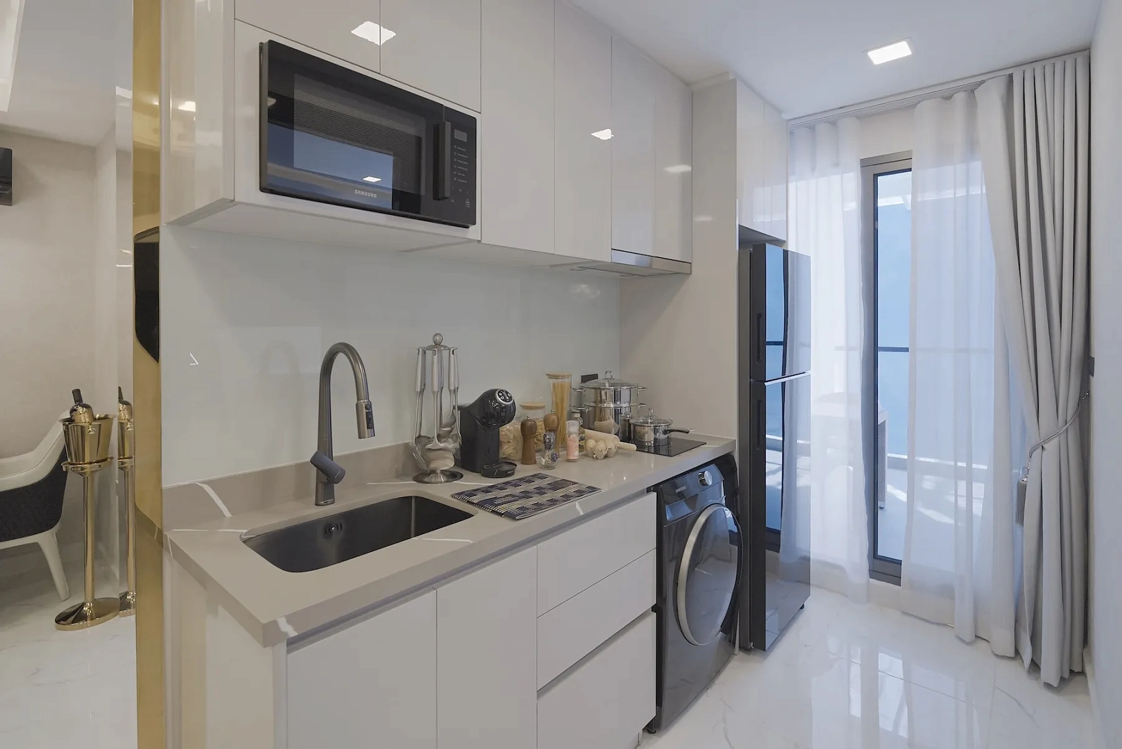 - Премиальный дизайн: Апартаменты с элегантными черными кухнями европейского стандарта, мраморной отделкой и энергоэффективными технологиями созданы для максимального комфорта и статуса.