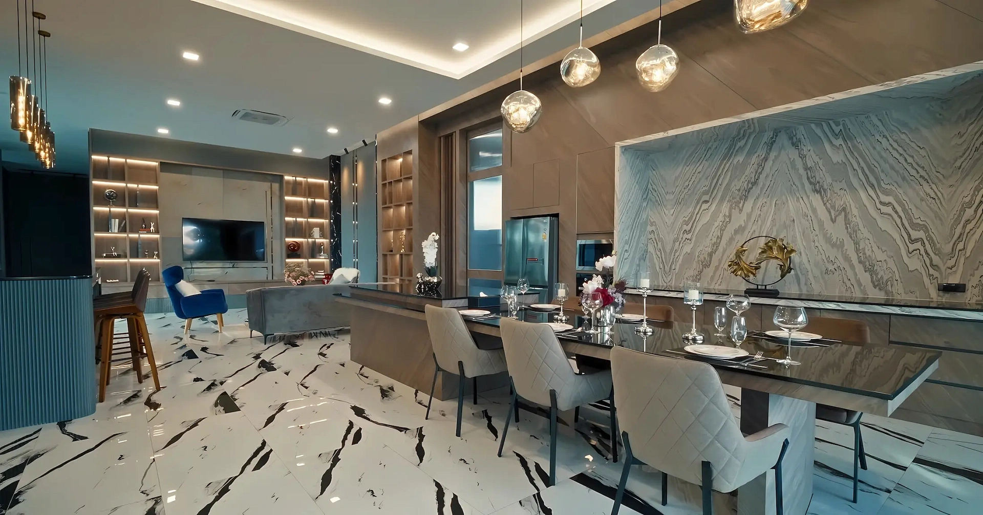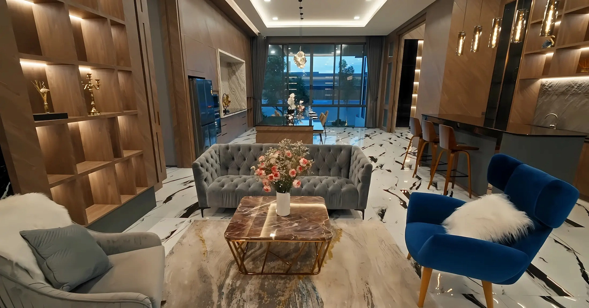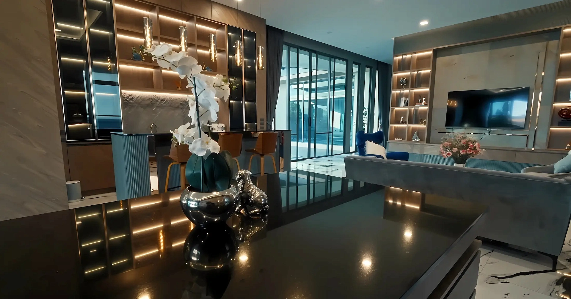 - Функциональная планировка: Вилла с семью спальнями, восемью ванными с джакузи, высокими потолками 5 м, двумя гостевыми залами, тремя кухнями, балконом с видом, бассейном, зонами барбекю и отдыха, оснащена видеонаблюдением.