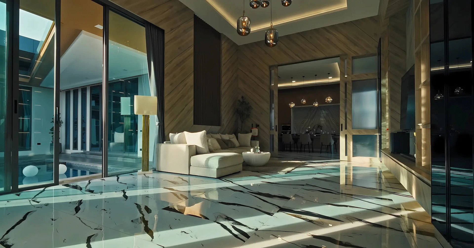 Особенности: Высокие потолки 5 м, два гостевых зала, три кухни, балкон с видом, бассейн, зоны для барбекю и отдыха, видеонаблюдение, подходит для жизни с питомцами