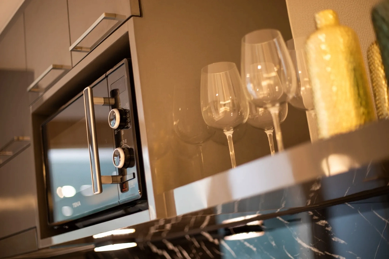 - Встроенная кухня с базовой техникой (плита и вытяжка)