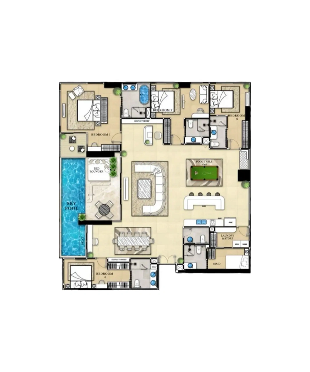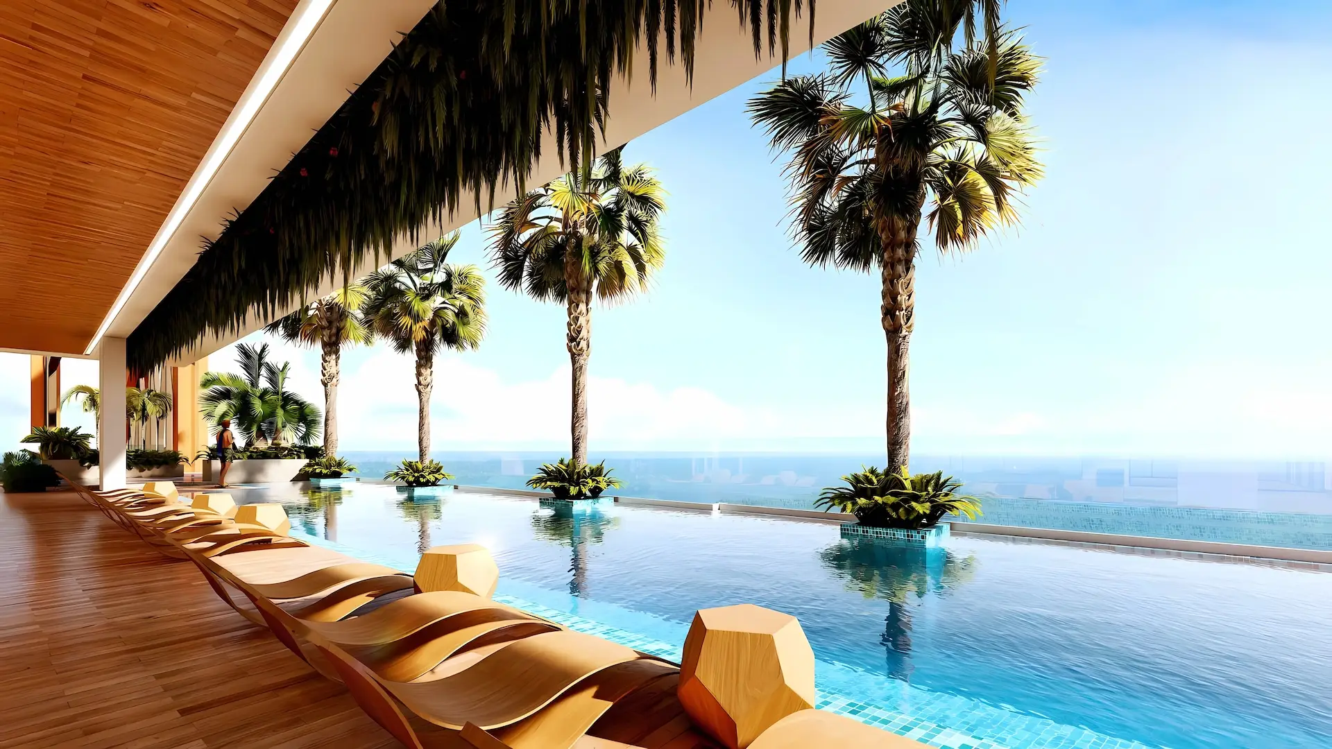 - Пятизвездочные удобства: 20-метровый скай-пул с джакузи, гольф-симулятор, лаундж на 28-м этаже, фитнес-центр с кардио- и силовыми зонами, а также доступ к услугам отеля, включая консьерж-сервис и рестораны.