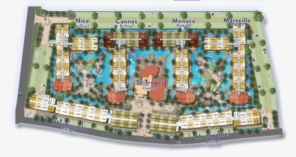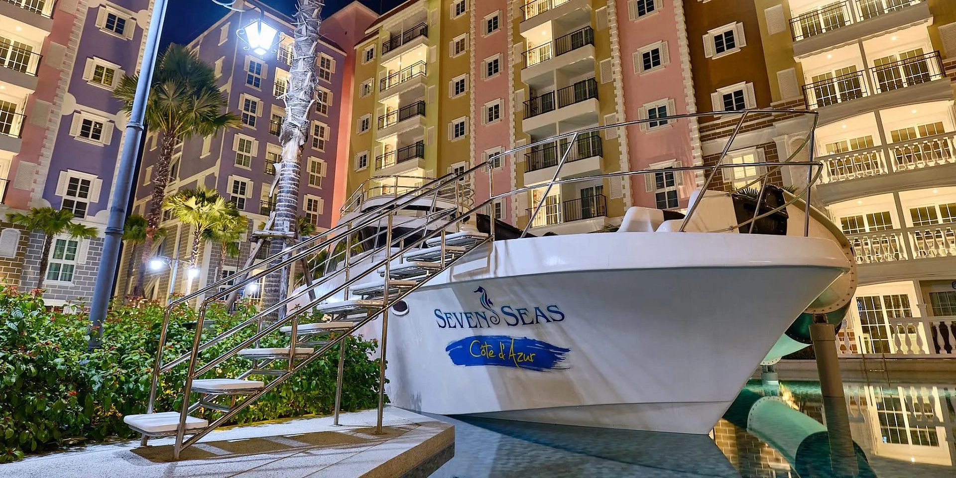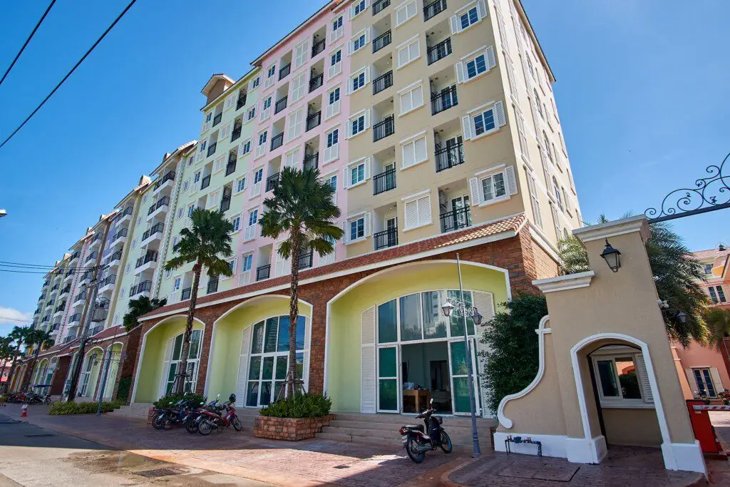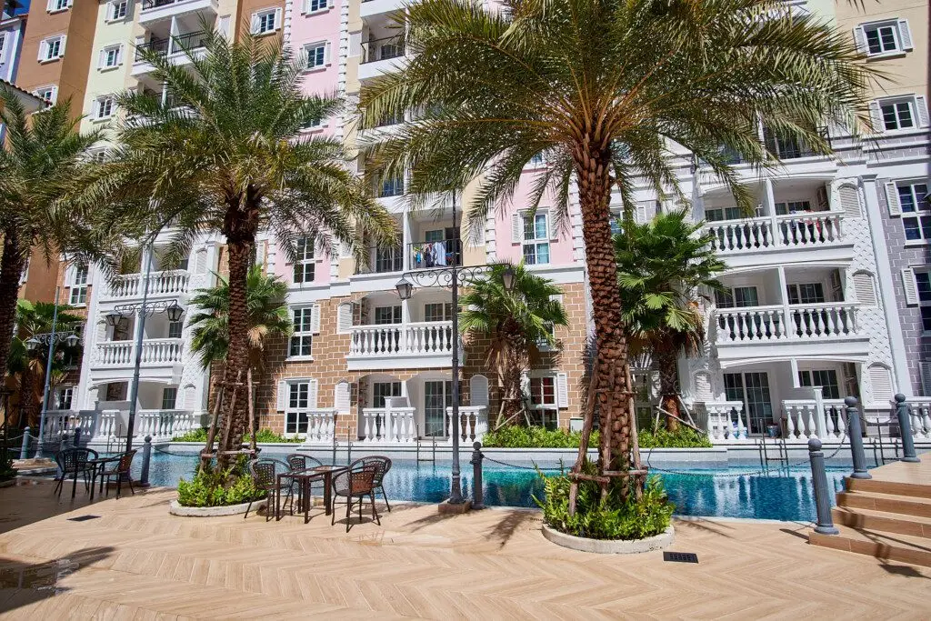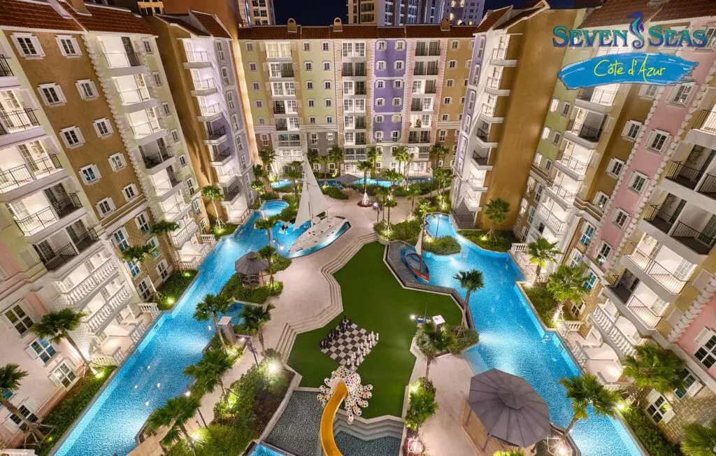 Seven Seas Côte d’Azur — это потрясающий концептуальный резорт-комплекс (6 зданий по 8 этажей, 1 308 квартир), полностью стилизованный под роскошное Французское Средиземноморье (Лазурный берег)! Это абсолютно уникальное курортное жилье на На Джомтьен с гигантскими бассейнами и великолепной архитектурой. -