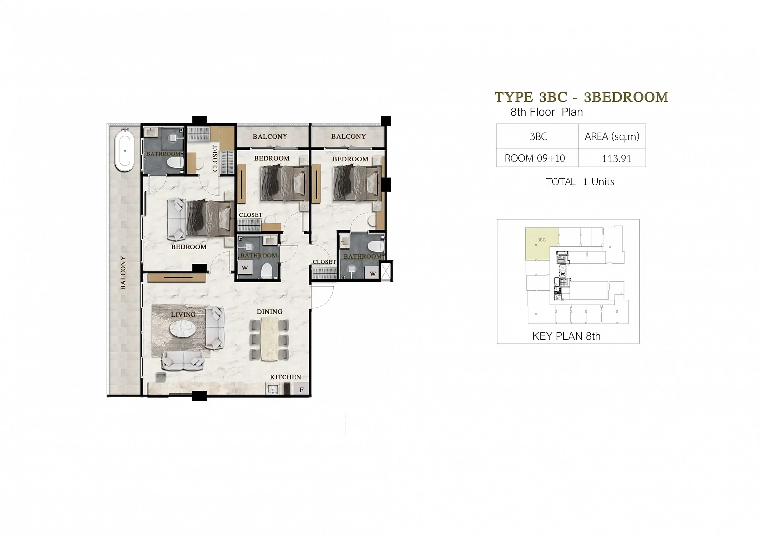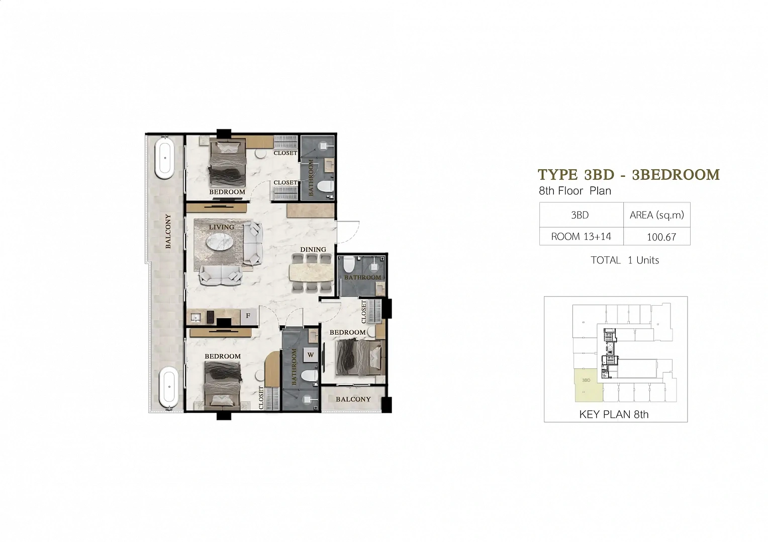 Большая 3-комнатная квартира площадью от 58 до 69 м² в современном жилом комплексе Siam Oriental Beach. Редкое предложение для тех, кто ищет максимальный простор и функциональность. Всего 400 метров до моря — элитная локация в самом сердце Пратамнака для тех, кто ценит статусную недвижимость в Паттайе.