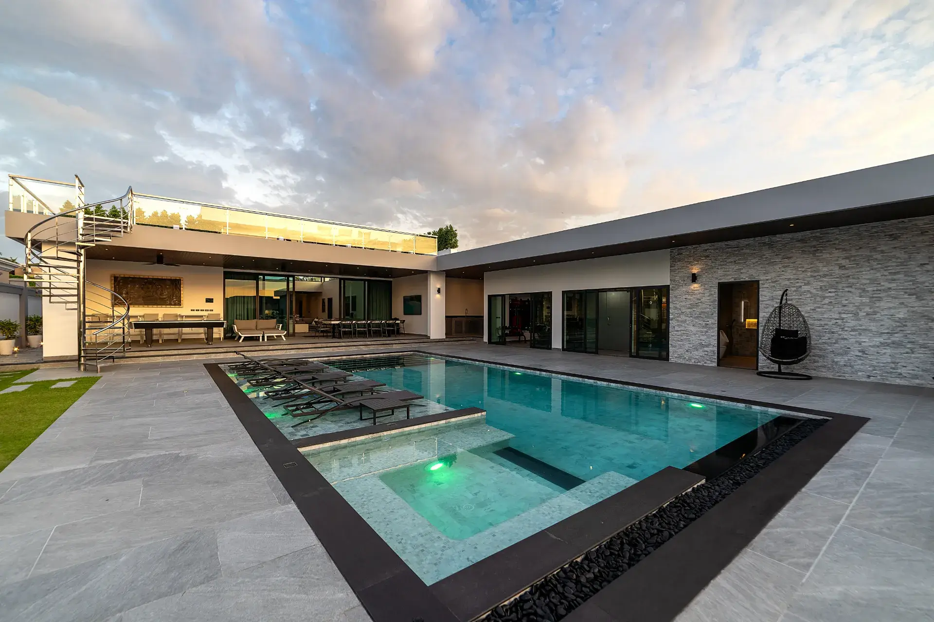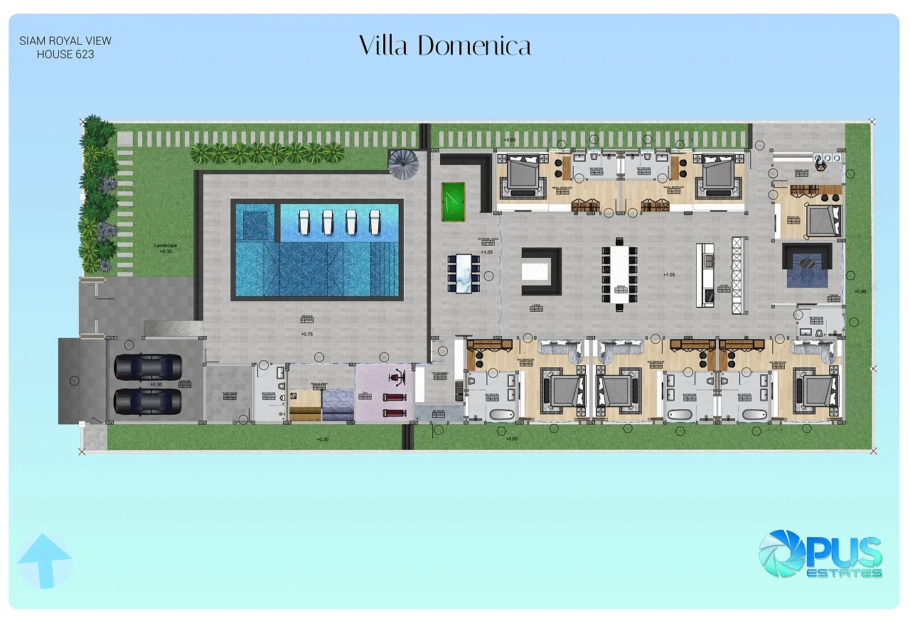 Villa Domenica — это премиальный особняк на престижном высоком холме (жилая площадь 845 м² на огромном участке 1050 м²), расположенный в закрытом VIP-поселке Siam Royal View. Эта вилла включает в себя 6 роскошных спален с ванными и джакузи, потрясающий 12-метровый мраморный бассейн и впечатляющий атриум. - Какими уникальными удобствами обладает этот особняк?