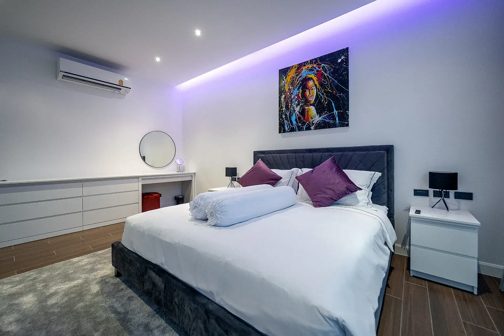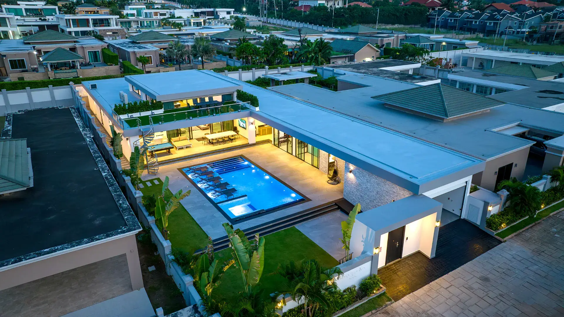 - Продуманная планировка: Вилла с шестью спальнями, светлым атриумом, кухней в стиле MasterChef, шестью ванными с джакузи, 12-метровым мраморным бассейном, кинозалом, фитнес-залом, сауной, бильярдной и террасой с видом на океан.