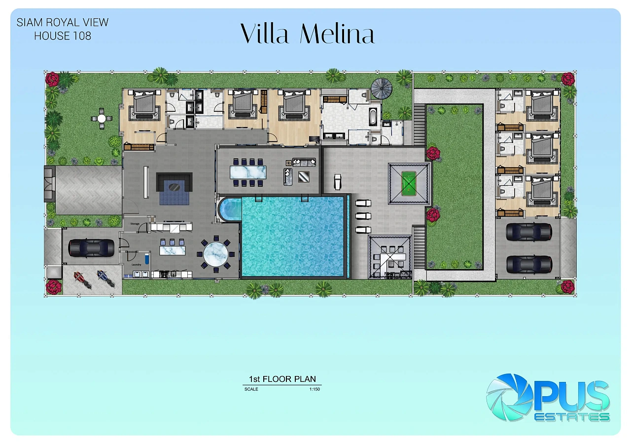 Villa Melina — это грандиозная статусная вилла жилой площадью 866 м² (на участке 1050 м²) на территории премиального закрытого поселка Siam Royal View. Она впечатляет 6 роскошными спальнями с гардеробными, гостиной с невероятным атриумом и потрясающим 100-метровым мраморным бассейном-инфинити с зоной джакузи! - Каким эксклюзивным оснащением выделяется данный роскошный особняк?