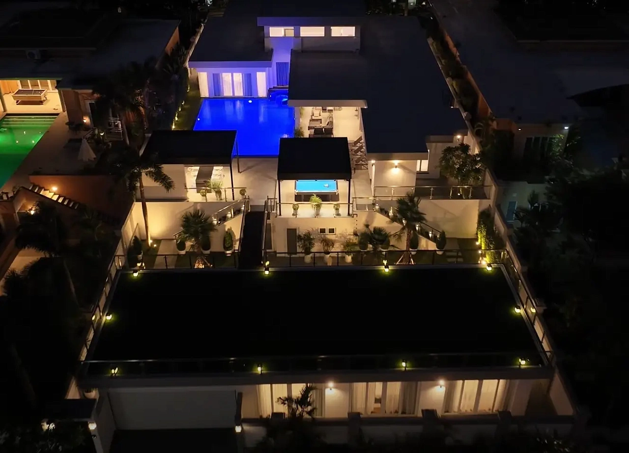 - Функциональная планировка: Вилла с шестью спальнями, гостиной с атриумом, кухней в стиле MasterChef, пятью ванными, мраморным бассейном 100 м² с джакузи, террасой на крыше, фитнес-залом, сауной, зоной барбекю, системой "умный дом" и видеонаблюдением.