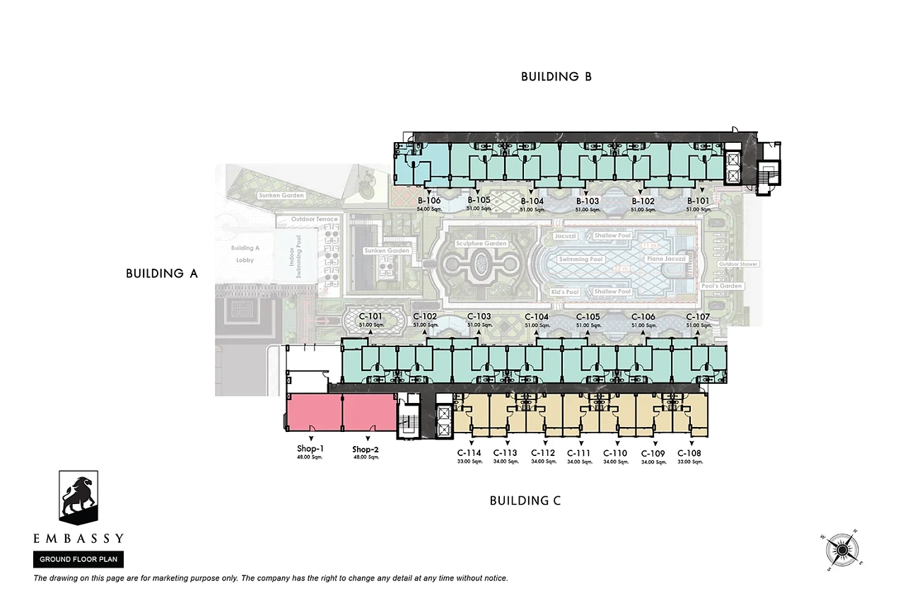 Embassy Pattaya — это потрясающий абсолютно новый современный жилой комплекс (состоящий из 3 зданий по 8 этажей, всего 474 квартиры), строящийся в невероятно популярном туристическом районе Джомтьен! Это самый настоящий магнит для туристов, предлагающий высочайший арендный и инвестиционный потенциал. -