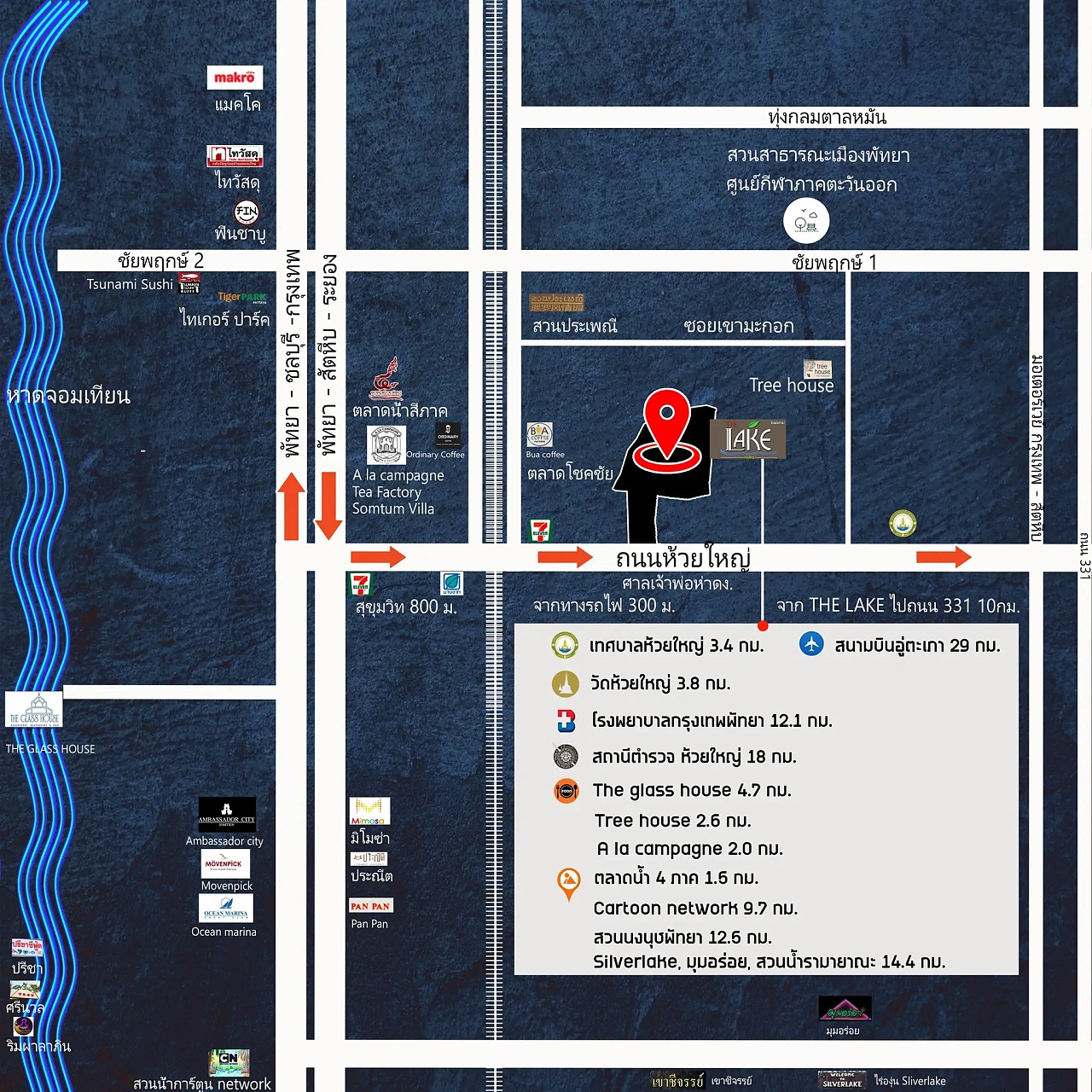 - Стратегическое расположение: В 3 км от моря (5-10 минут на автомобиле), рядом с супермаркетами (Seven-Eleven, Mini Big C, Lotus), достопримечательностями (плавучий рынок, Silverlake, пляж Джомтьен) и ресторанами (Glass House, A La Campagne).