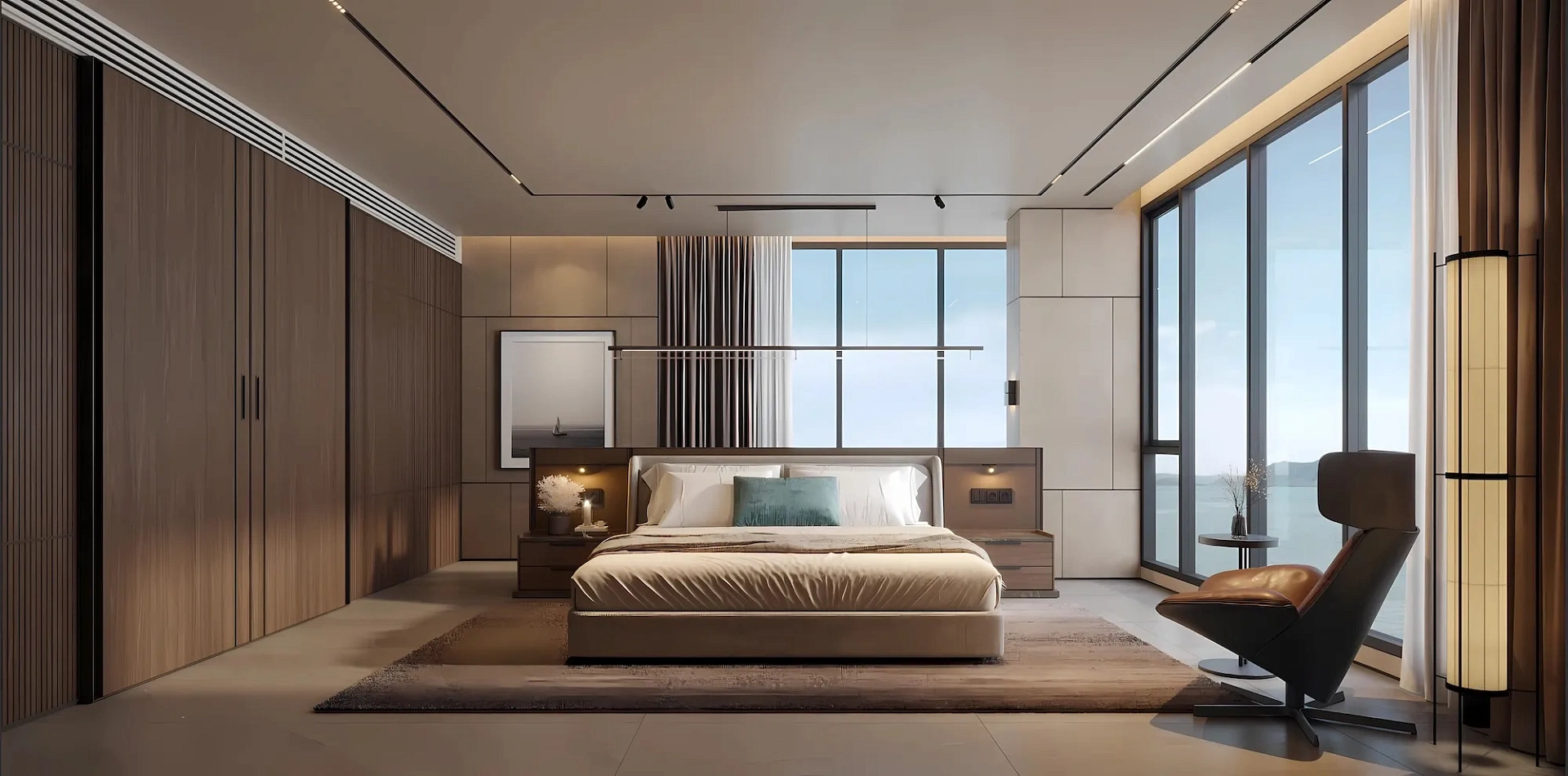 - Роскошная кровать King или Queen Size (в зависимости от типа апартаментов) с премиальным постельным бельём и подушками