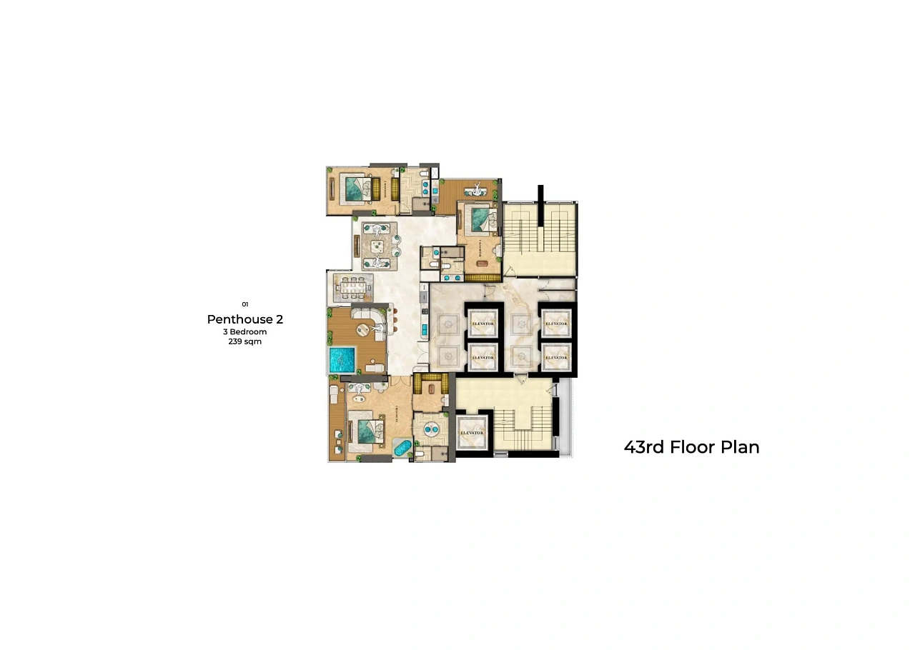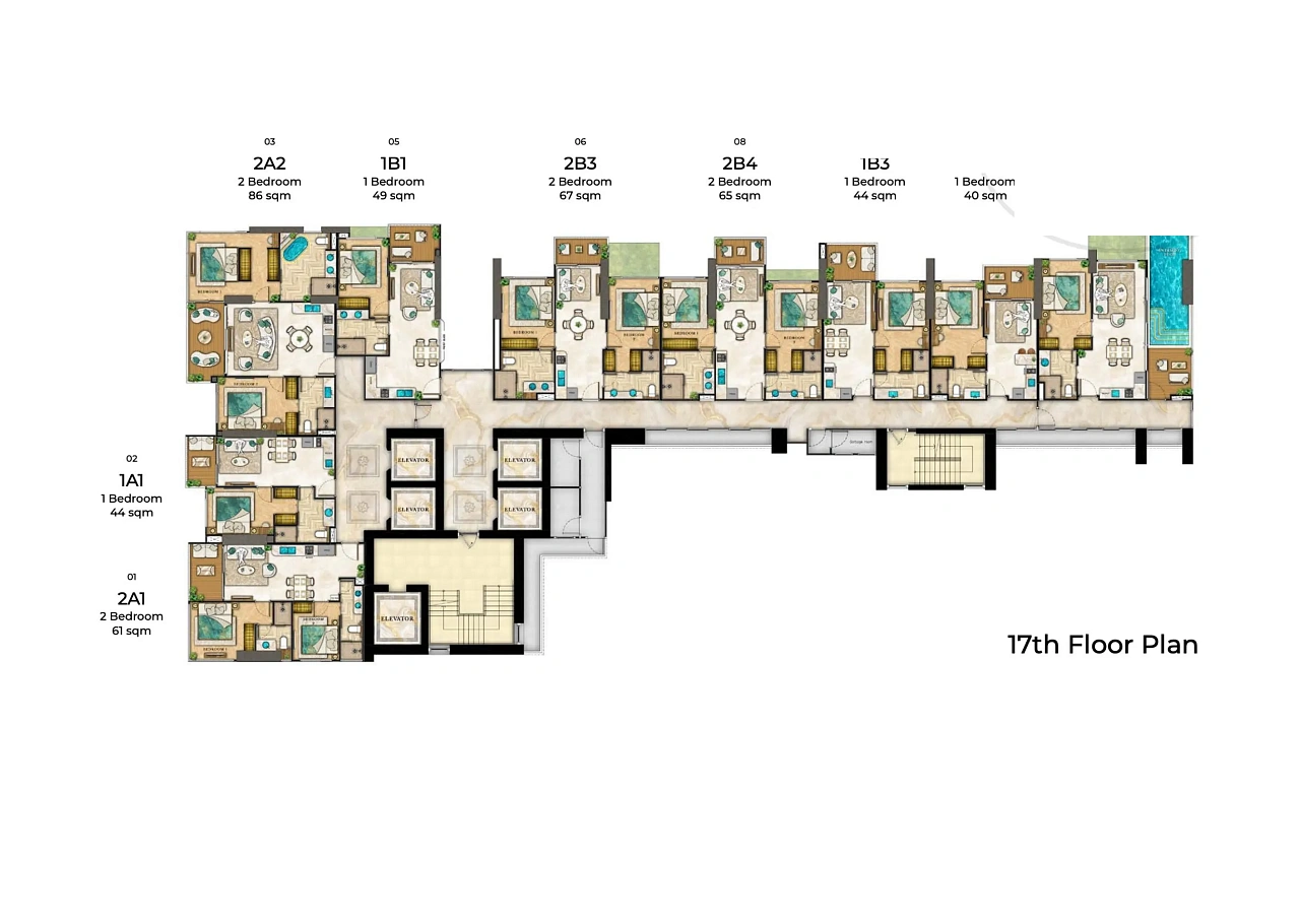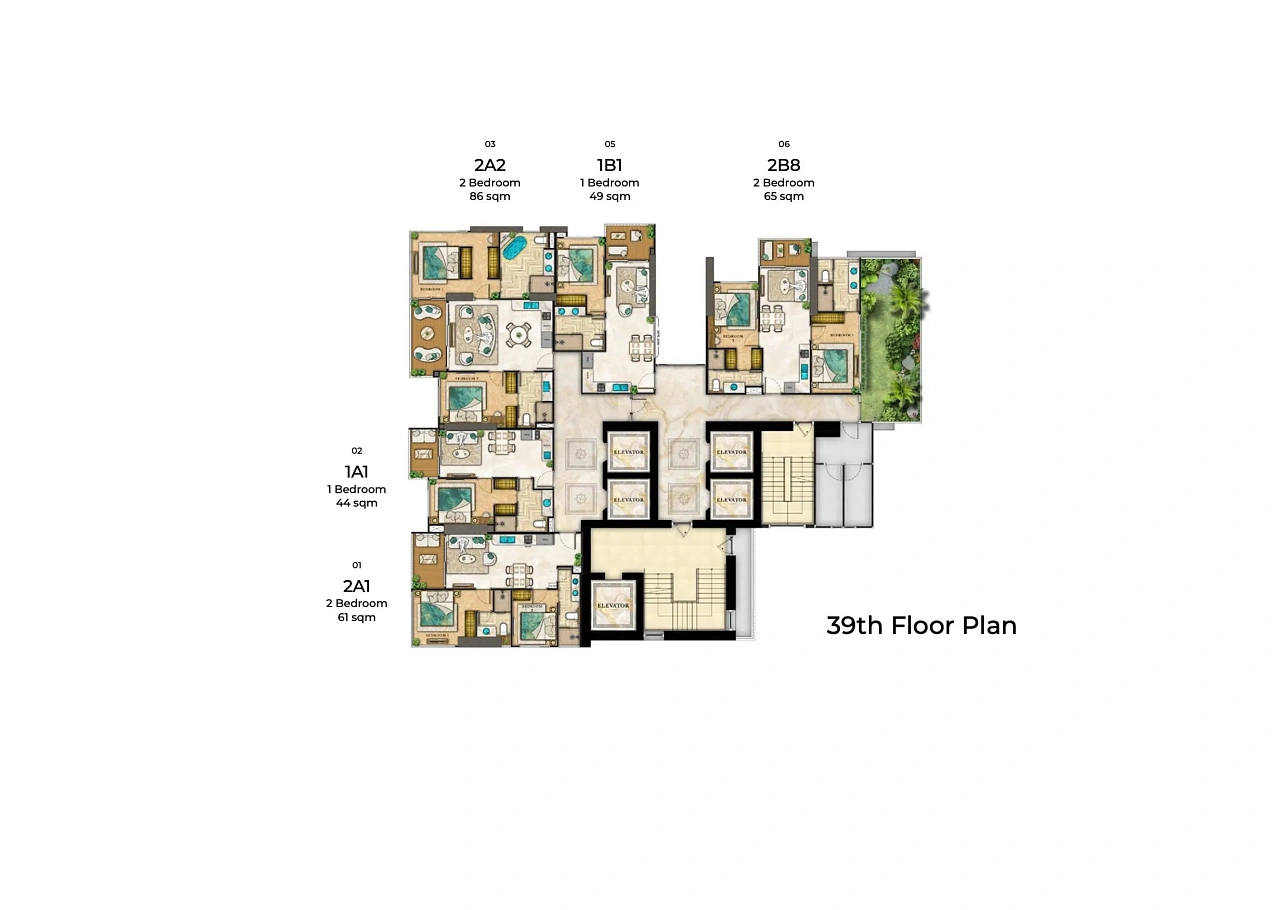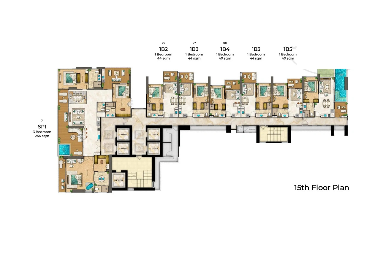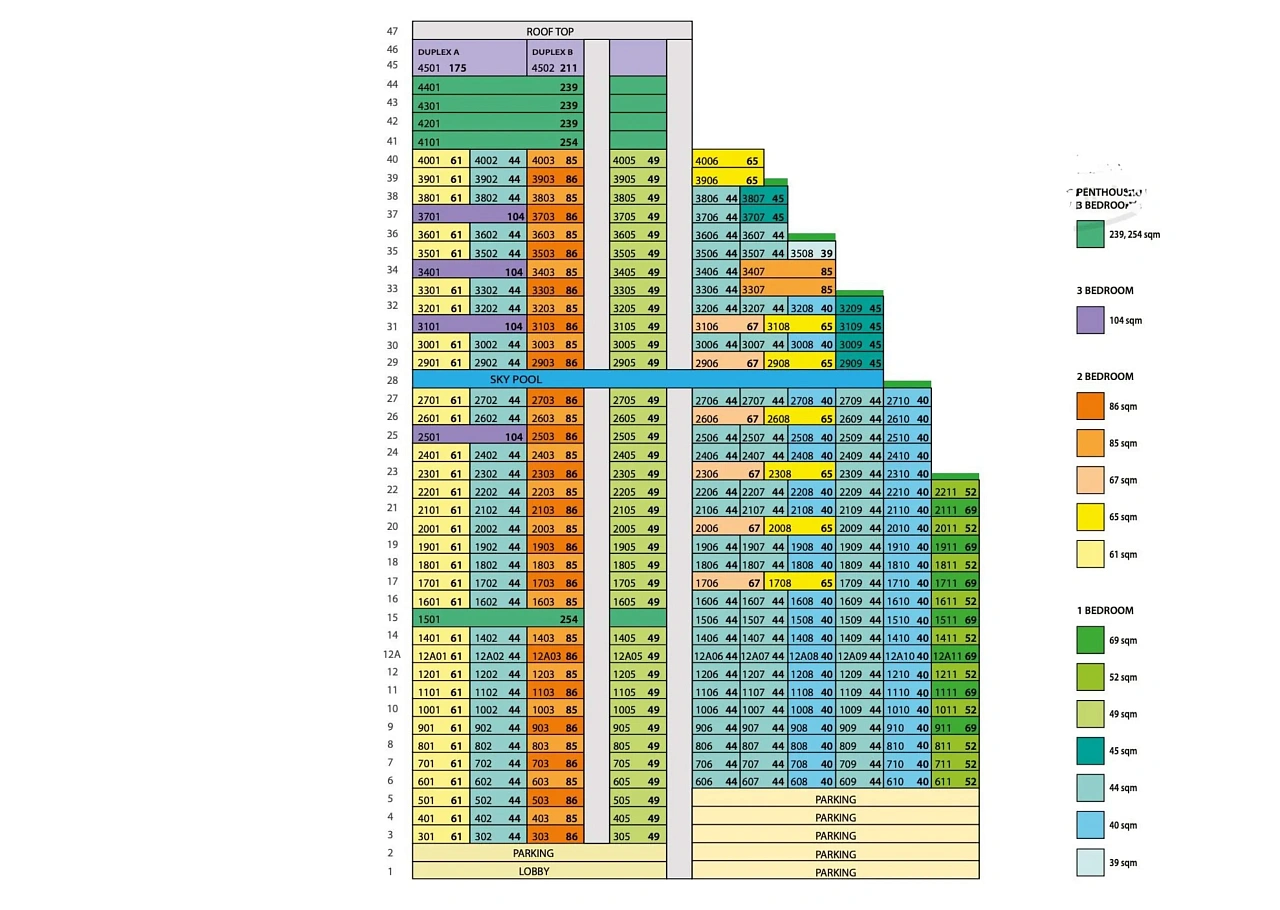 Апартаменты: 298 резиденций (1–3 спальни, дуплексы, пентхаусы от 39 до 295 м²)