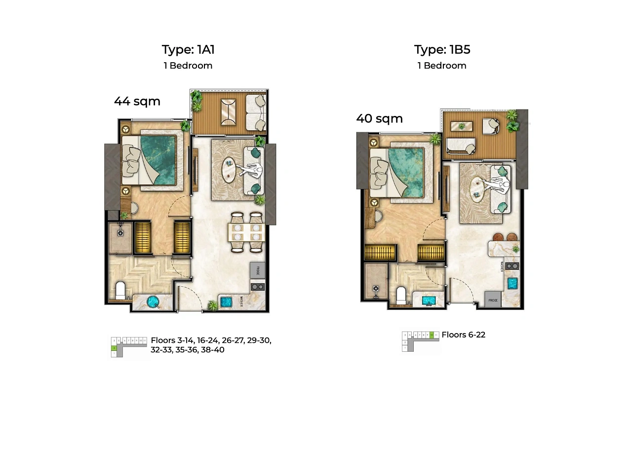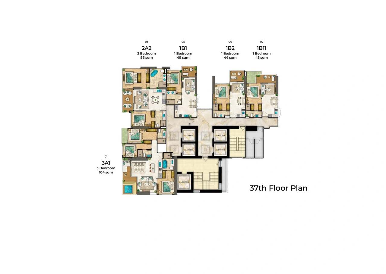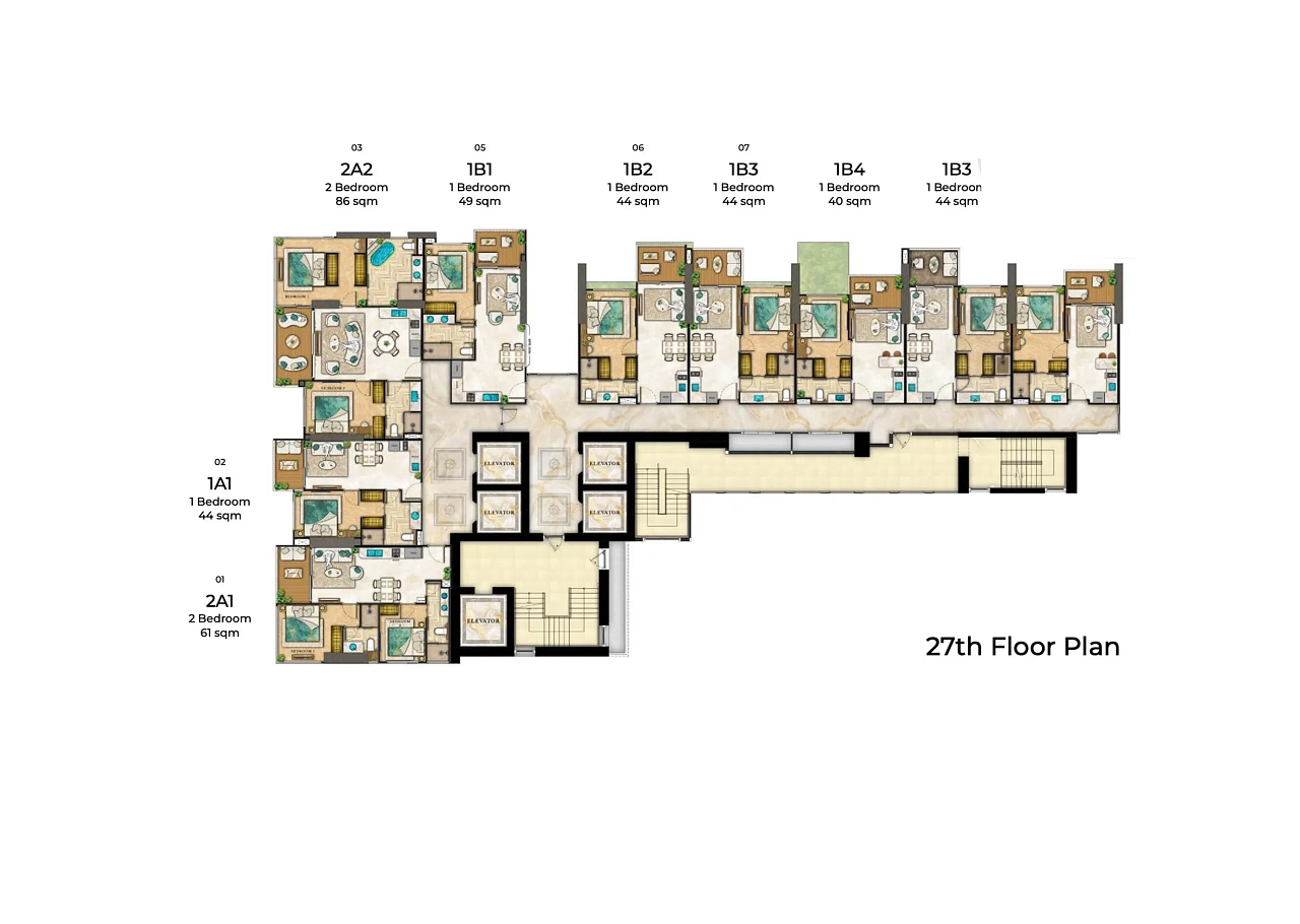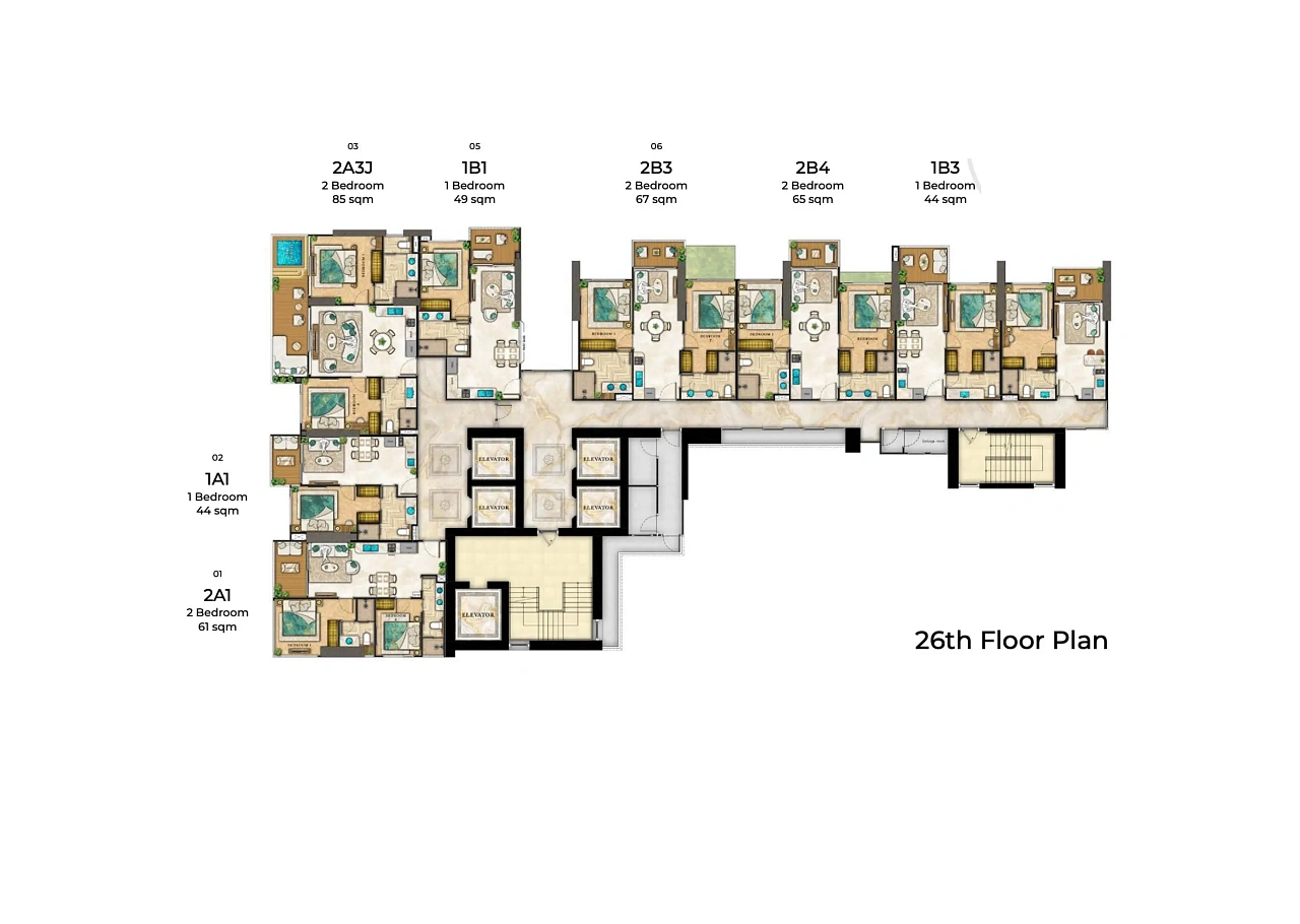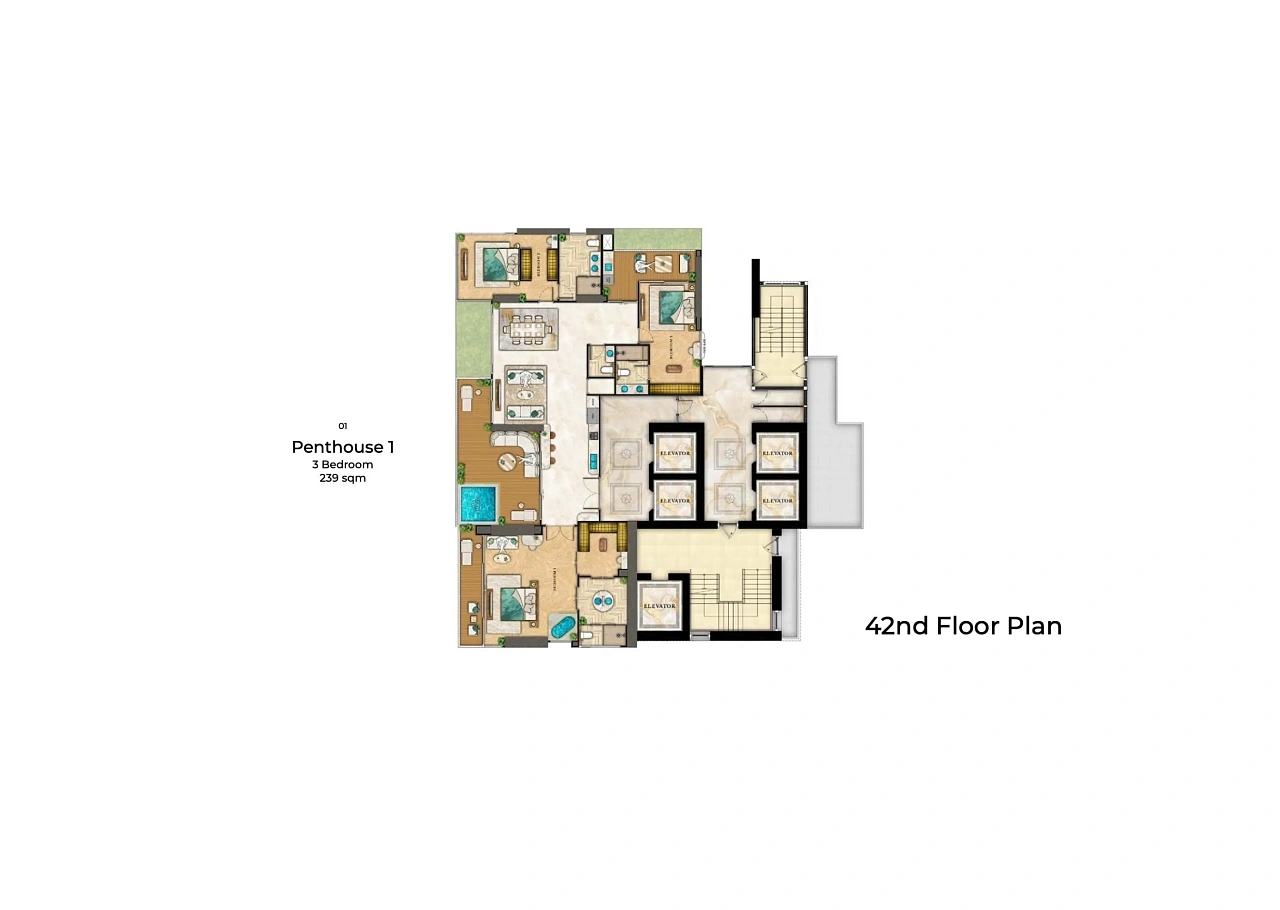 Апартаменты: 298 резиденций (1–3 спальни, дуплексы, пентхаусы от 39 до 295 м²)
