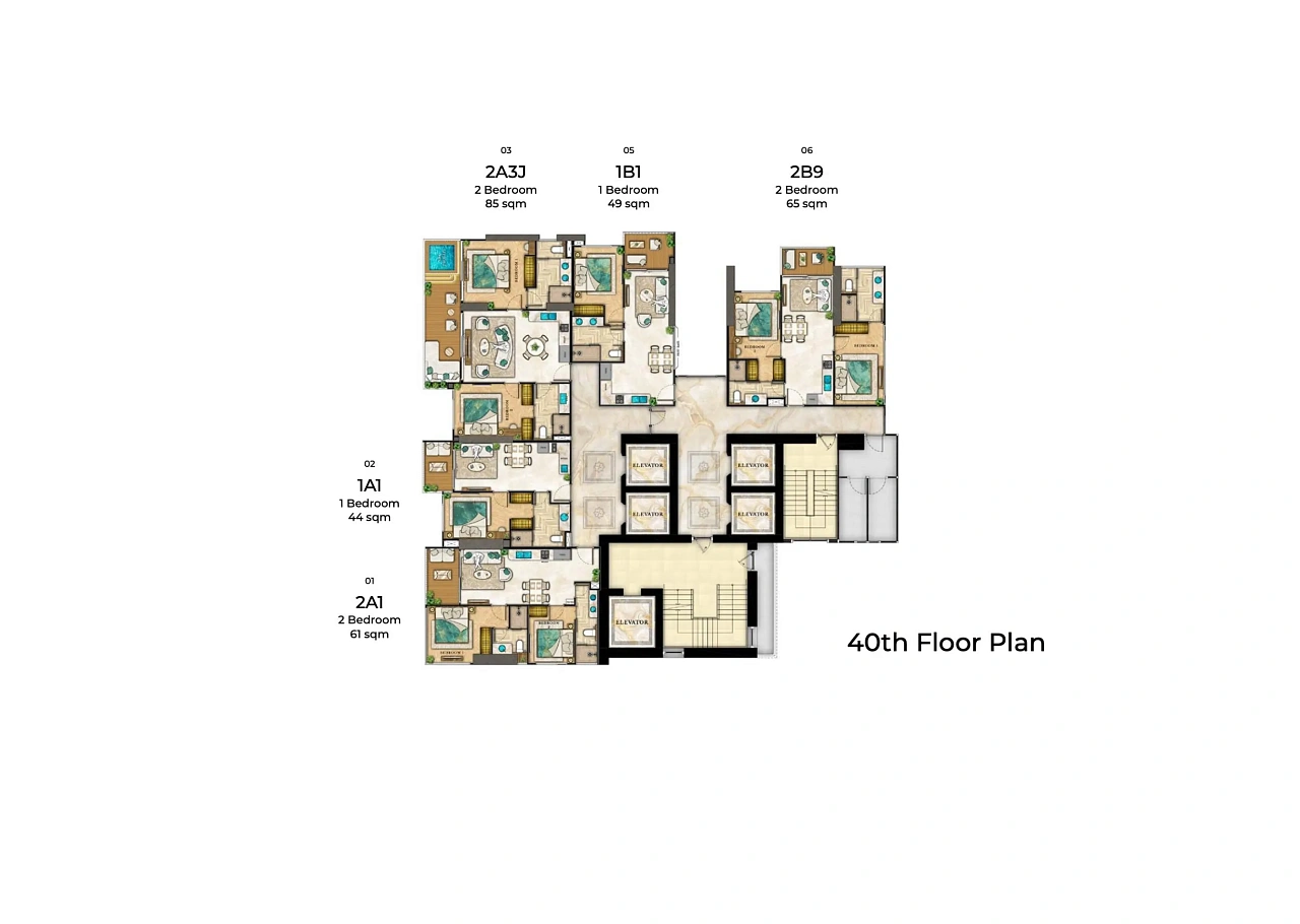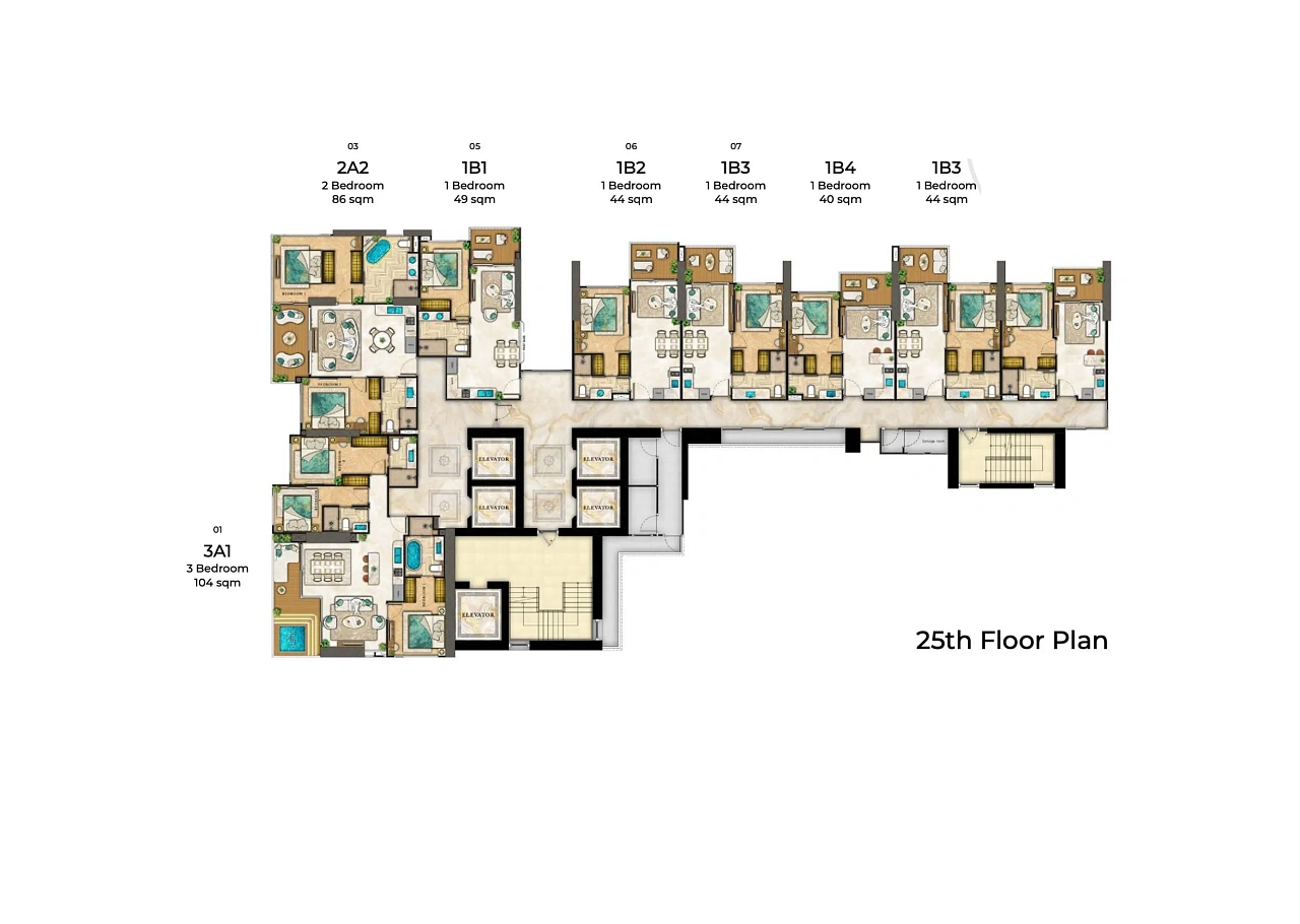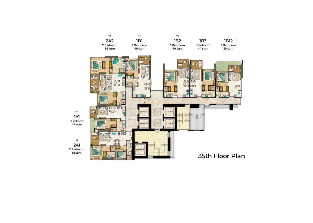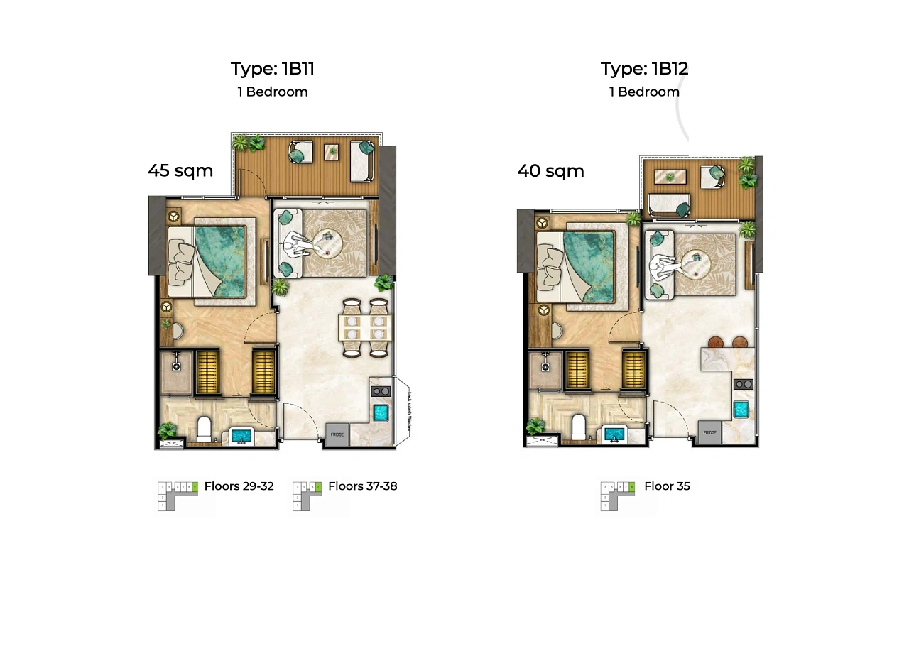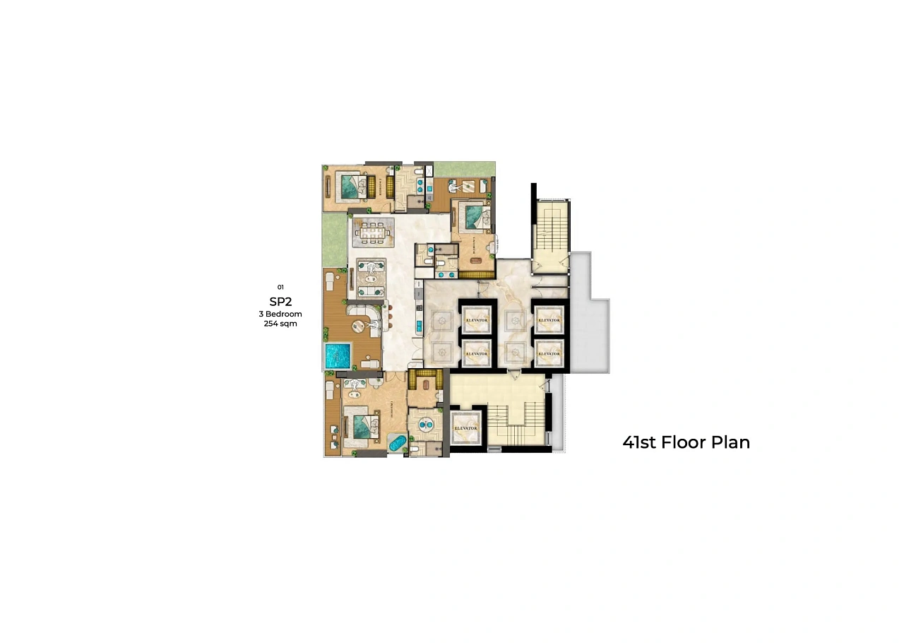 Апартаменты: 298 резиденций (1–3 спальни, дуплексы, пентхаусы от 39 до 295 м²)