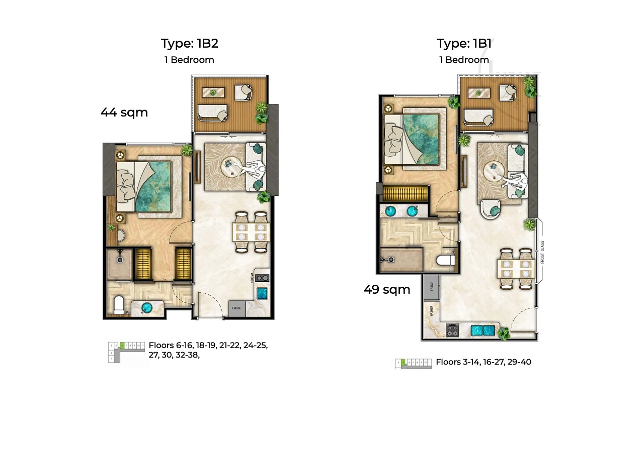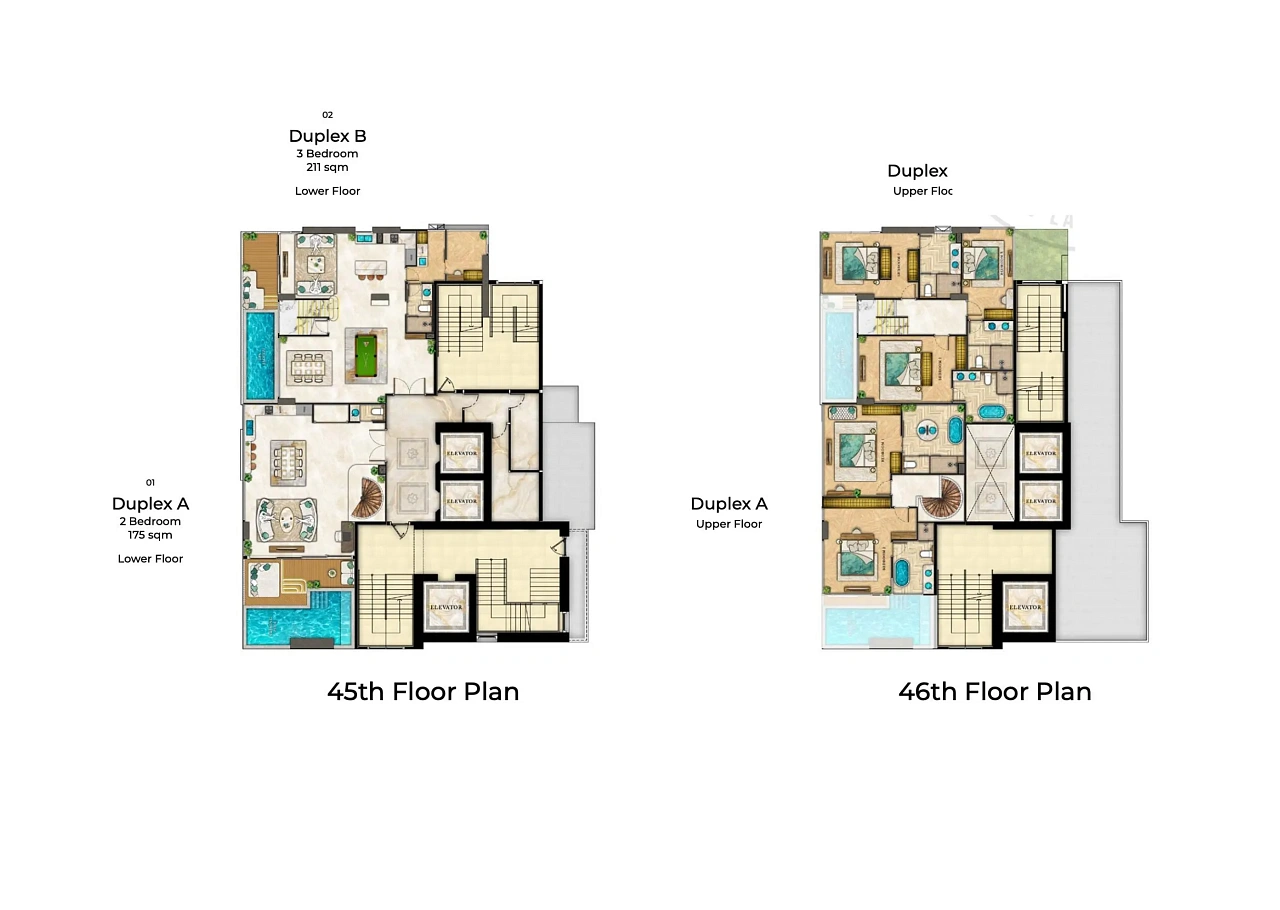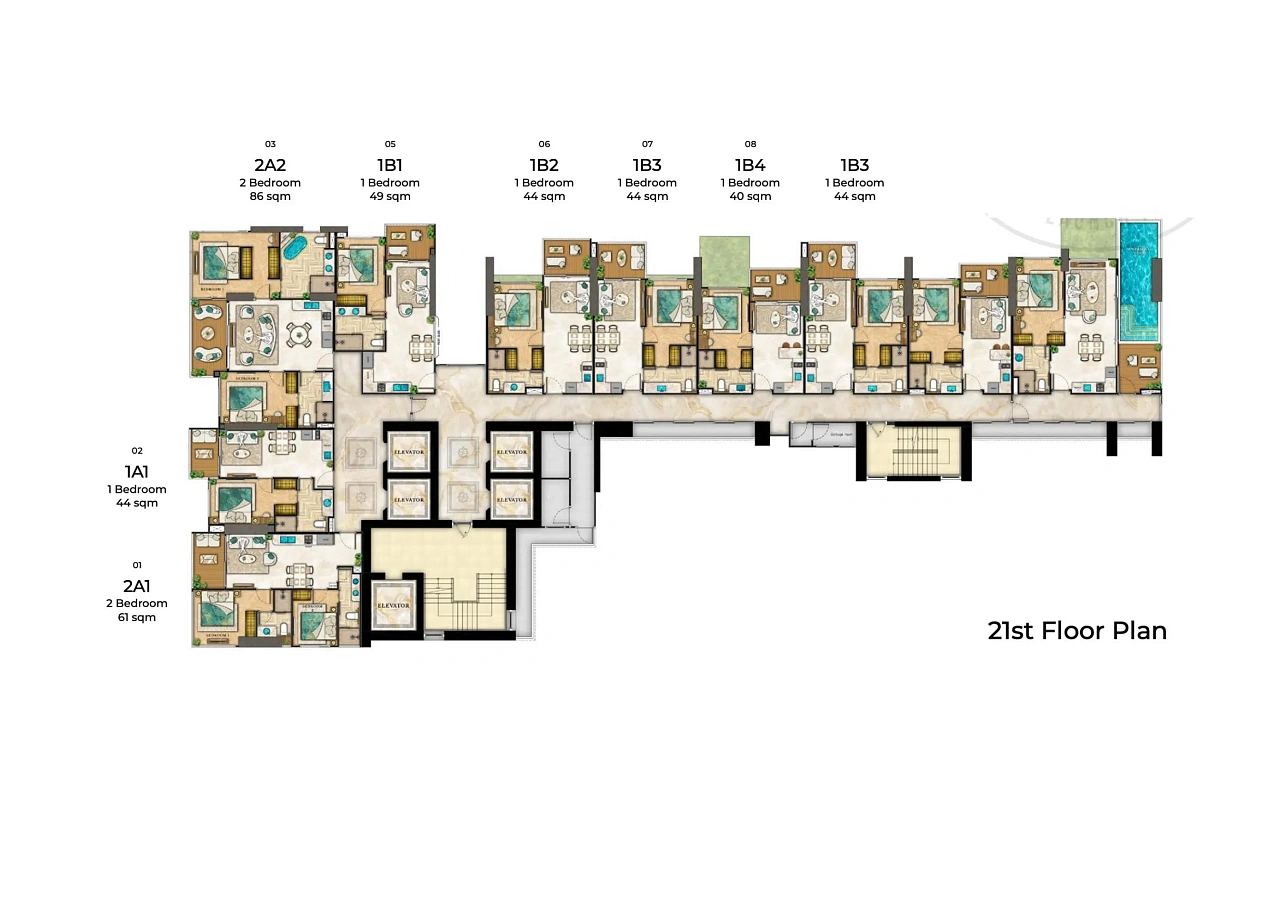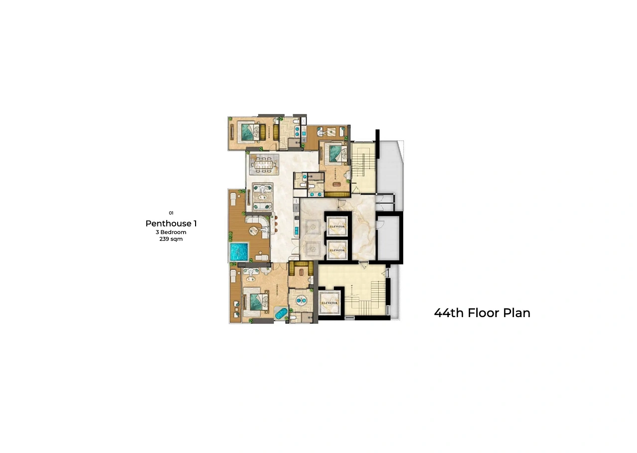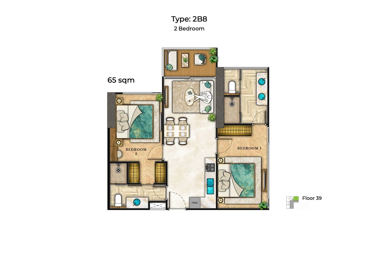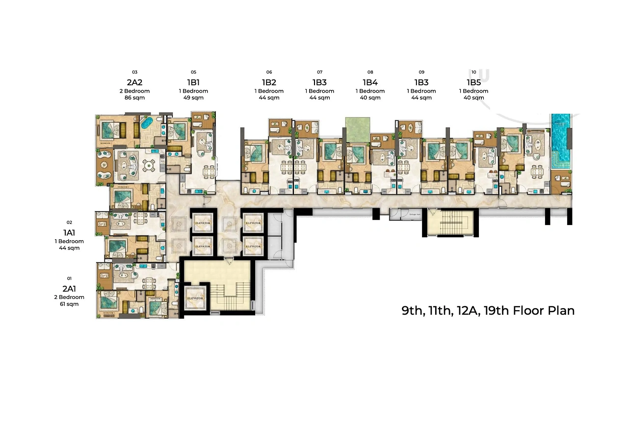 Апартаменты: 298 резиденций (1–3 спальни, дуплексы, пентхаусы от 39 до 295 м²)