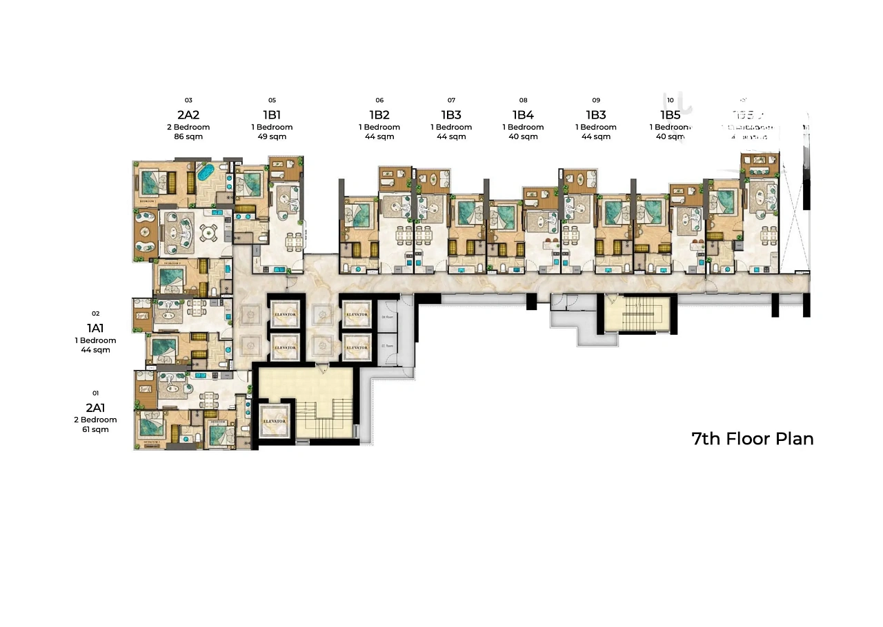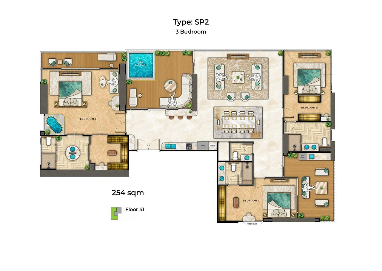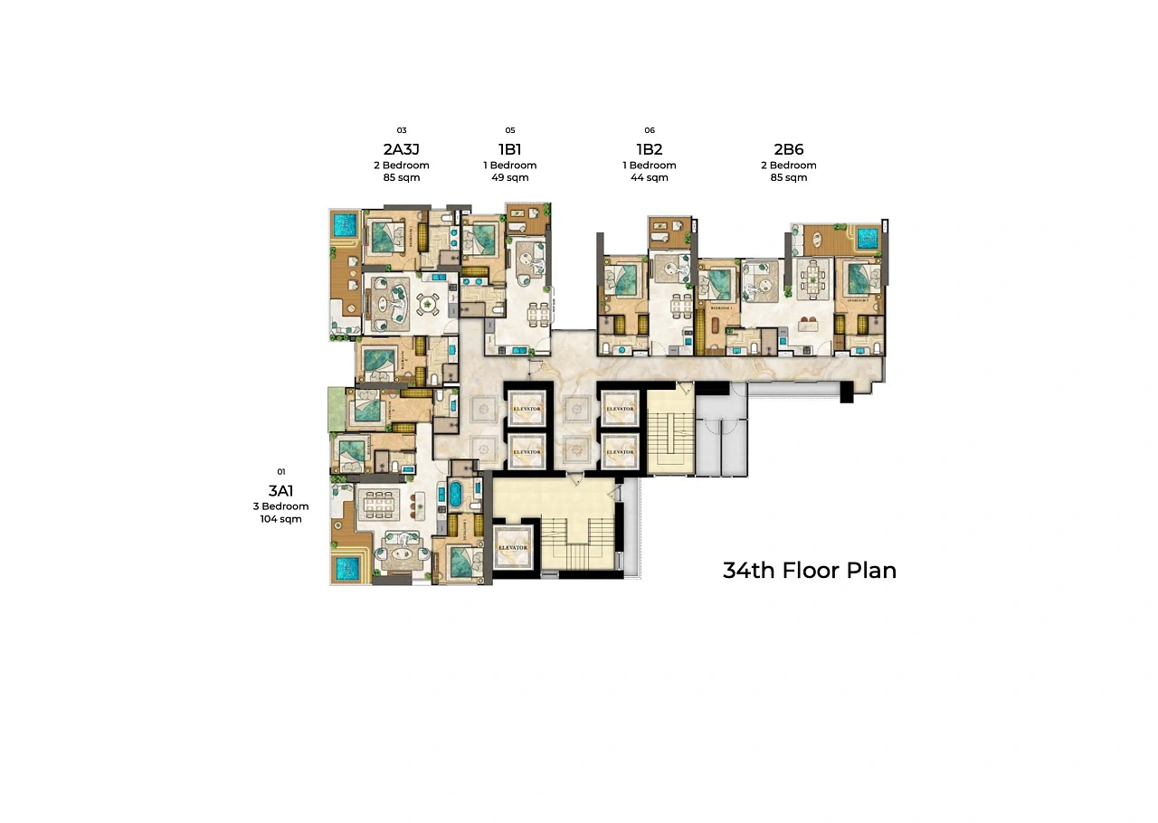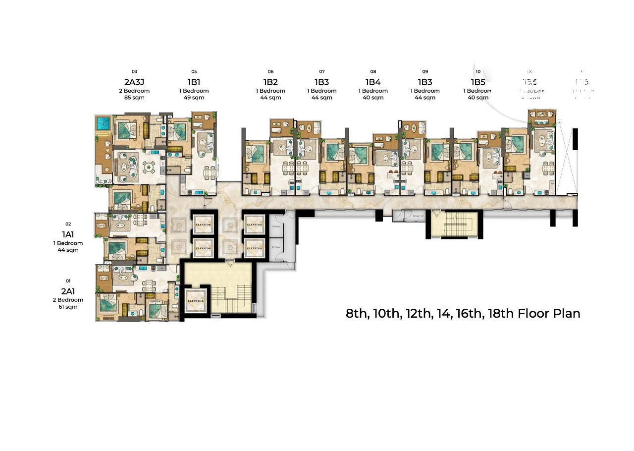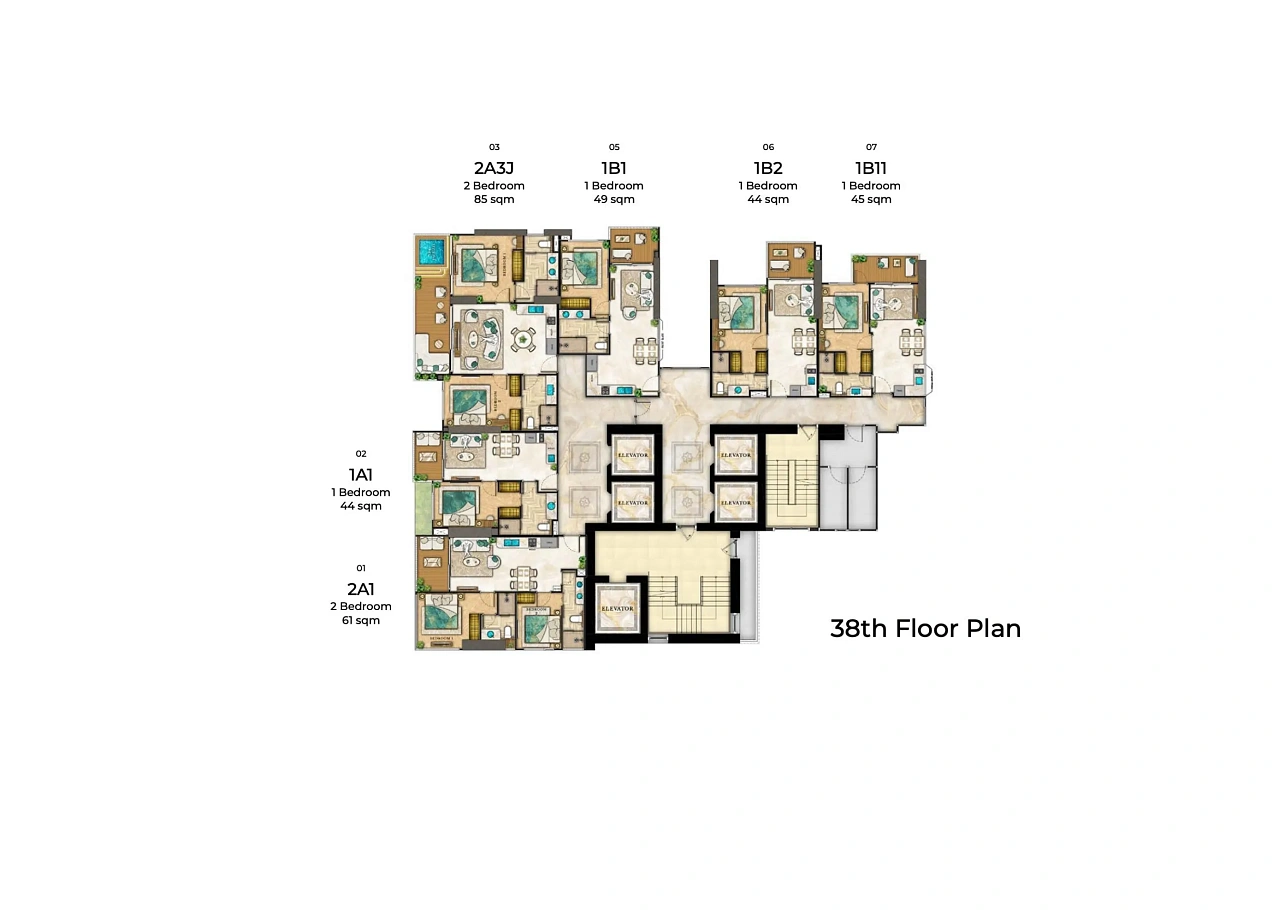Апартаменты: 298 резиденций (1–3 спальни, дуплексы, пентхаусы от 39 до 295 м²)
