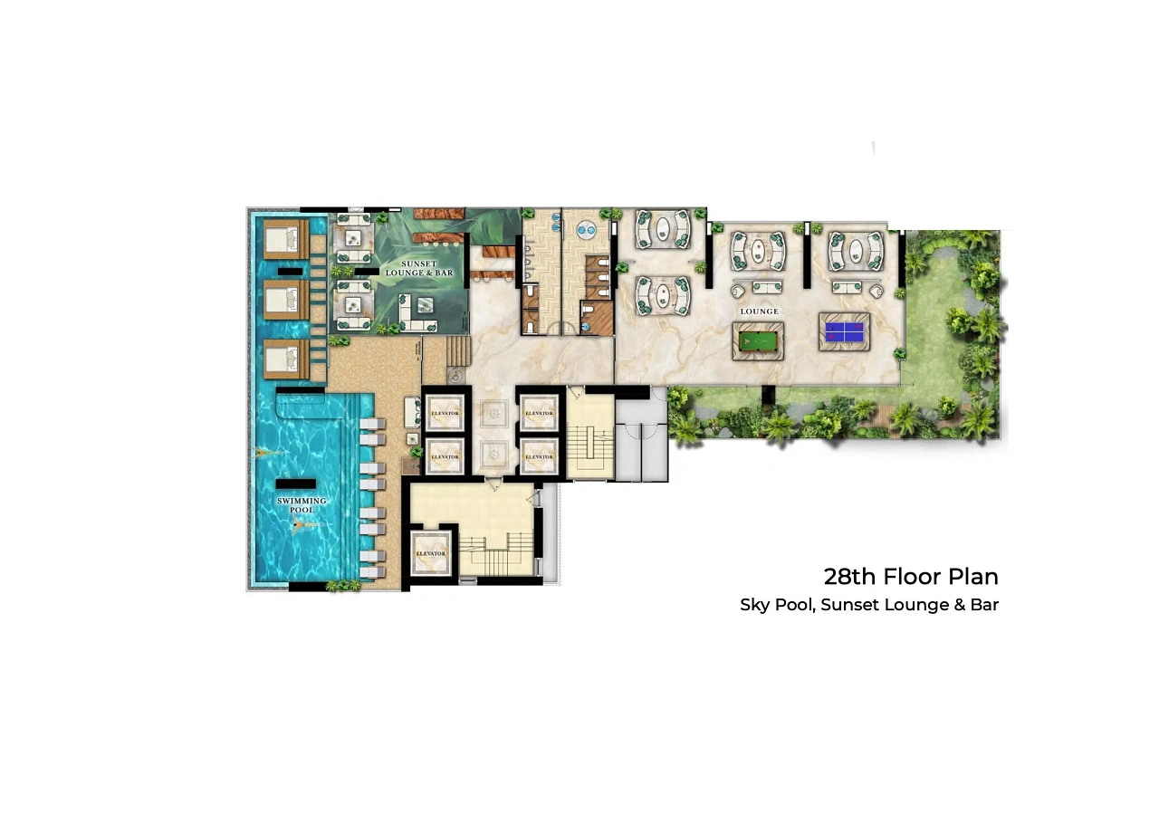 - Sky-Pool: пейзажный инфинити бассейн на 28 этаже с лаунж-баром и игровыми зонами.