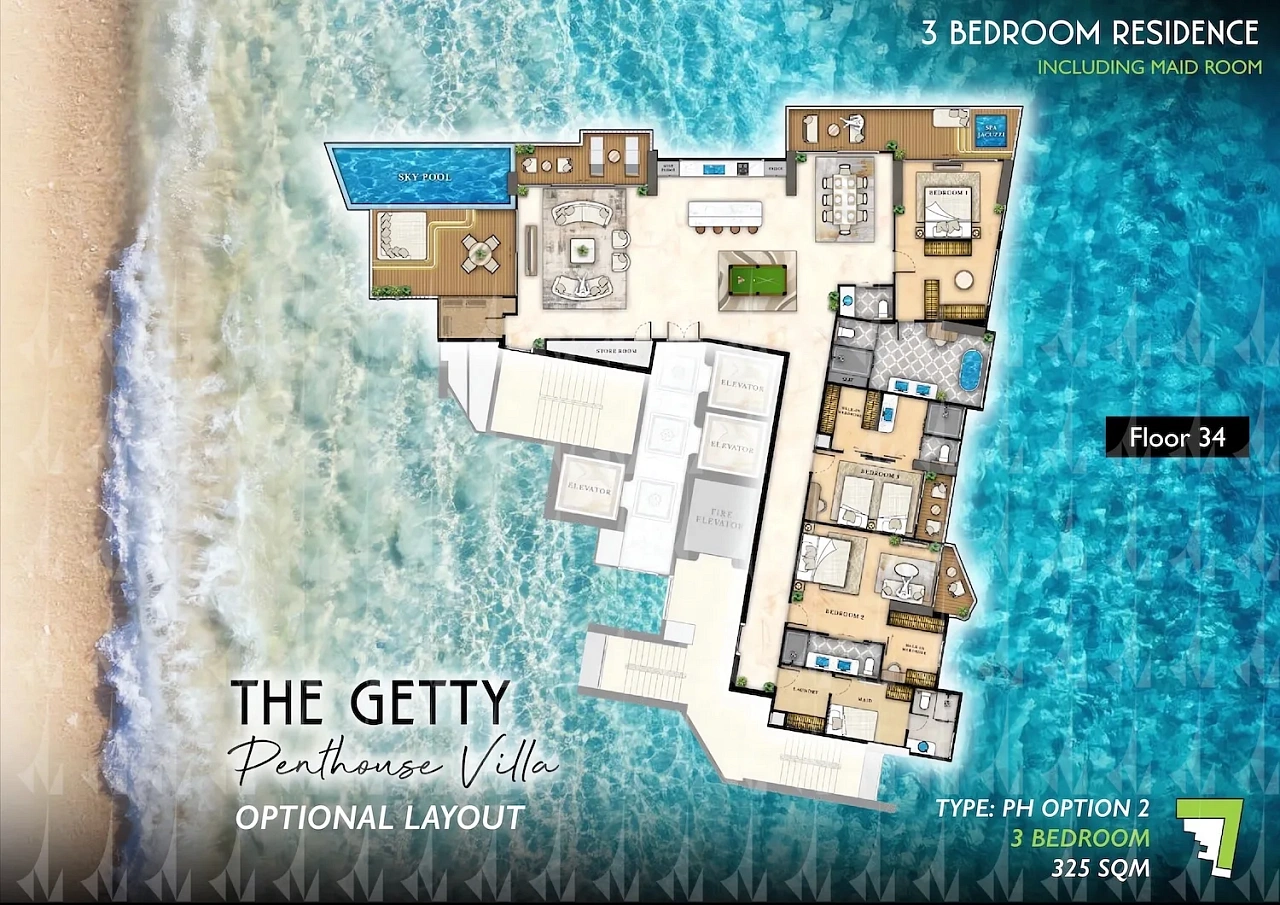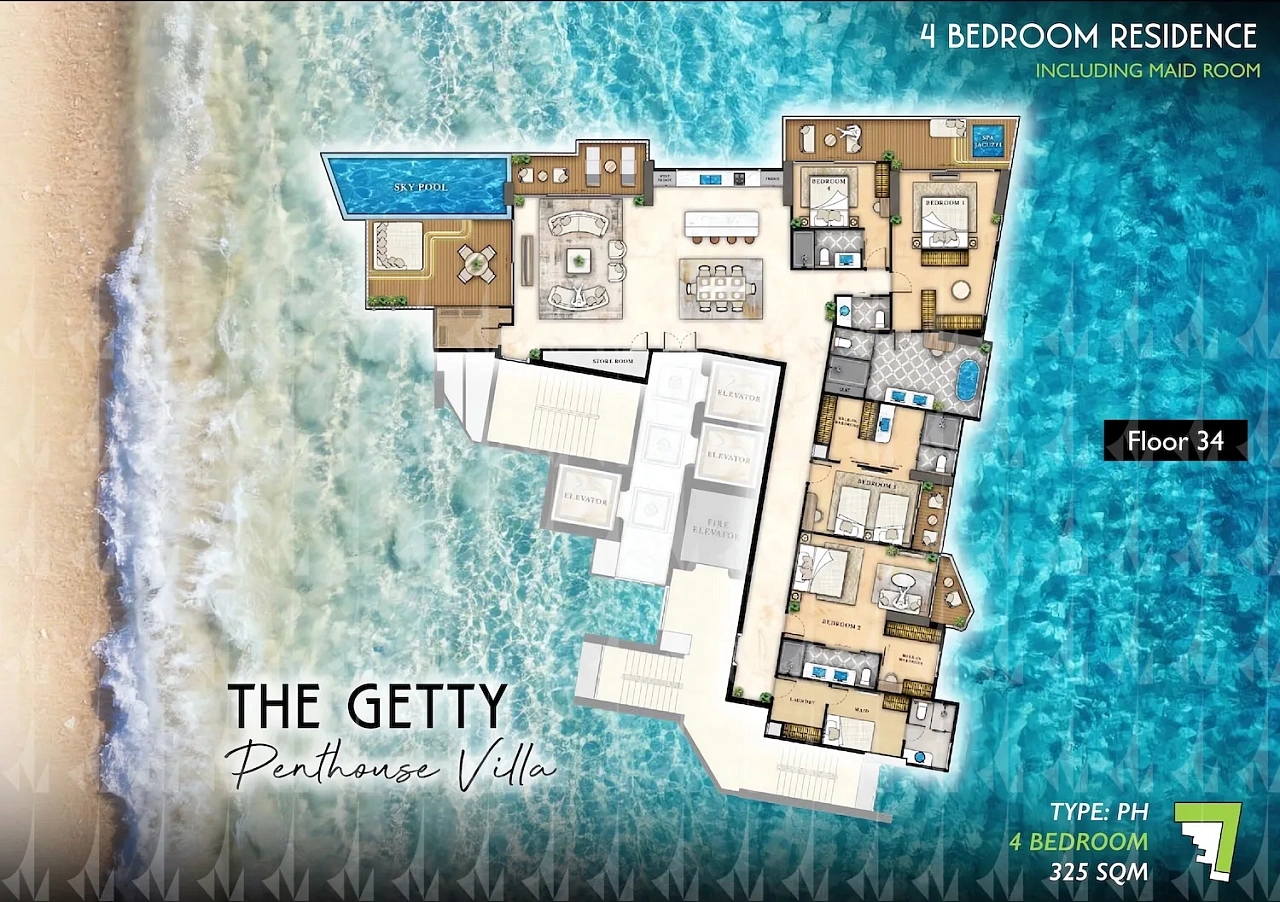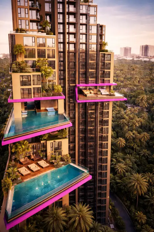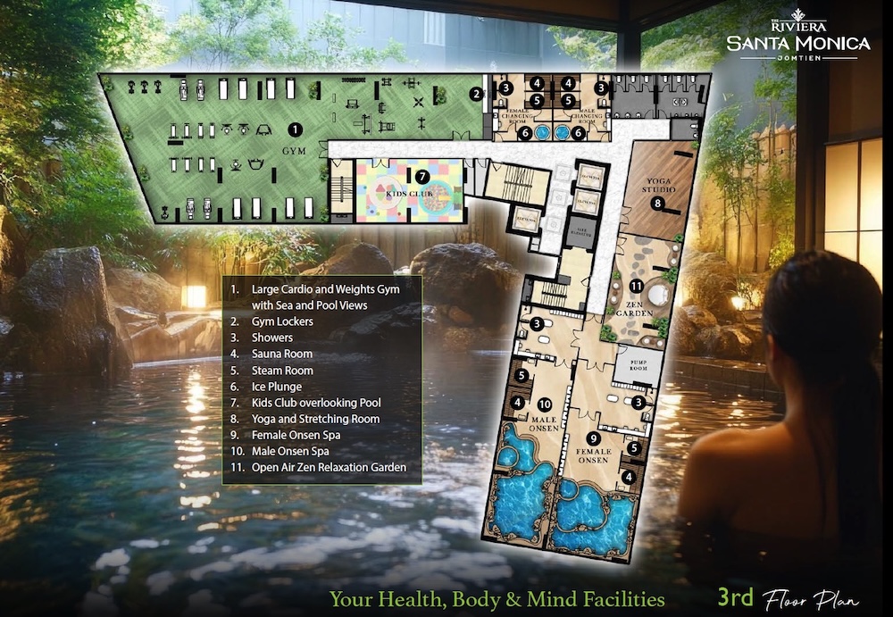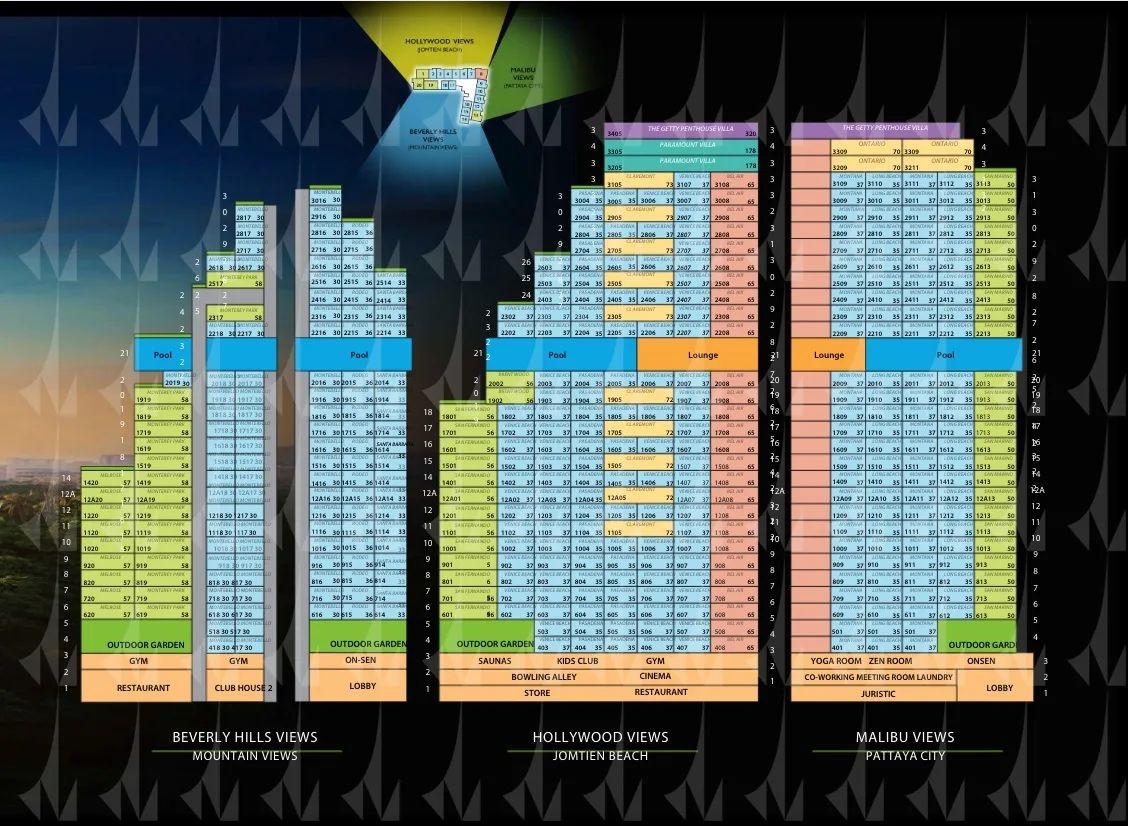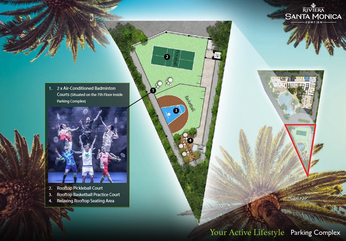 Комплекс на Джомтьен Бич предлагает 446 апартаментов с панорамными видами на море, создавая уединённую атмосферу вдали от шумного города. Расположение в нескольких минутах от пляжа и инфраструктуры идеально для жизни и инвестиций — аренды или перепродажи. Инфраструктура включает два инфинити-бассейна на 21-м этаже, открытый бассейн с джакузи и двойным потолком на 4-м этаже, фитнес-центр с видом на море, сауны, онсен, боулинг, кинотеатр, корты для бадминтона, баскетбола и пиклбола, лаундри, мини-маркет, ресторан с террасой и вертолетную площадку для пентхаусов. Зоны для йоги, детские площадки и Wi-Fi обеспечивают комфорт. Высокий спрос на аренду подчёркивает инвестиционную привлекательность проекта.