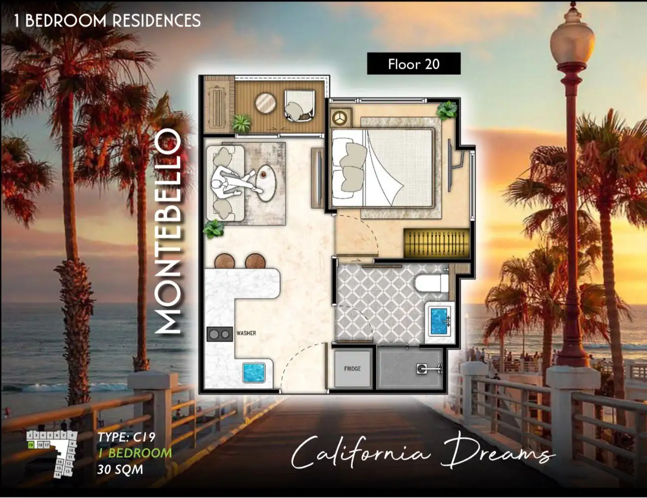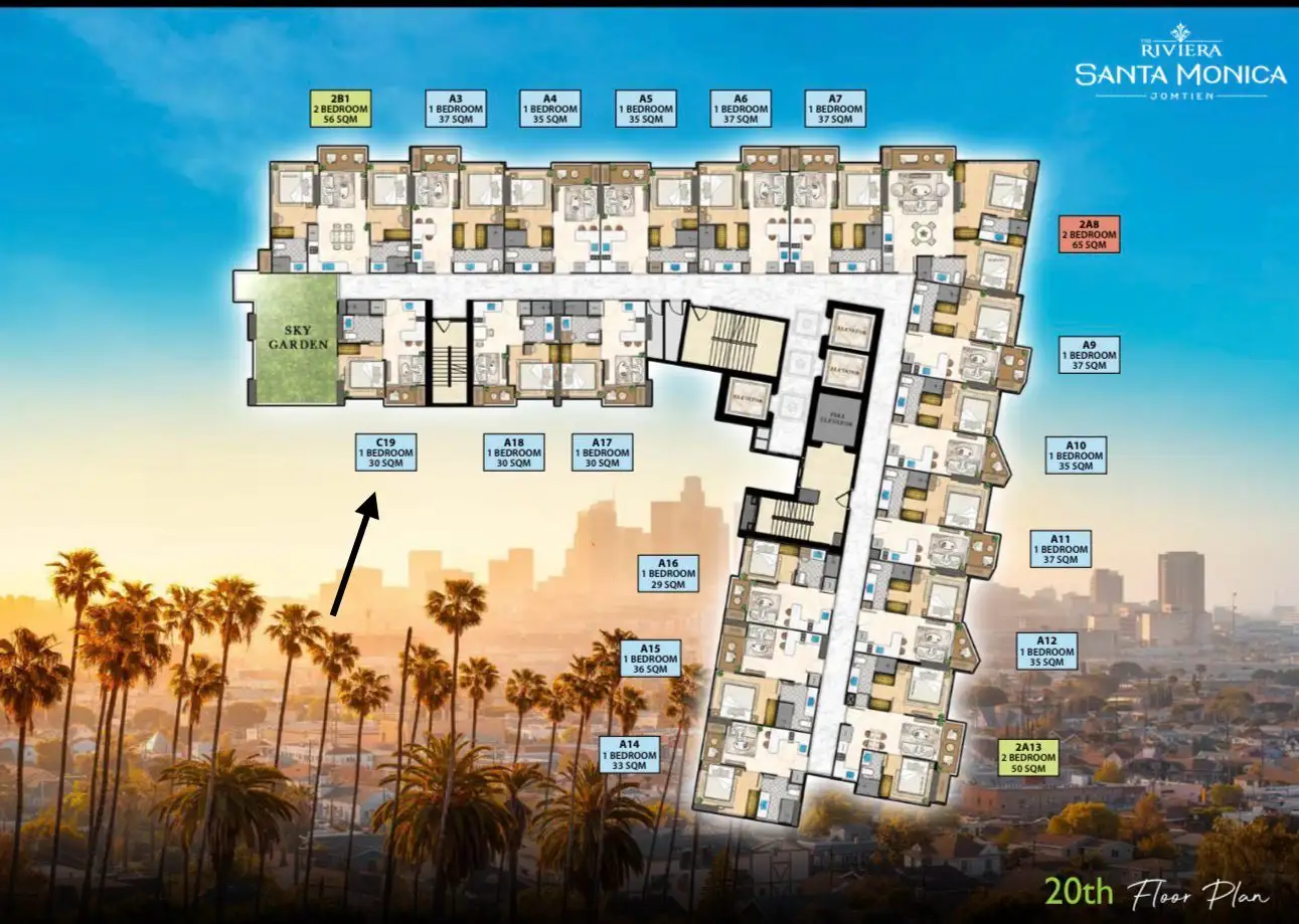 1-комнатная квартира 30 м² на 20 этаже в комплексе The Riviera Santa Monica. Полностью меблирована, готова к проживанию и аренде. Близость к морю — всего 1 км до пляжа. Отличный вариант для тех, кто хочет купить квартиру в Паттайе рядом с пляжем.
