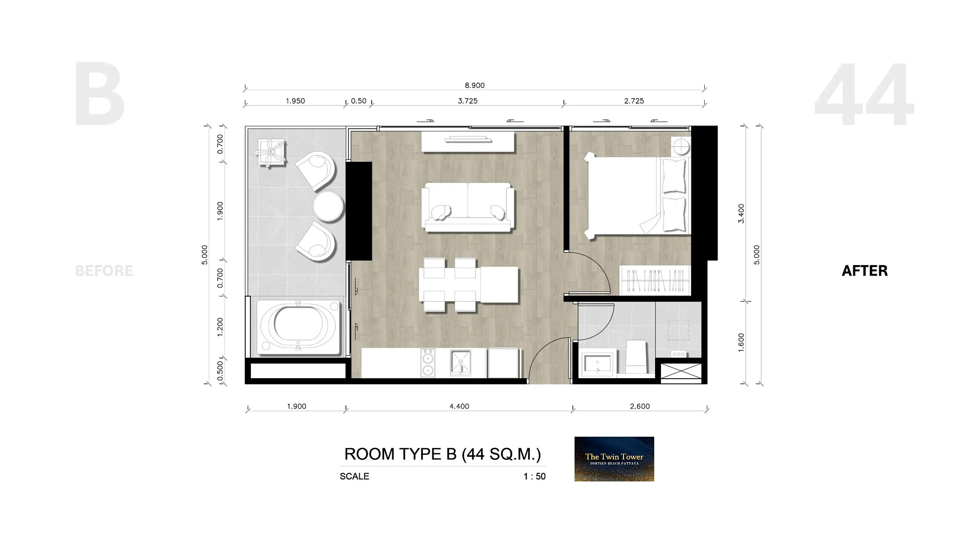 О квартире The Twin Tower Jomtien — апартаменты с 1 спальней, 44-46 м²