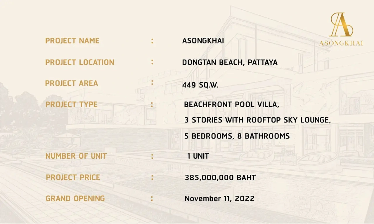 Villa Asongkhai Pattaya разработан известным застройщиком, специализирующимся на создании элитных жилых комплексов в Таиланде. Их проекты отличаются высоким качеством строительства, современными технологиями и вниманием к деталям, обеспечивая комфорт и роскошь для жителей.