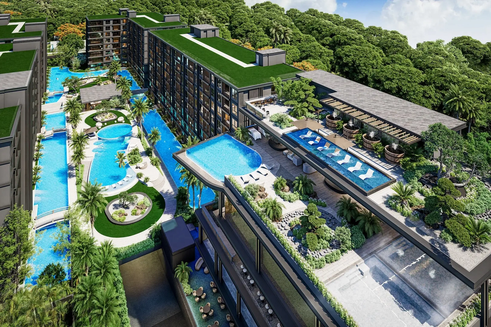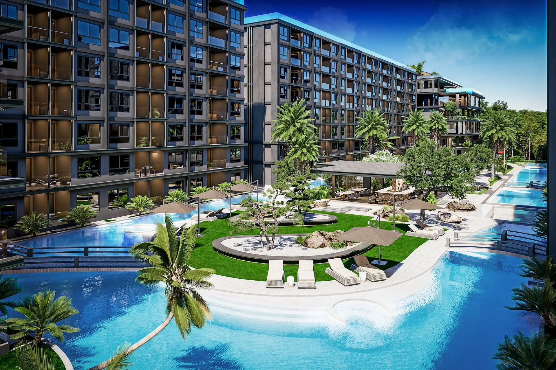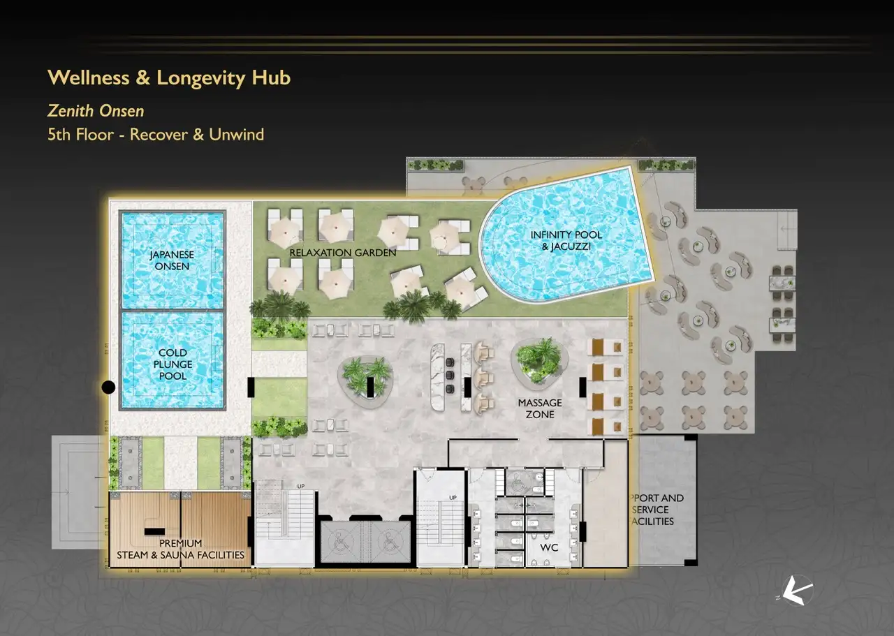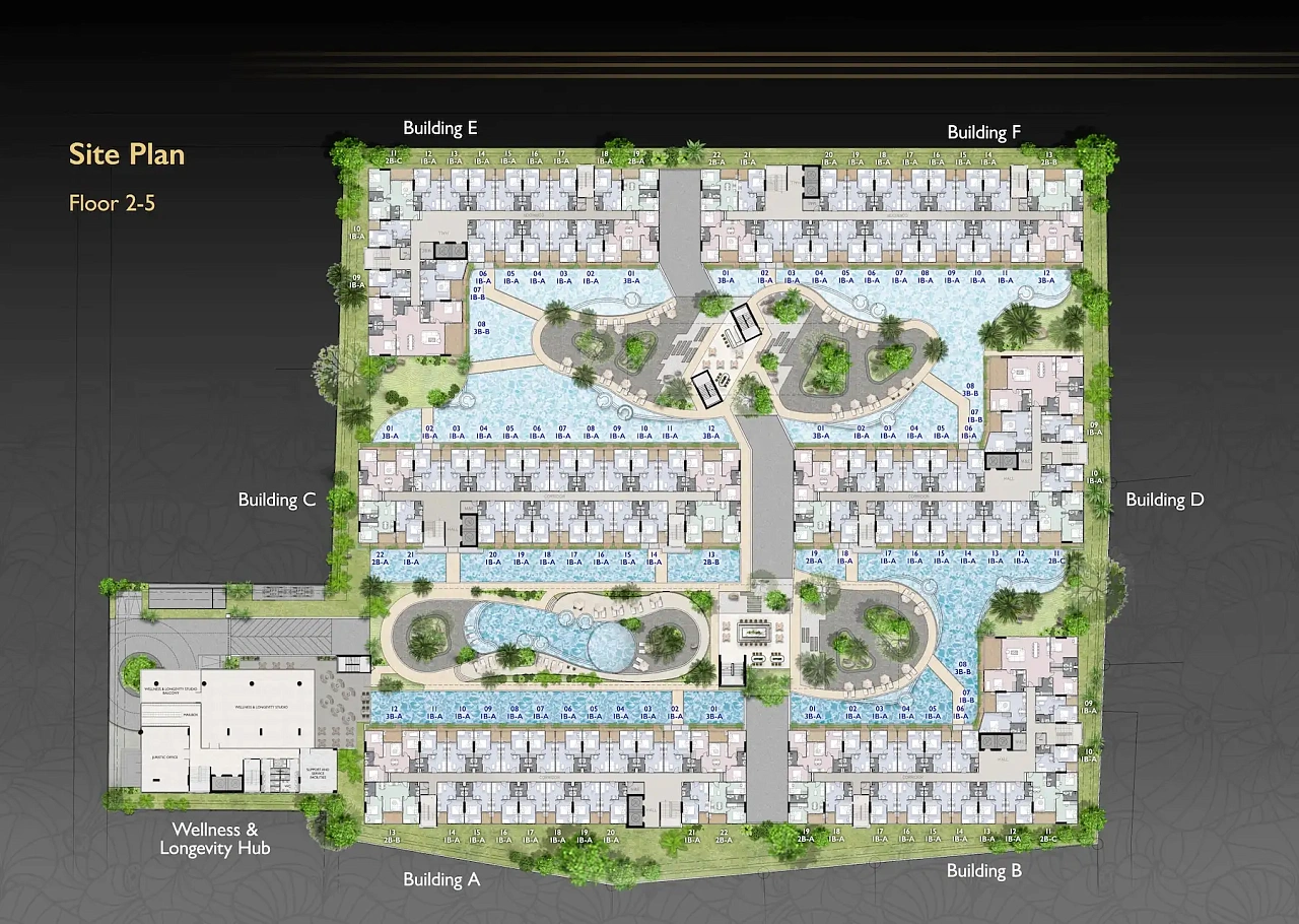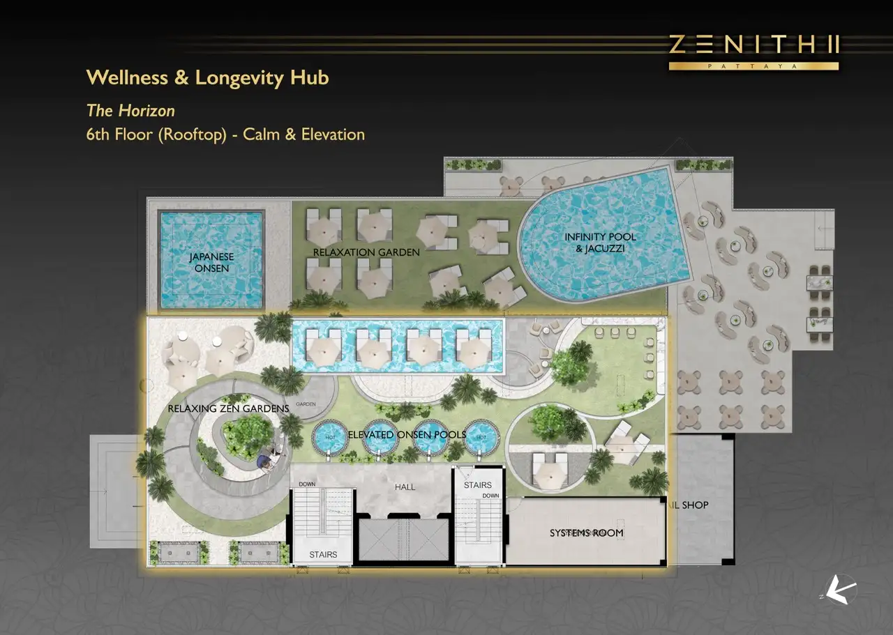 Проект создан для тех, кто ищет гармоничную среду для здоровья, восстановления и инвестиций. В центре — 6-этажный Wellness & Longevity Hub с клиникой, фитнесом TechnoGym, японским Onsen, рестораном и коворкингом. Четыре лагунных бассейна в японских садах создают атмосферу курорта. Локация обеспечивает тишину, приватность и удобный доступ к пляжам Jomtien, Pratumnak Hill и центру Паттайи.