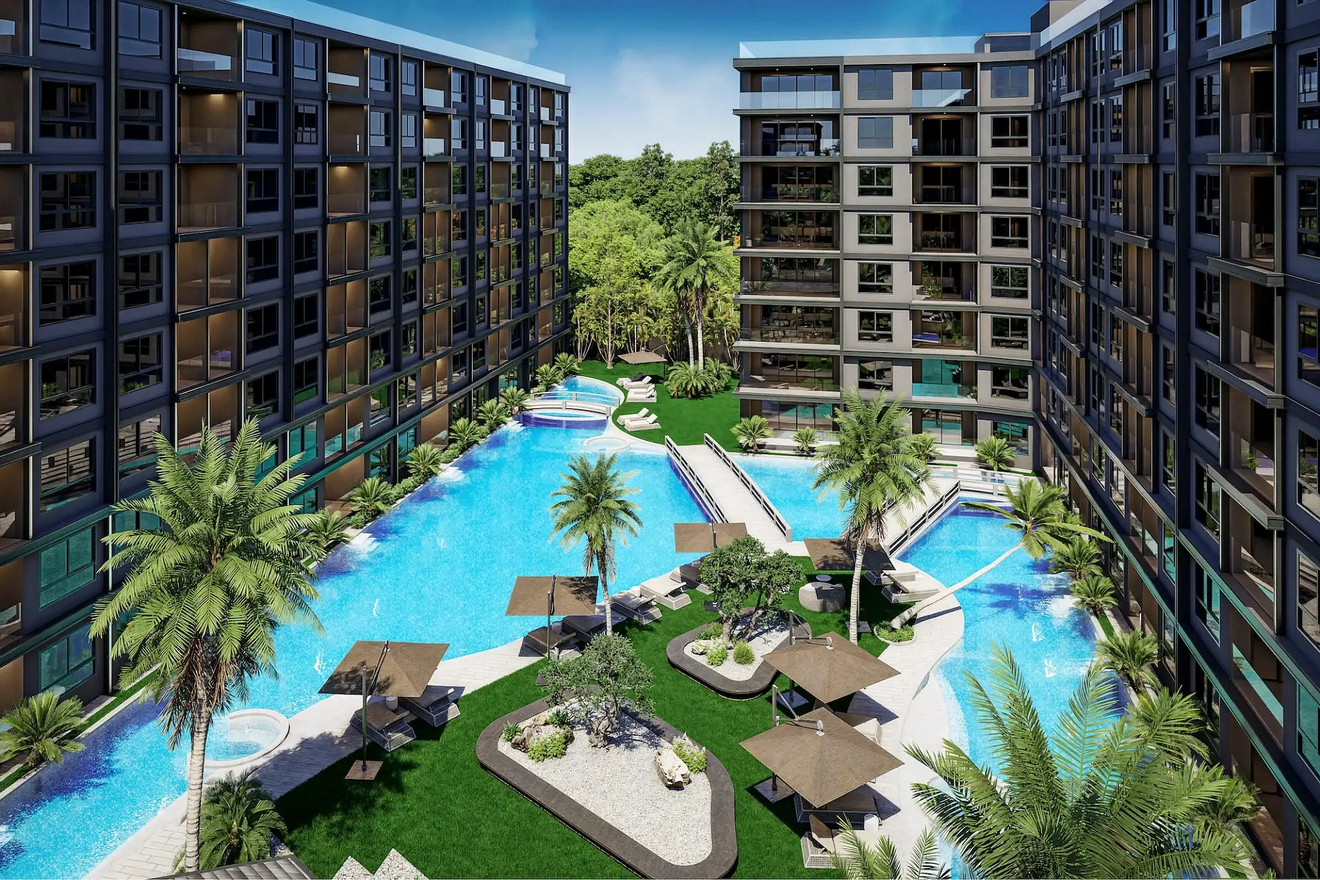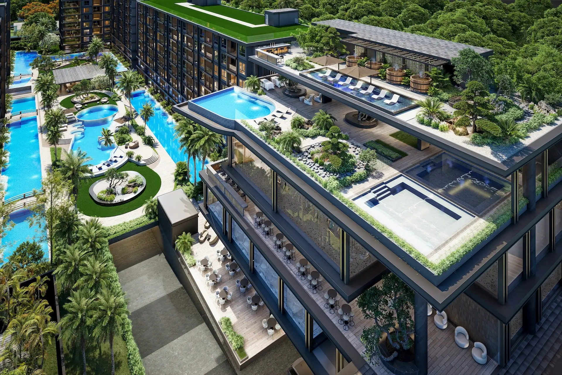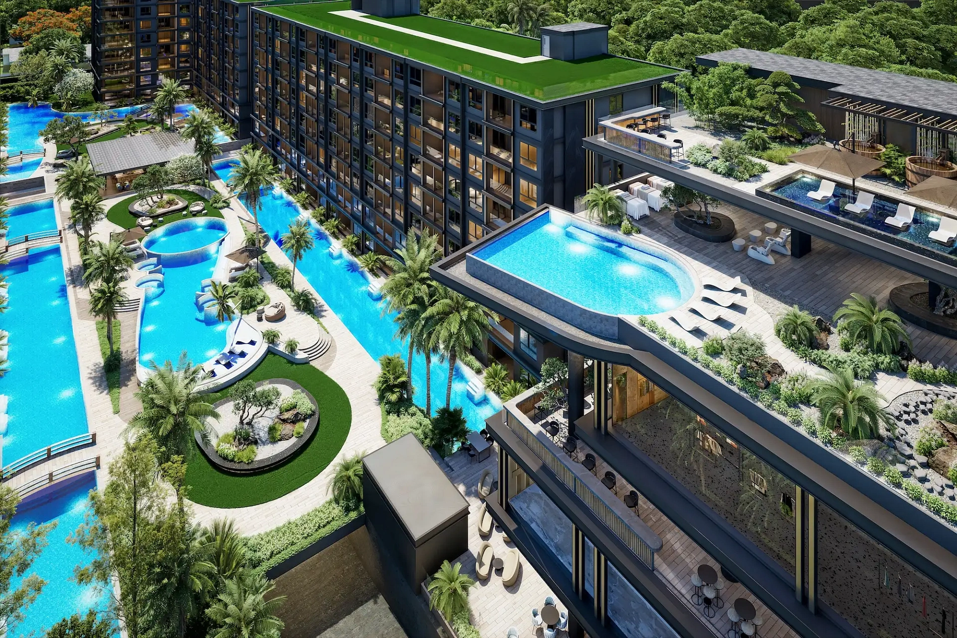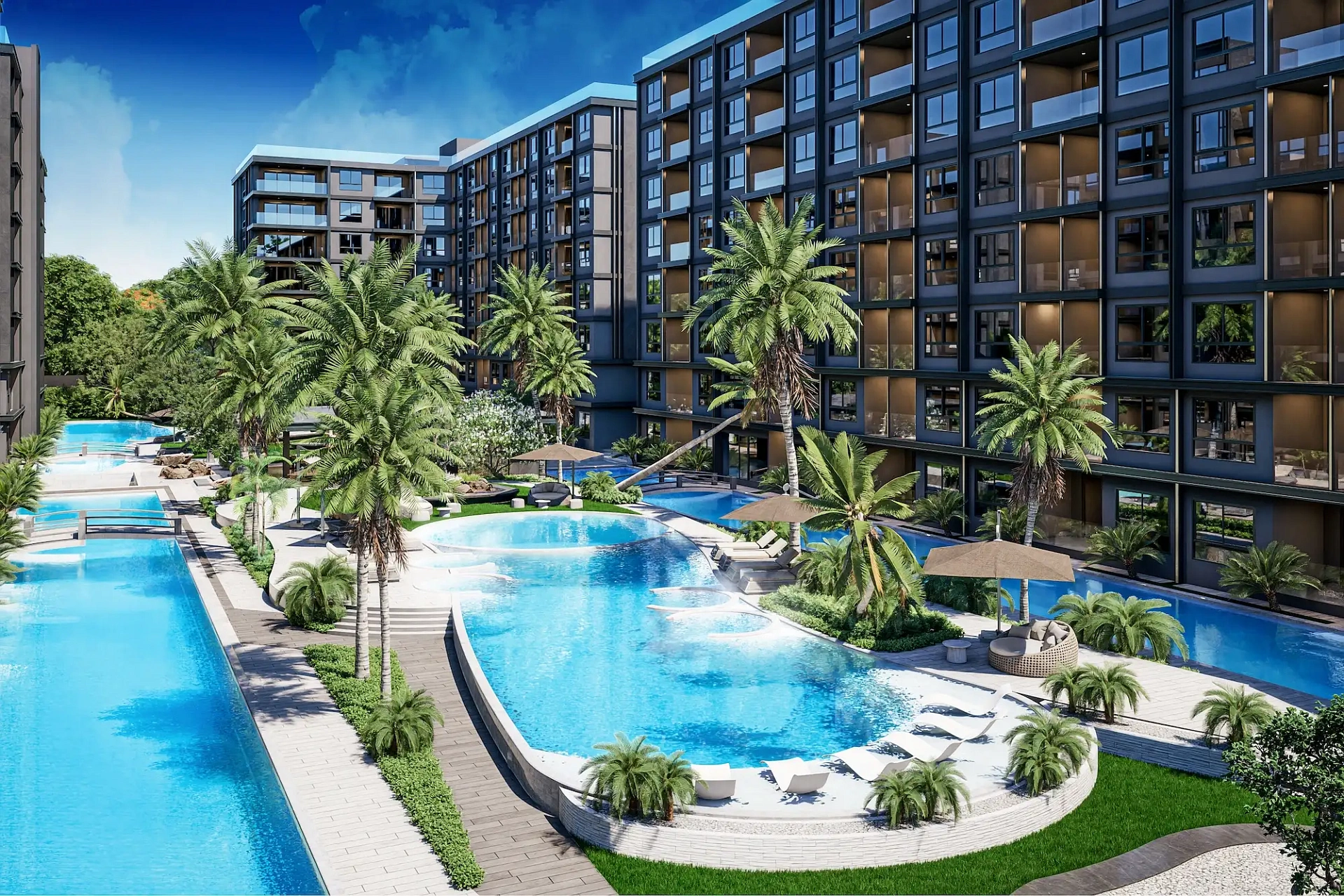 Проект создан для тех, кто ищет гармоничную среду для здоровья, восстановления и инвестиций. В центре — 6-этажный Wellness & Longevity Hub с клиникой, фитнесом TechnoGym, японским Onsen, рестораном и коворкингом. Четыре лагунных бассейна в японских садах создают атмосферу курорта. Локация обеспечивает тишину, приватность и удобный доступ к пляжам Jomtien, Pratumnak Hill и центру Паттайи.