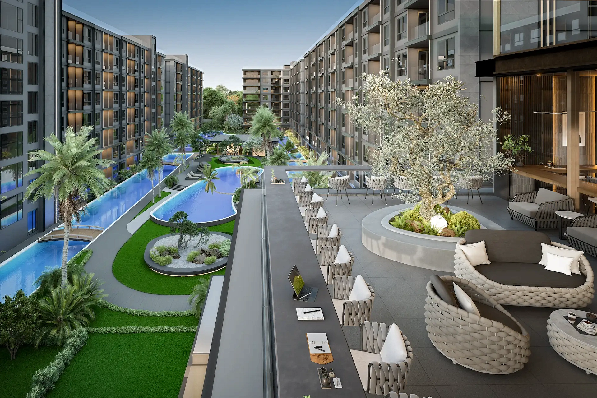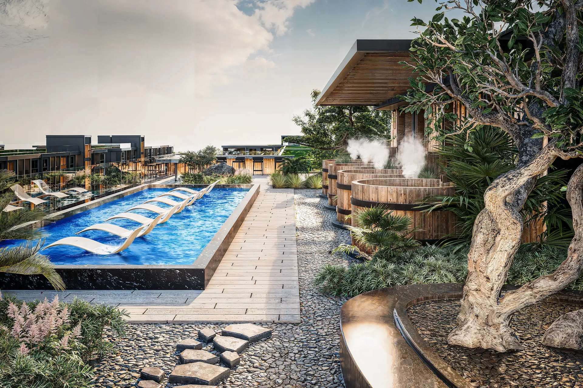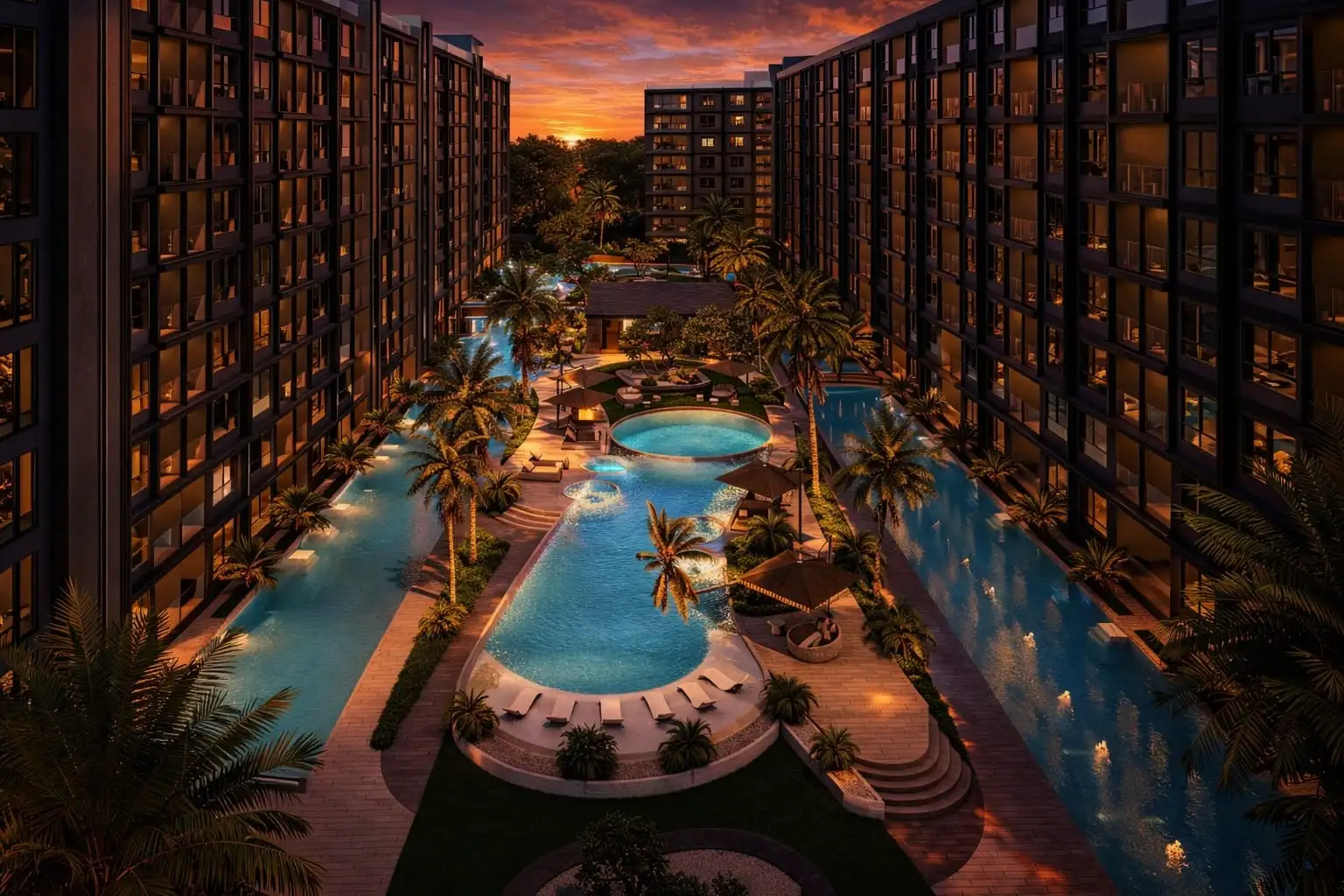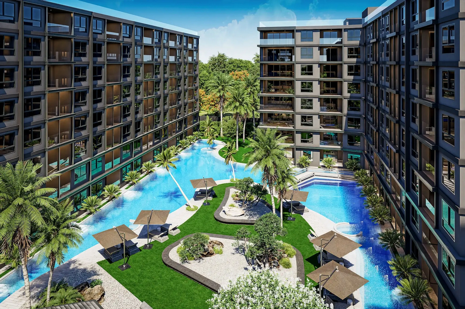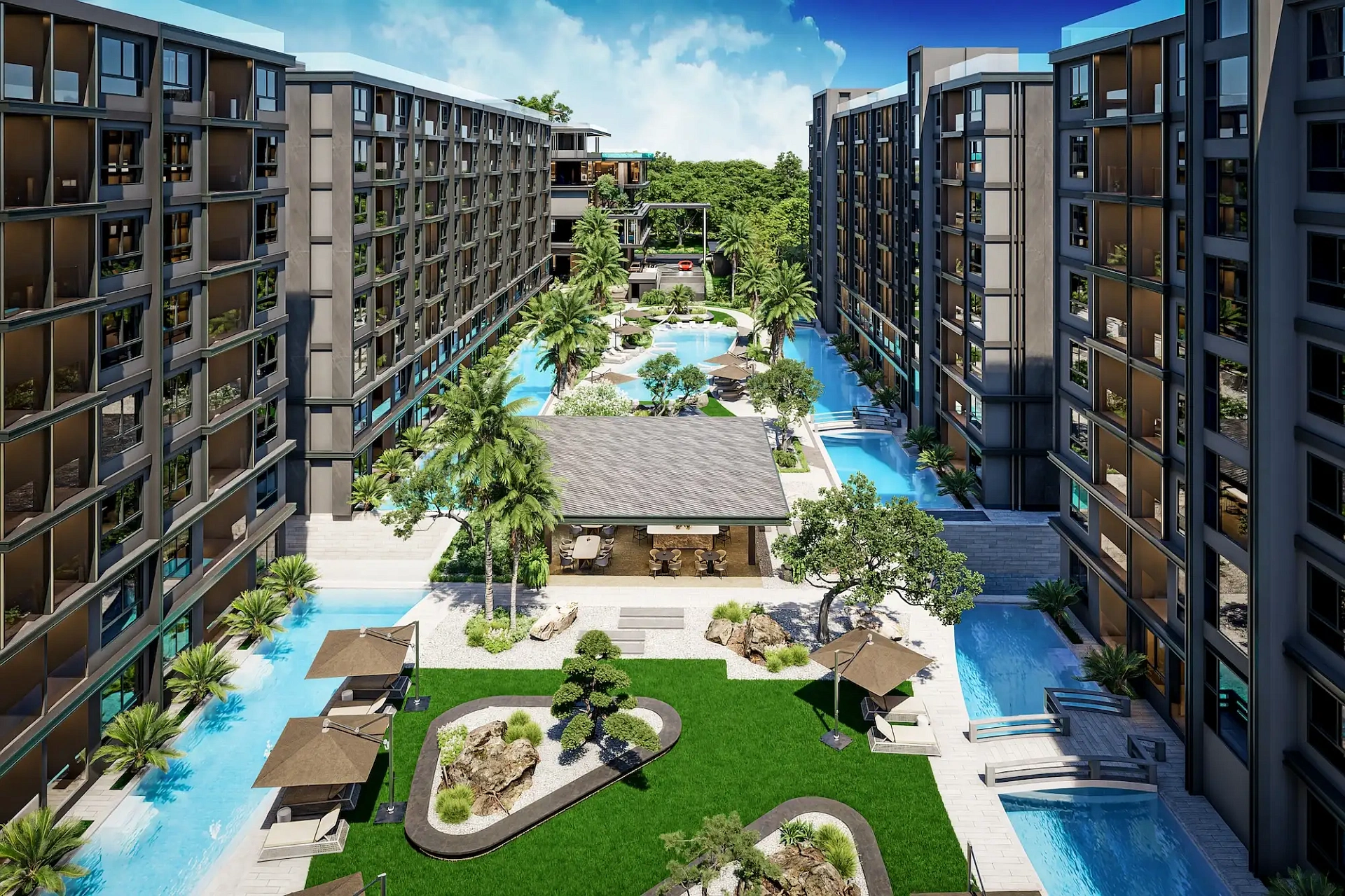Проект создан для тех, кто ищет гармоничную среду для здоровья, восстановления и инвестиций. В центре — 6-этажный Wellness & Longevity Hub с клиникой, фитнесом TechnoGym, японским Onsen, рестораном и коворкингом. Четыре лагунных бассейна в японских садах создают атмосферу курорта. Локация обеспечивает тишину, приватность и удобный доступ к пляжам Jomtien, Pratumnak Hill и центру Паттайи.