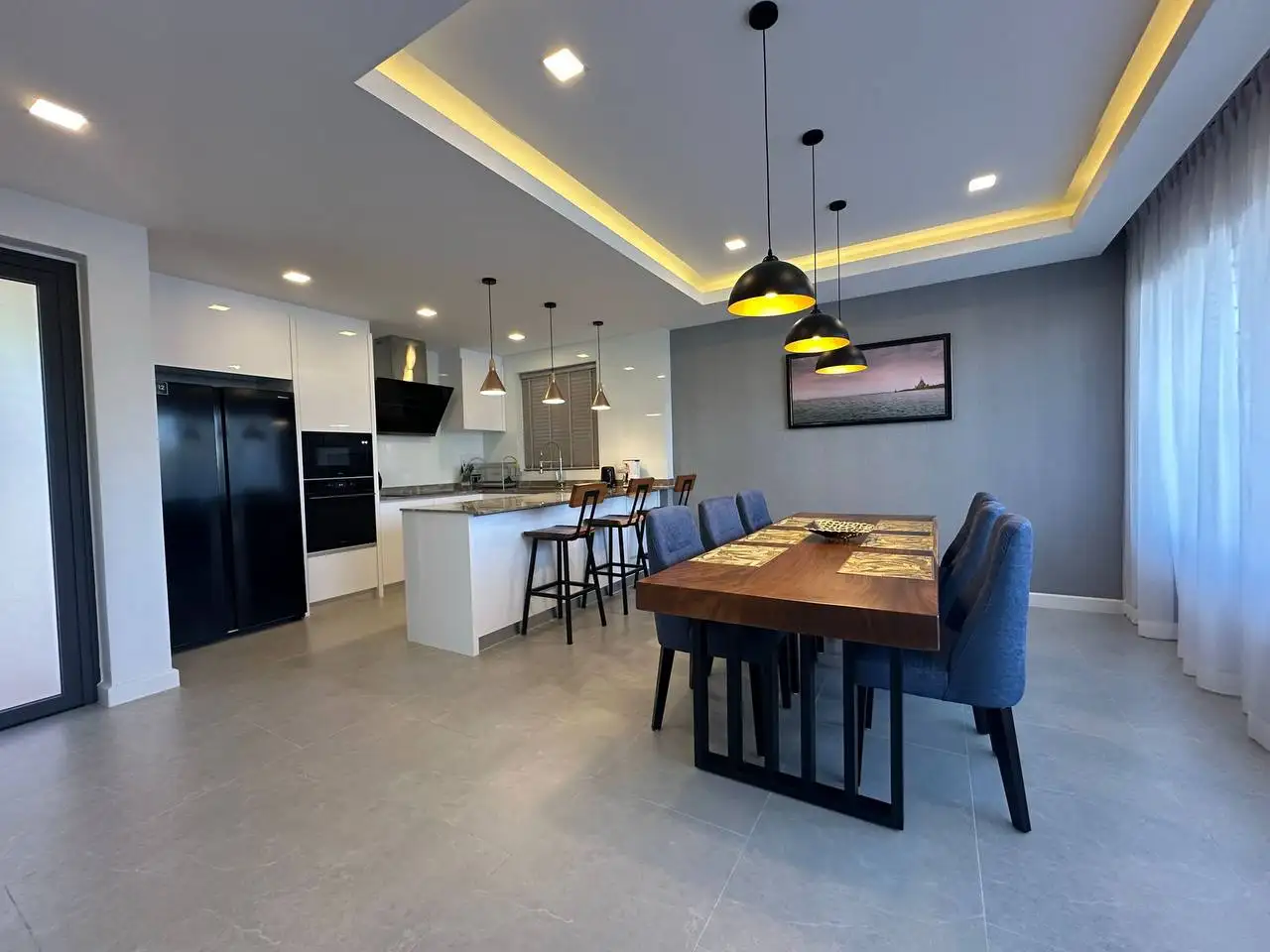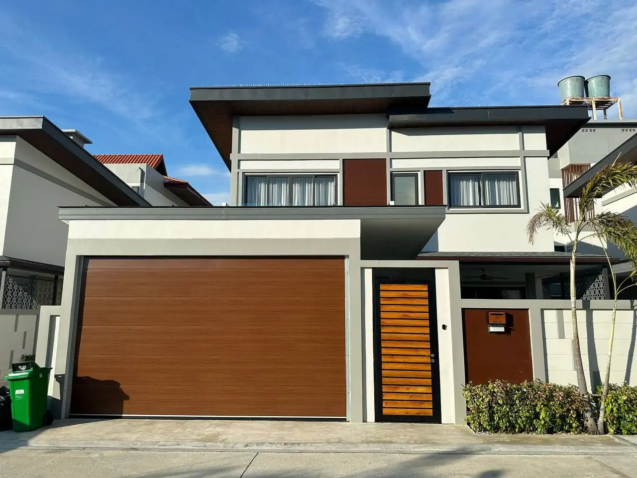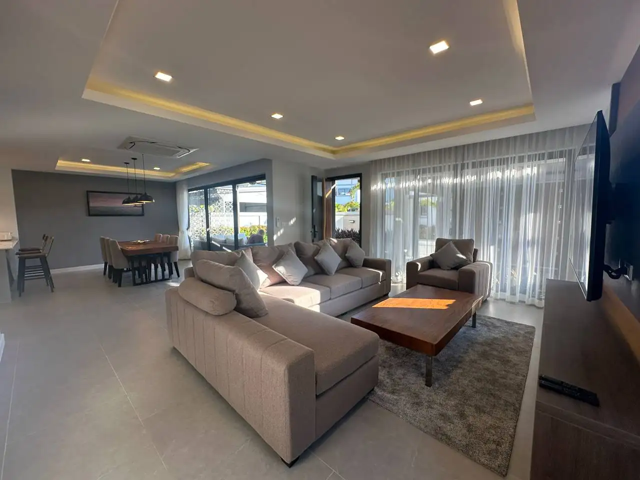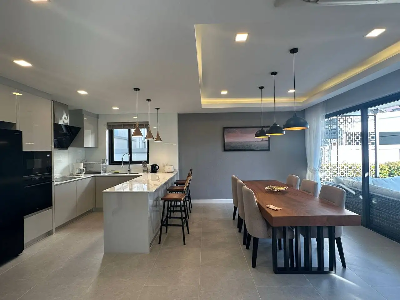 Особенности: Частные бассейны, тропическое озеленение, стильный дизайн потолков, современные электросети западных стандартов, алюминиевые окна с порошковым покрытием, прочные двери, встроенные шкафы, возможность заказа полной меблировки "под ключ", гараж на 2 автомобиля, зарядная станция для электромобилей, солнечные панели, джакузи (по желанию), бытовая техника (посудомоечная машина Hafele, стиральная машина LG 10 кг), LG телевизоры (65" в гостиной, 55" на террасе, 50" в спальнях), обеденный стол из акации 240x90 см с 6 мягкими стульями, угловой диван с тканевой обивкой, мраморный кофейный столик, ковёр, L-образный диван на улице, шезлонги, барные стулья для кухонного острова, холодильник с морозильной камерой, полный комплект постельного белья, шторы и жалюзи.