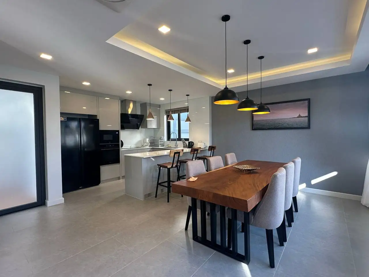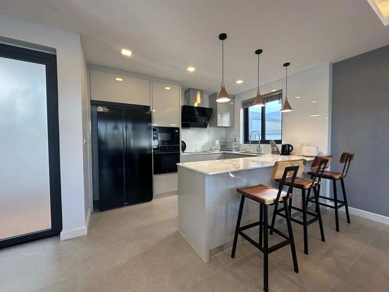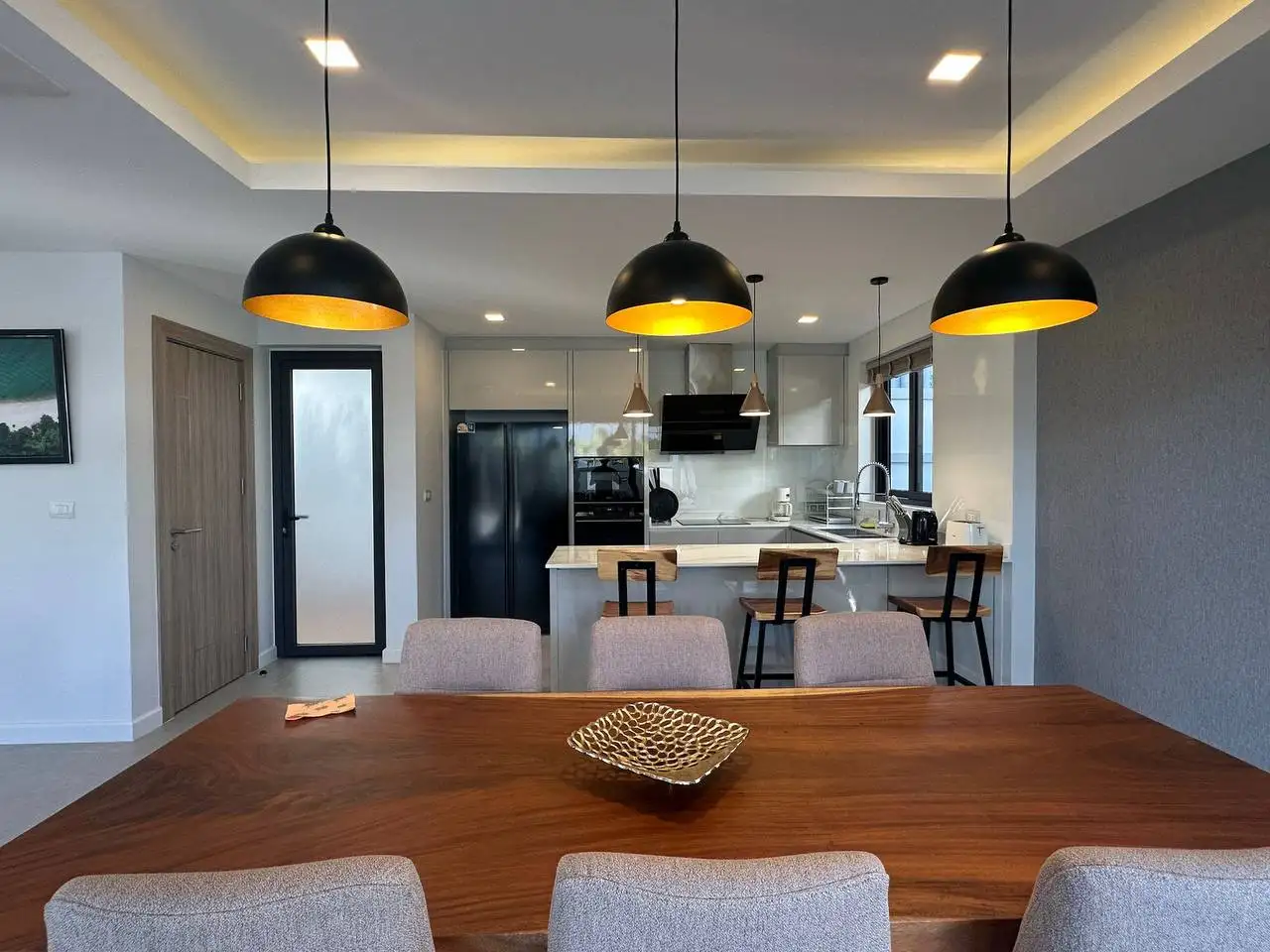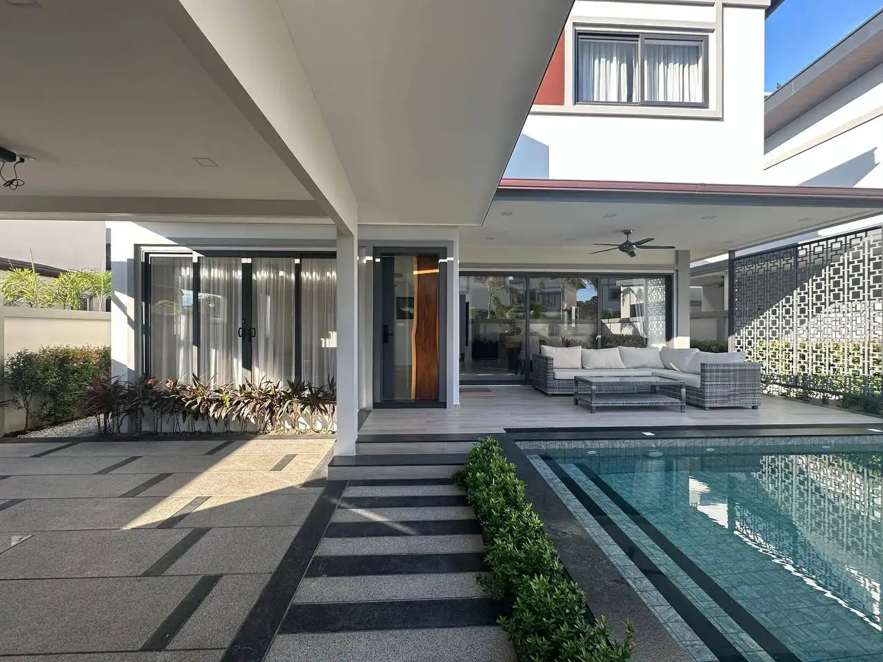 Особенности: Частные бассейны, тропическое озеленение, стильный дизайн потолков, современные электросети западных стандартов, алюминиевые окна с порошковым покрытием, прочные двери, встроенные шкафы, возможность заказа полной меблировки "под ключ", гараж на 2 автомобиля, зарядная станция для электромобилей, солнечные панели, джакузи (по желанию), бытовая техника (посудомоечная машина Hafele, стиральная машина LG 10 кг), LG телевизоры (65" в гостиной, 55" на террасе, 50" в спальнях), обеденный стол из акации 240x90 см с 6 мягкими стульями, угловой диван с тканевой обивкой, мраморный кофейный столик, ковёр, L-образный диван на улице, шезлонги, барные стулья для кухонного острова, холодильник с морозильной камерой, полный комплект постельного белья, шторы и жалюзи.