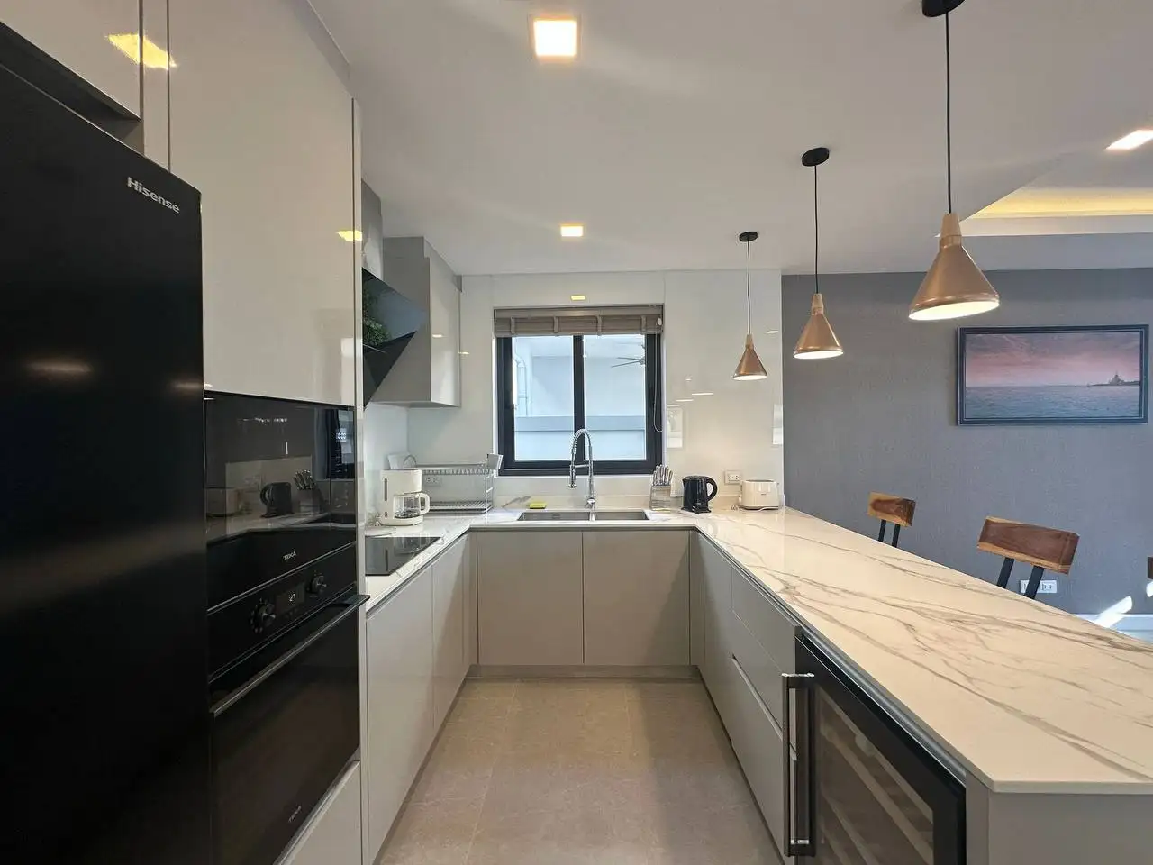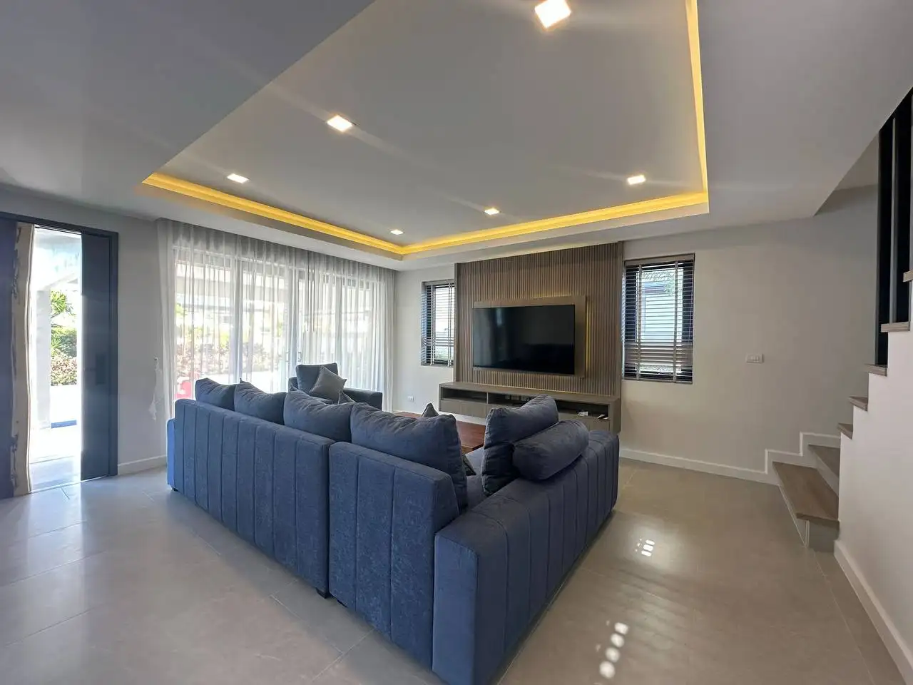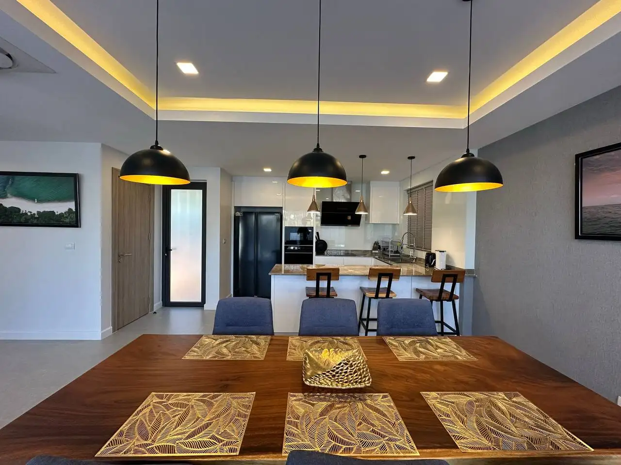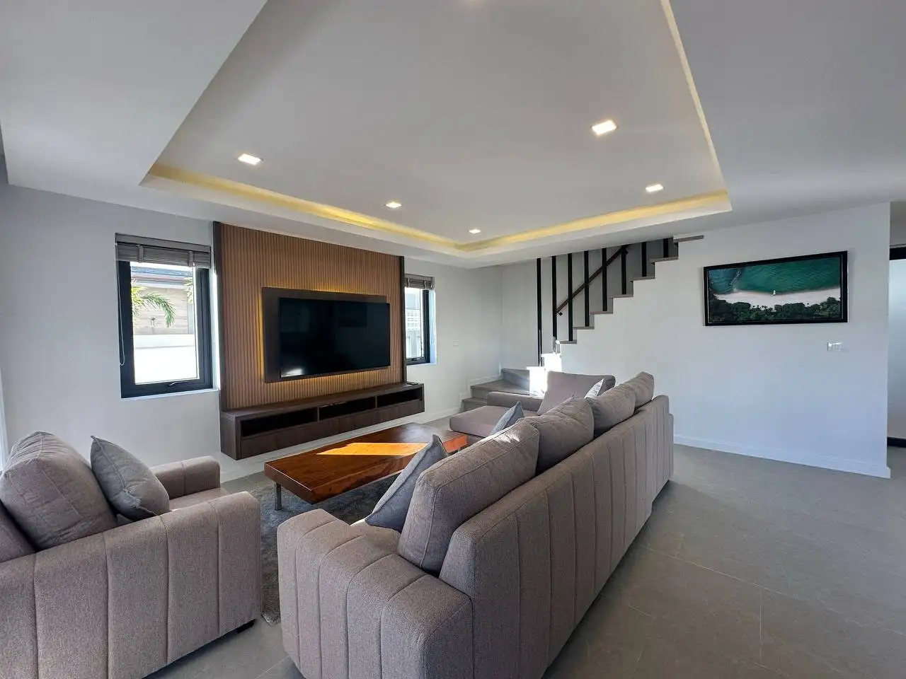 Особенности: Частные бассейны, тропическое озеленение, стильный дизайн потолков, современные электросети западных стандартов, алюминиевые окна с порошковым покрытием, прочные двери, встроенные шкафы, возможность заказа полной меблировки "под ключ", гараж на 2 автомобиля, зарядная станция для электромобилей, солнечные панели, джакузи (по желанию), бытовая техника (посудомоечная машина Hafele, стиральная машина LG 10 кг), LG телевизоры (65" в гостиной, 55" на террасе, 50" в спальнях), обеденный стол из акации 240x90 см с 6 мягкими стульями, угловой диван с тканевой обивкой, мраморный кофейный столик, ковёр, L-образный диван на улице, шезлонги, барные стулья для кухонного острова, холодильник с морозильной камерой, полный комплект постельного белья, шторы и жалюзи.