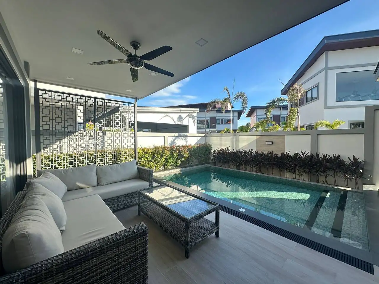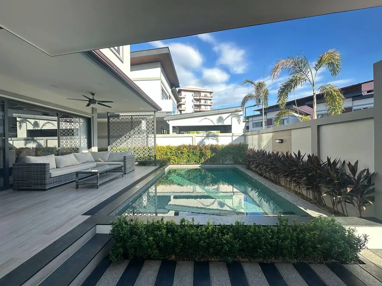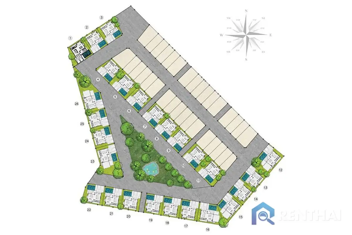 - Безопасность и инфраструктура: Комплекс из 26 вилл с круглосуточной охраной и видеонаблюдением расположен рядом с Bangkok Hospital Pattaya, международными школами, магазинами, кафе и ресторанами, обеспечивая уединённый отдых вблизи оживлённых зон.