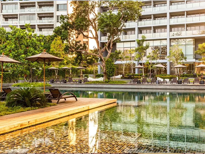 - Панорамные виды: Полностью меблированные апартаменты (38–185 кв.м) с просторными балконами, обеспечивающими виды на Сиамский залив.