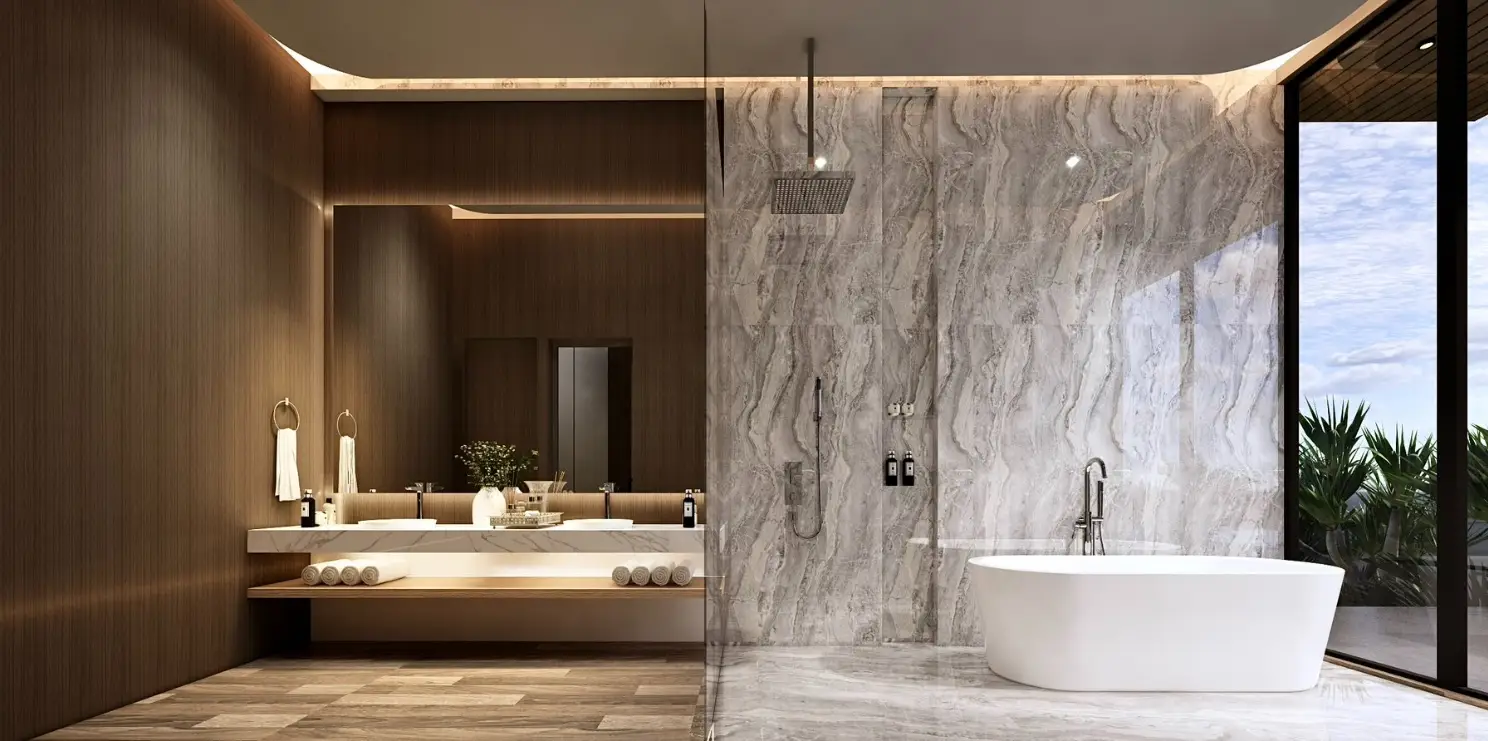- Полностью укомплектованный интерьер: встроенные шкафы, шторы, ванные комнаты с раковинами, зеркалами, душевыми зонами и сантехникой