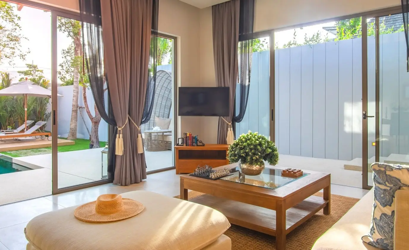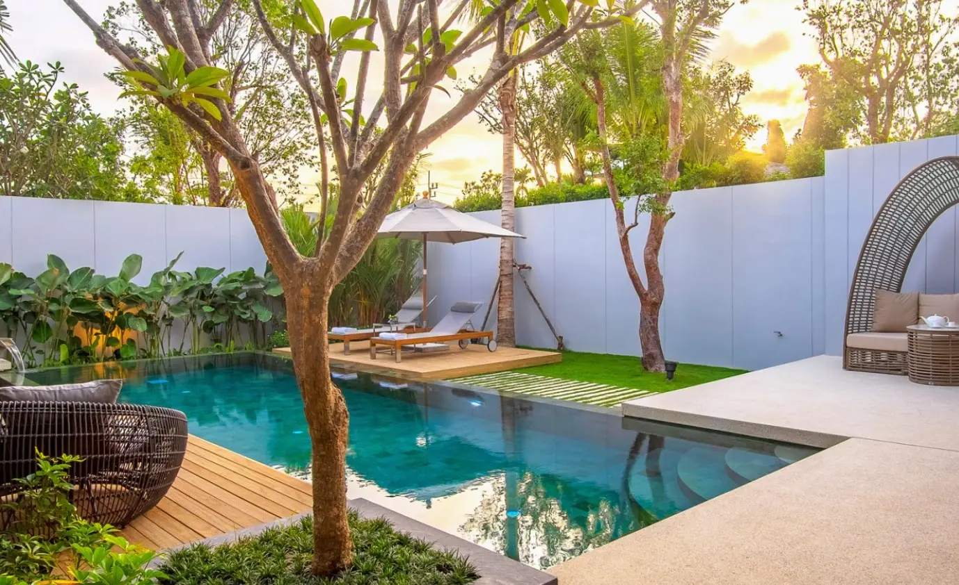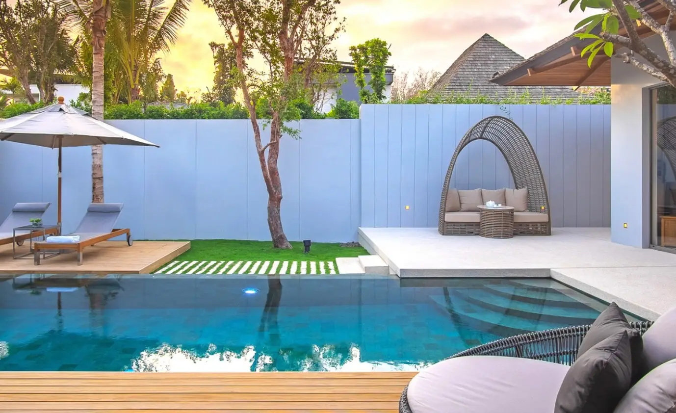 - Типы вилл: 2–4 спальни, терраса с зоной барбекю и сад