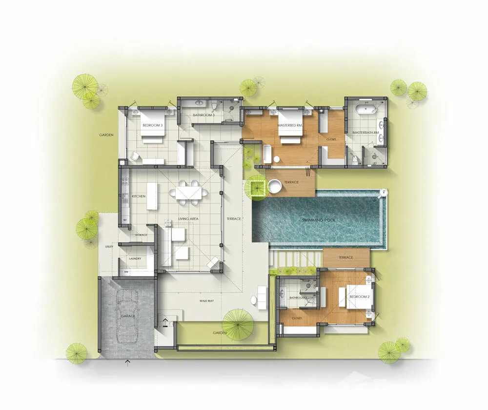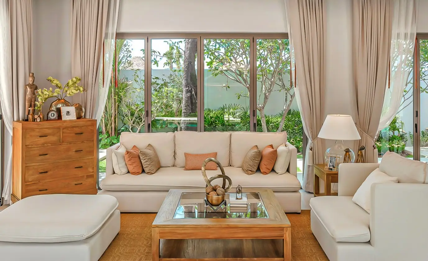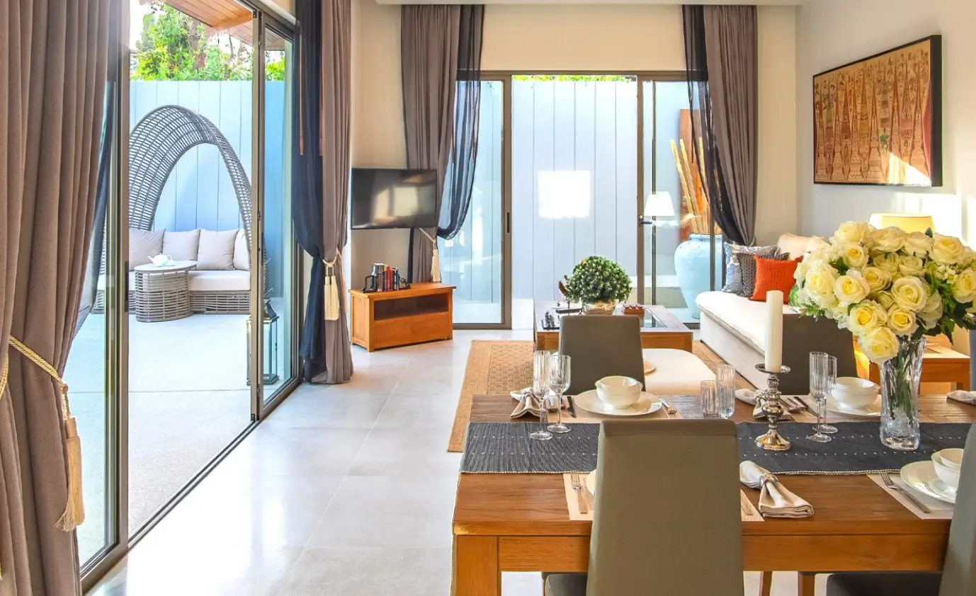 - Типы вилл: 2–4 спальни, терраса с зоной барбекю и сад