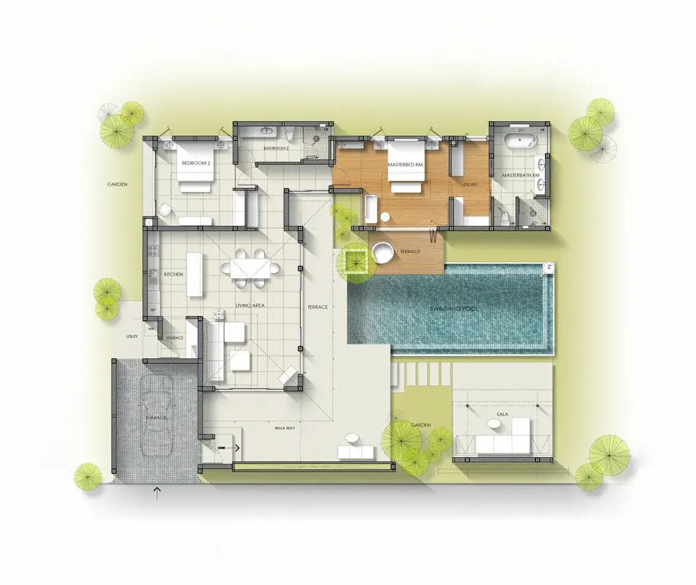 Ежемесячное личное обслуживание виллы абсолютно доступно и рассчитывается по индивидуальным счетчикам: электричество стоит 5 бат за киловатт, а вода — 50 бат за кубометр воды. Дополнительные персонализированные услуги (клининг, скоростной интернет или услуги садовника) определяются строго индивидуально.