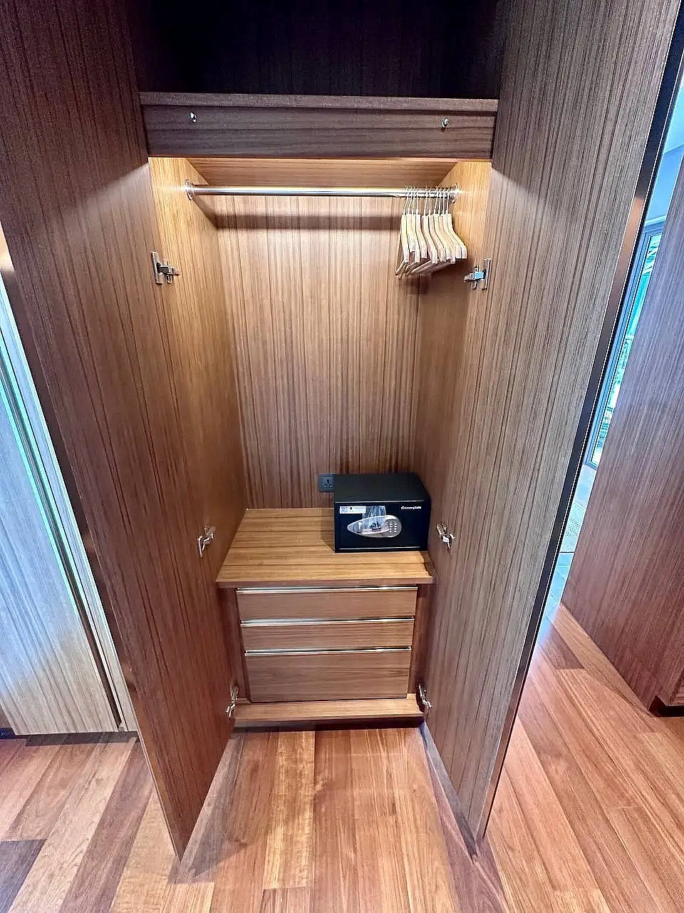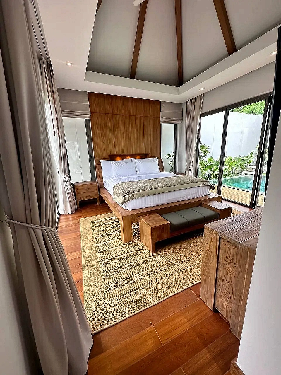 - Интерьеры из тикового дерева, плотные шторы блэкаут