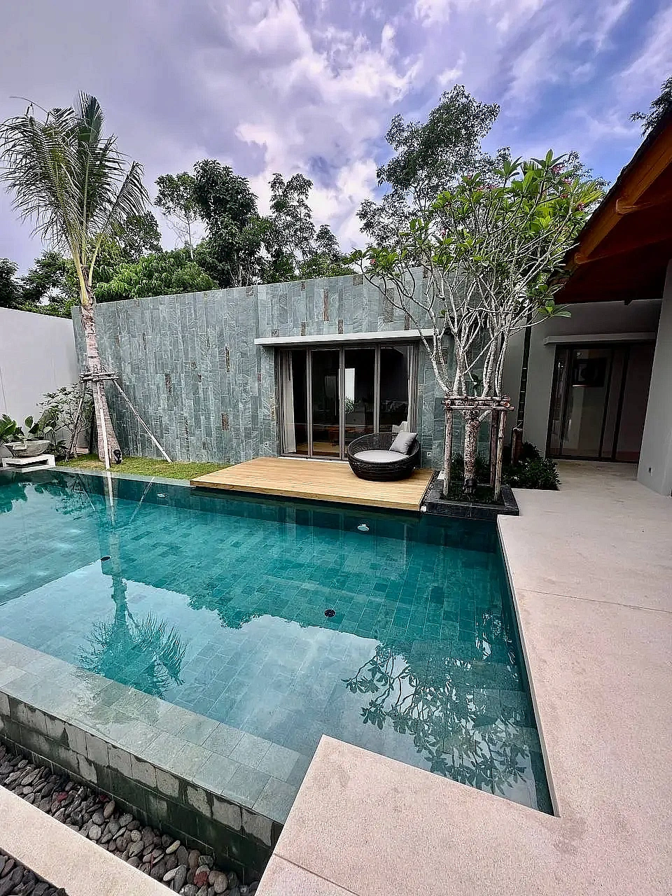- Частный бассейн с лаунж-зоной и продуманным освещением