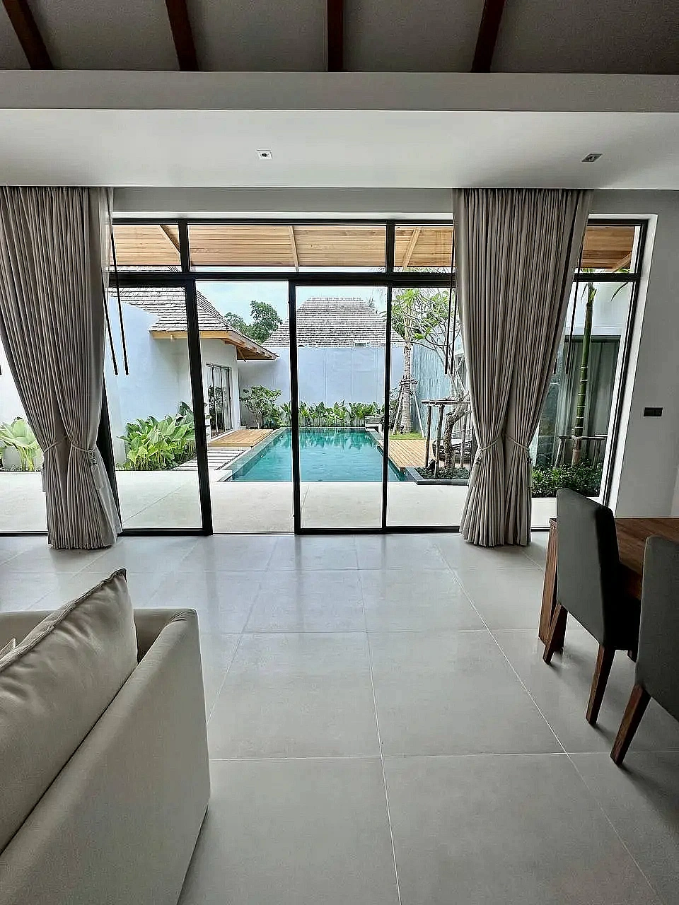 - Гостиная с панорамными раздвижными дверями и прямым выходом к бассейну