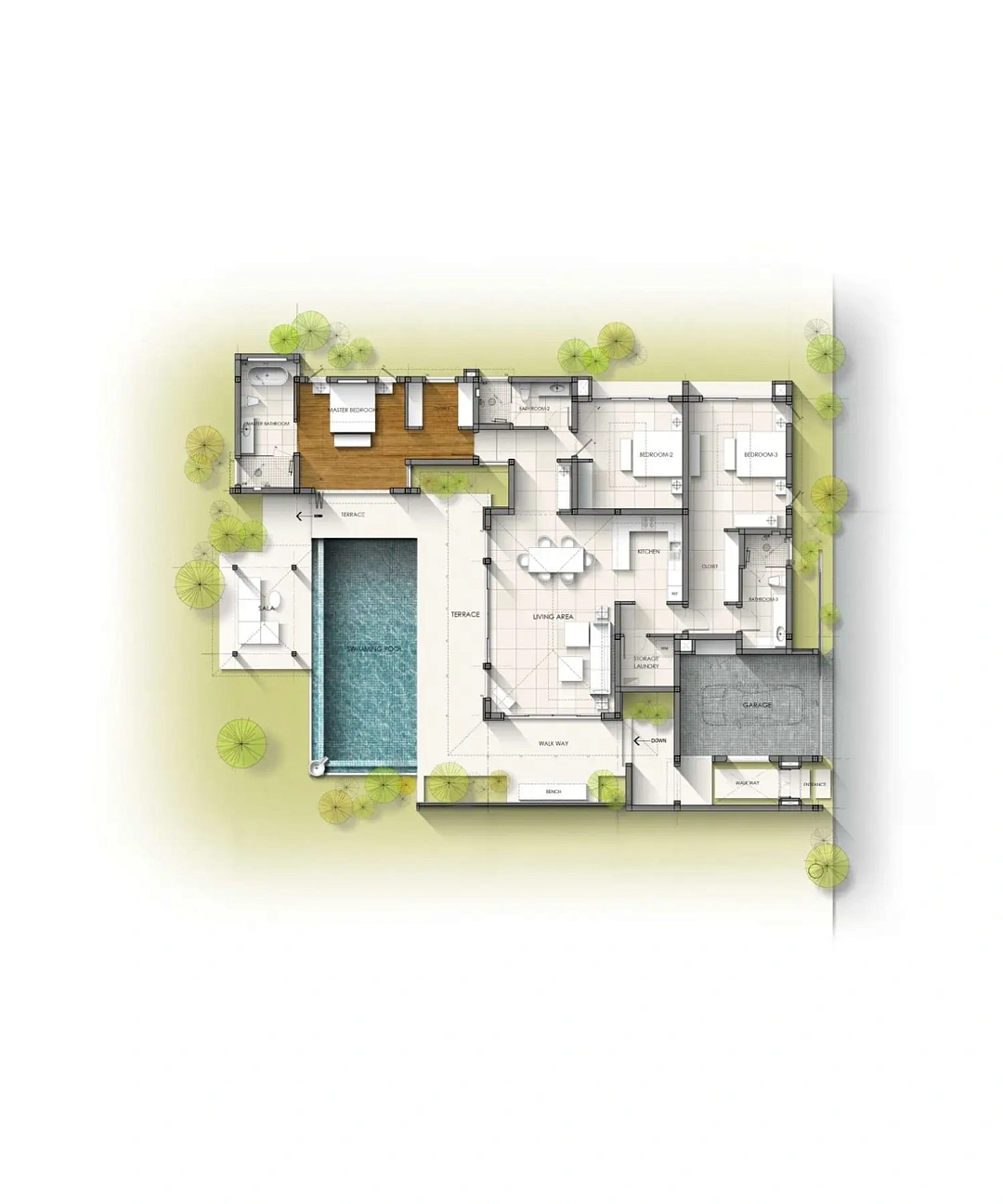- Типы вилл: 3-спальные (354 м²) и 4-спальные (548 м²) с частными бассейнами, тропическими садами и парковкой