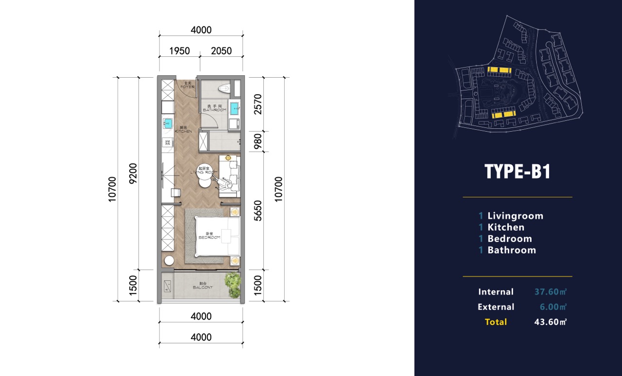 Ayana Heights Seaview Residence — апартаменты с 1 спальней (тип B1), 43,6 м²