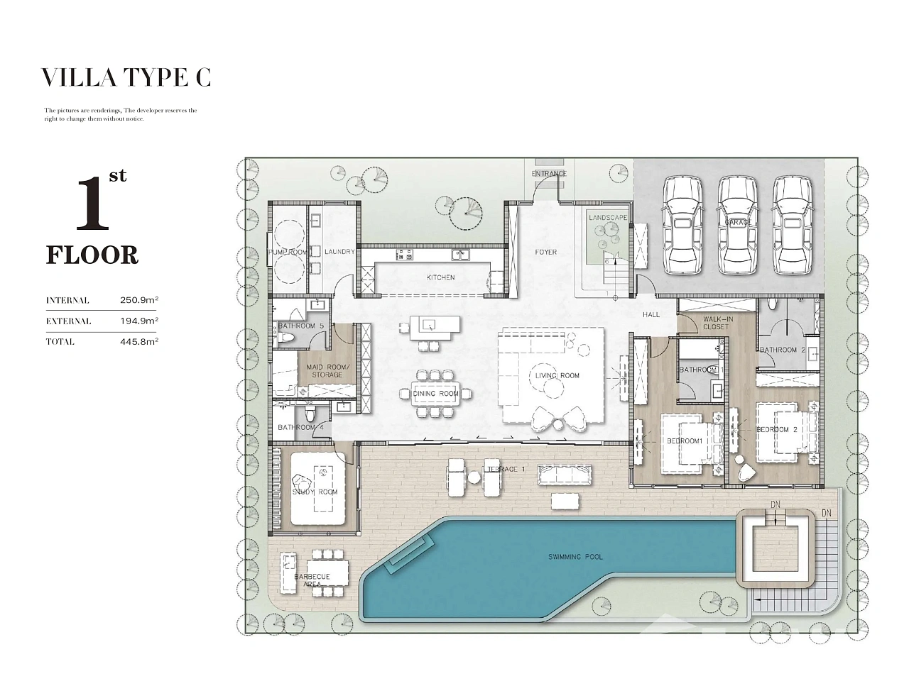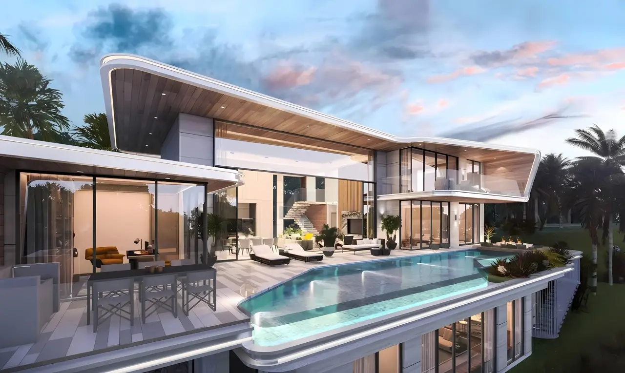 - Типы вилл: 3–5 спальни (от 351 до 691 м²) с частными бассейнами, садами и гаражами на 2–3 автомобиля