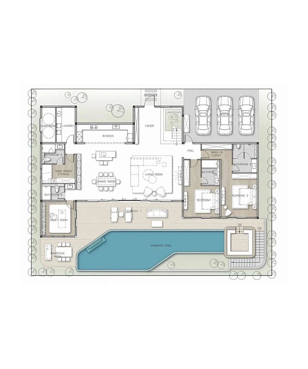 - Типы вилл: 3–5 спальни (от 351 до 691 м²) с частными бассейнами, садами и гаражами на 2–3 автомобиля