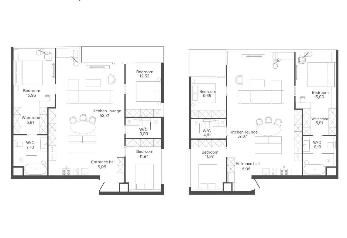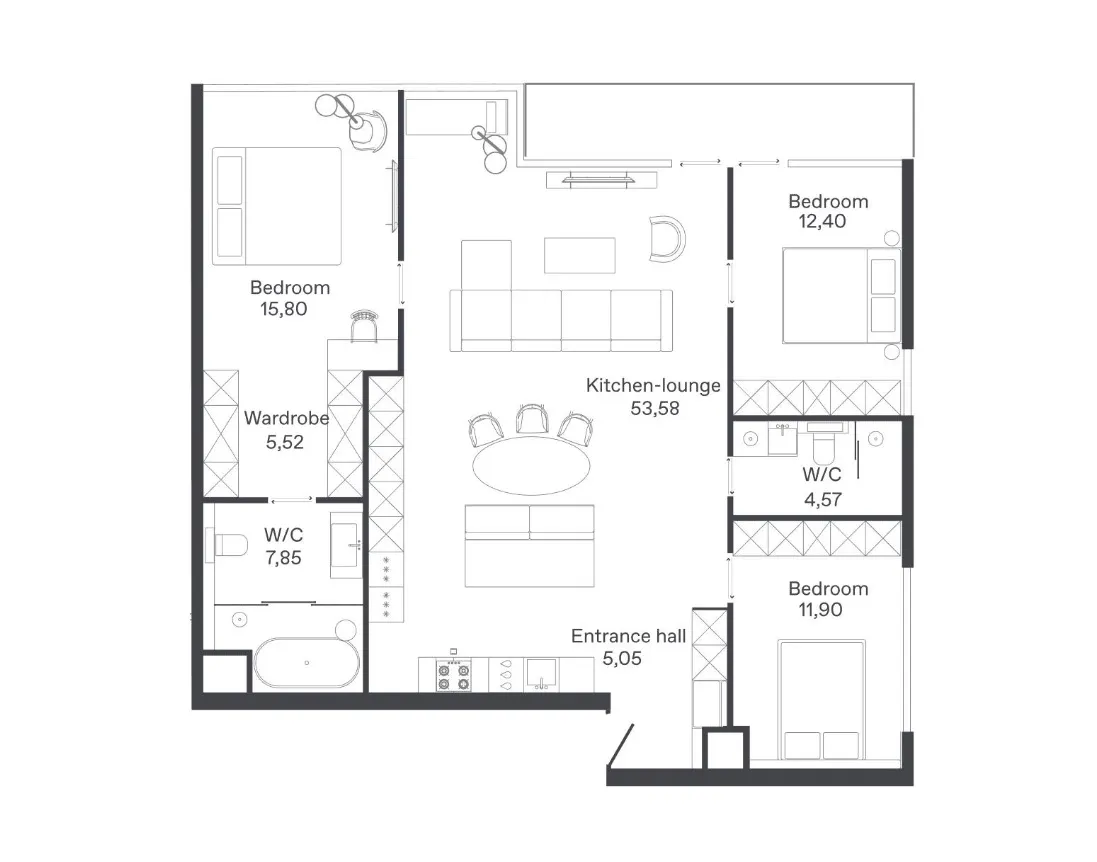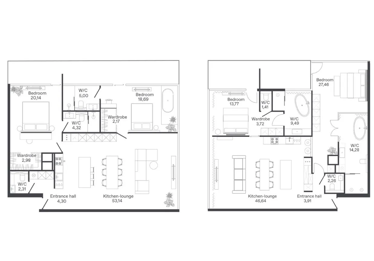 - Кухонные зоны с полным оснащением: варочные панели, духовые шкафы, посудомоечные машины