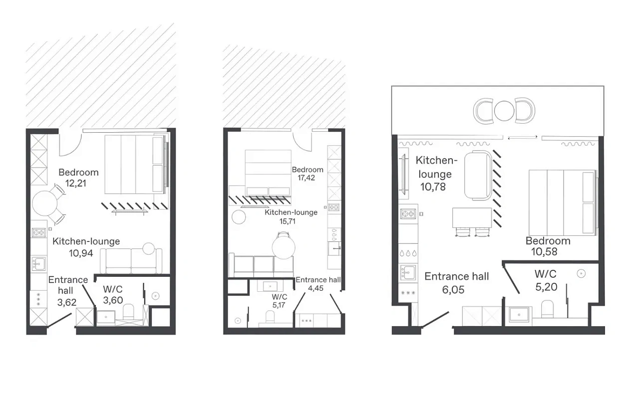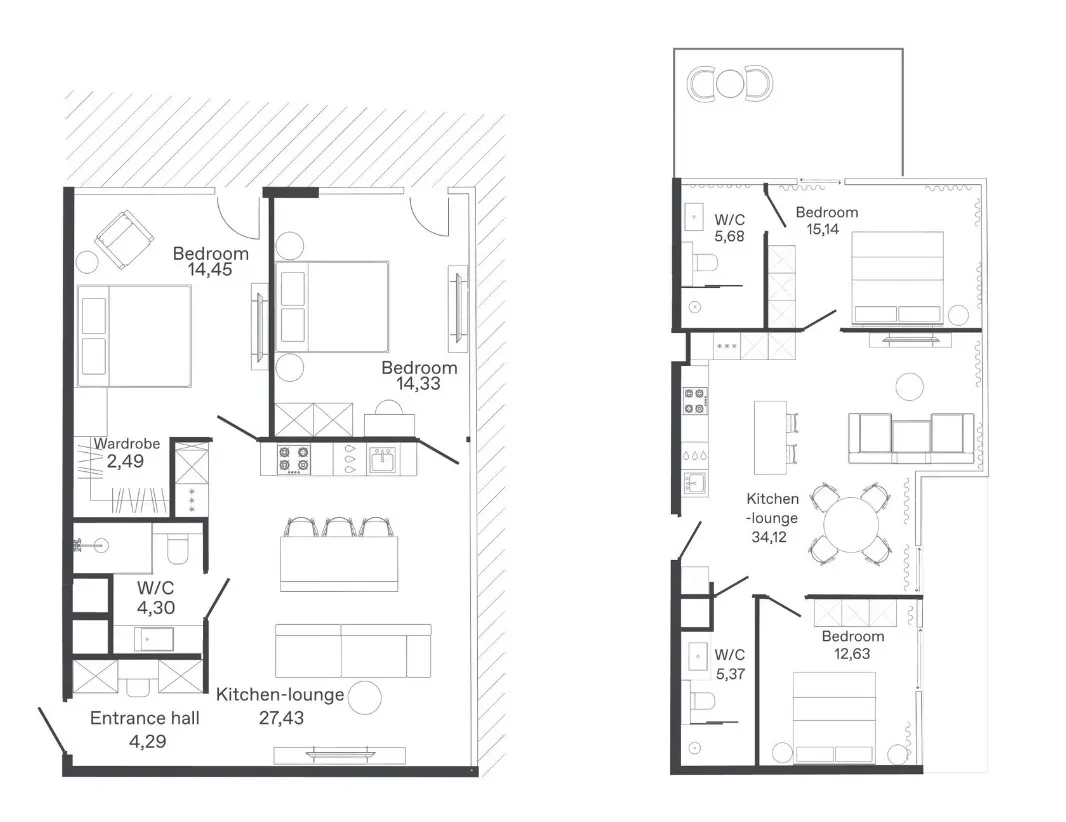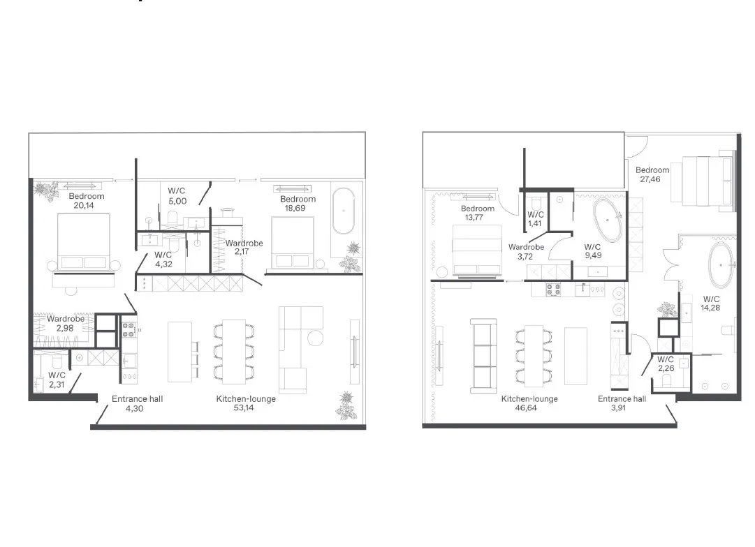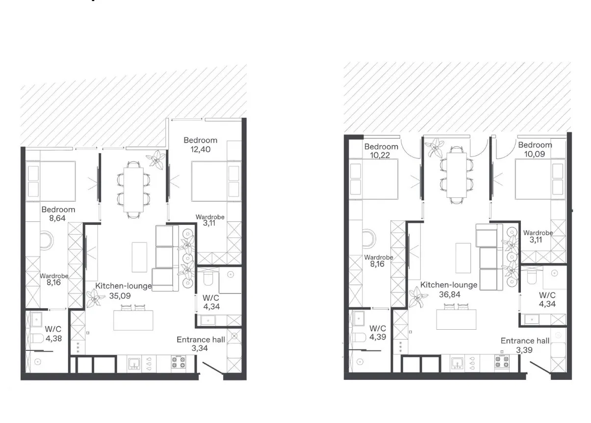 - Кухонные зоны с полным оснащением: варочные панели, духовые шкафы, посудомоечные машины
