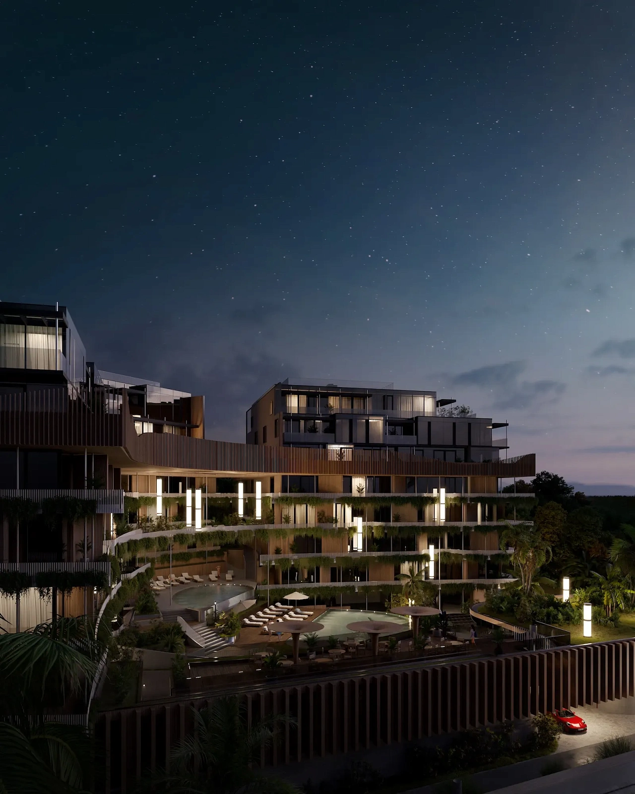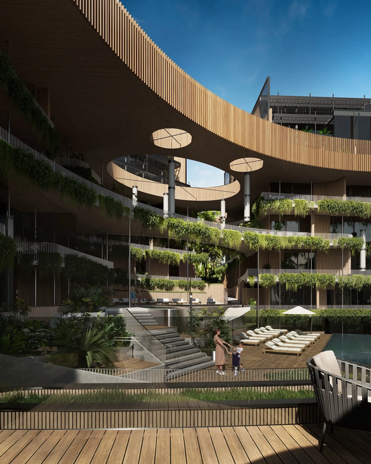 - Архитектурная оригинальность: Три башни в стиле сталактитов, соединенные зелеными мостами, отражают природные формы и гармонию с бамбуковым лесом.