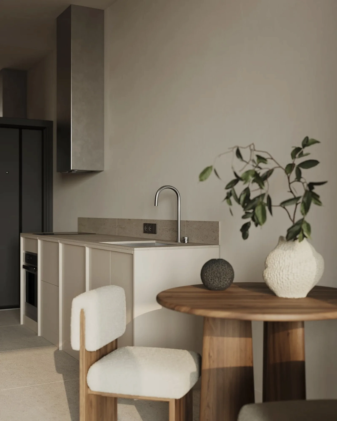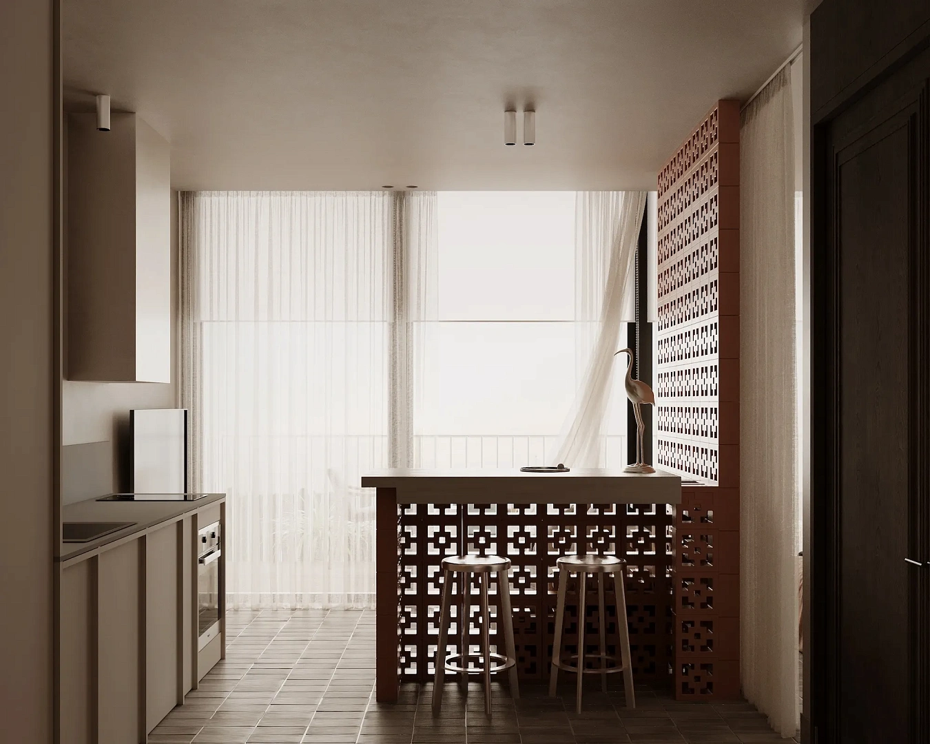 - Встроенная кухня с базовой техникой (плита и вытяжка)